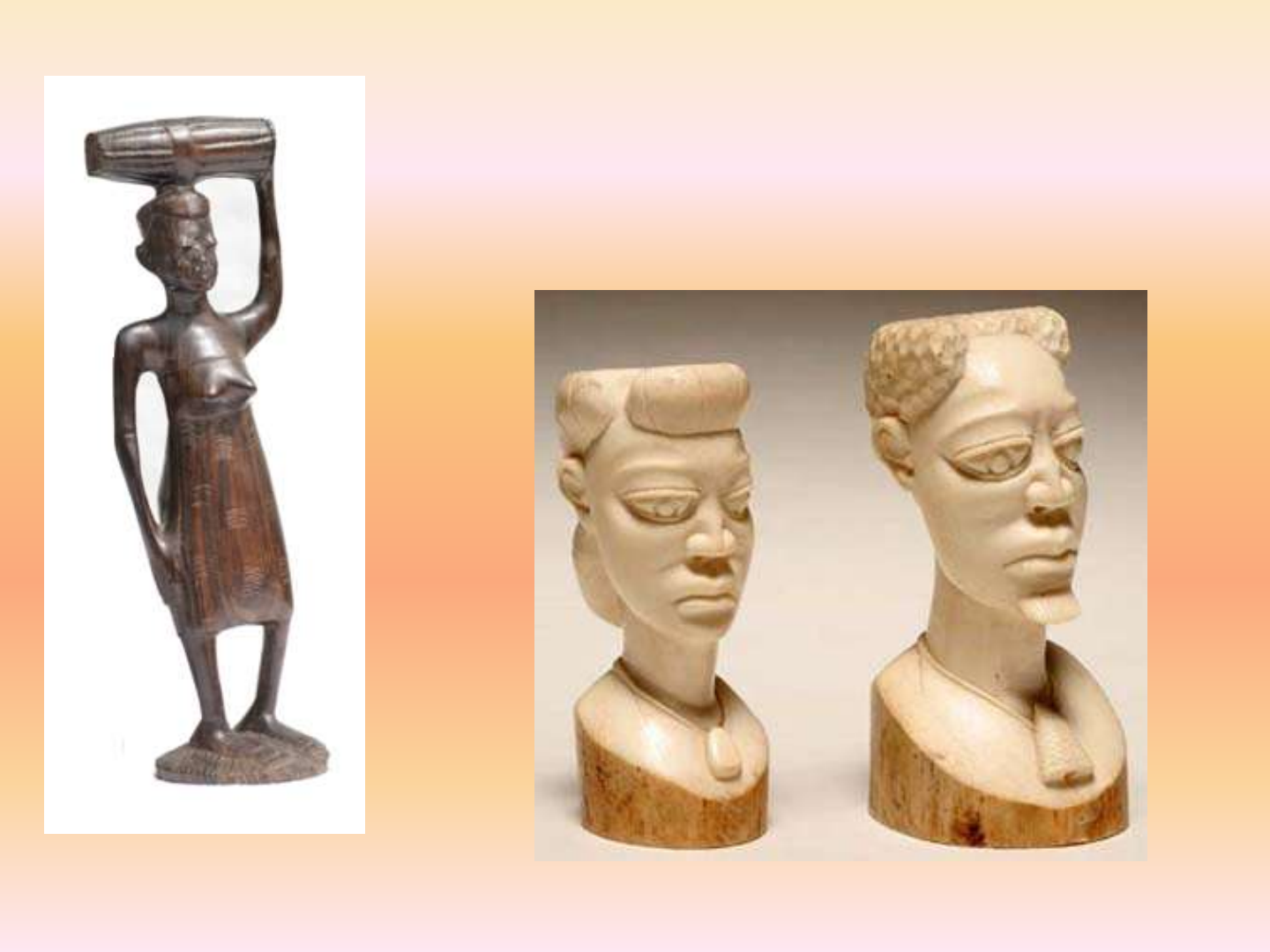 <p>ARTE AFRICANA</p><p>Imaginem ir a um lugar onde</p><p>possamos ver milhares de relevos e</p><p>pinturas como estas da imagem?</p><p>Este lugar se encontra no coração do</p><p>deserto do Saara, na Argélia: a</p><p>Meseta de Tassili.</p><p>Nesta região já foram catalogadas</p><p>mais de 15.000 pinturas e gravuras</p><p>rupestres que datam de 10.000 a</p><p>1.500 anos antes de Cristo!</p><p>Arte Rupestre: Namíbia- Kunene</p><p>Cultura Nok (norte da Nigéria).</p><p>Os povos africanos faziam seus objetos de arte utilizando diversos</p><p>elementos da natureza. Faziam esculturas de marfim, máscaras</p><p>entalhadas em madeira e ornamentos em ouro e bronze. Os temas</p><p>retratados nas obras de arte remetem ao cotidiano, a religião e aos</p><p>aspectos naturais da região. Desta forma, esculpiam e pintavam</p><p>mitos, animais da floresta, cenas das tradições, personagens do</p><p>cotidiano etc.</p><p>http://www.suapesquisa.com/o_que_e/marfim.htm</p><p>Alguns objetos de uso ritual</p><p>e uso cotidiano.</p><p>//upload.wikimedia.org/wikipedia/commons/c/c3/African_culture.jpg</p><p>//upload.wikimedia.org/wikipedia/commons/c/c3/African_culture.jpg</p><p>Esculturas em madeira:</p><p>Múltiplas figuras que servem de homenagem às divindades; podem ter</p><p>formas zoomorfas ou antropomorfas; geralmente fazem referência à</p><p>religião ou aos aspectos místicos da cultura de cada povo.</p><p>Marfim e madeira</p><p>Escultura povo Makonde Escultura do povo Godon</p><p>//upload.wikimedia.org/wikipedia/commons/f/f9/Dogon_sculpture_Louvre_70-1999-9-2.jpg</p><p>//upload.wikimedia.org/wikipedia/commons/f/f9/Dogon_sculpture_Louvre_70-1999-9-2.jpg</p><p>Danças</p><p>Nas danças africanas o contato</p><p>contínuo dos pés nus com a terra é</p><p>fundamental para absorver as</p><p>energias que deste lugar se</p><p>propagam e para enfatizar a vida que</p><p>tem que ser vivida agora e nesse</p><p>lugar.</p><p>Dança tribal</p><p>Lundu, Batuque</p><p>Capoeira</p><p>Jongo</p><p>Algumas</p><p>influências das</p><p>danças e lutas</p><p>africanas na</p><p>cultura</p><p>brasileira.</p><p>Artesanato: Tecidos e tapeçaria</p><p>O tipo de confecção mais característico é o chamado Kente, entre os Ashanti.</p><p>Os desenhos são imersos em uma tintura vegetal e impressos em tecido</p><p>branco estendido em uma almofada.</p><p>Influência da arte</p><p>africana na arte</p><p>européia:</p><p>PABLO PICASSO</p><p>Quadro “Les</p><p>Demoiselles</p><p>d'Avignon”, que marca</p><p>uma ruptura na arte</p><p>da época, inaugurando</p><p>a arte moderna.</p><p>Influências da Arte Africana</p><p>Pablo Picasso</p><p>Máscaras</p><p>As máscaras africanas geralmente representam divindades, seres</p><p>da mitologia.</p><p>Possuem aspecto agressivo, são marcadas por linhas e formas</p><p>geométricas, ou seja, não são naturalistas.</p><p>Há também o exagero de algumas formas (olhos, boca, nariz),</p><p>conferindo às máscaras este aspecto mais “pesado”, diferenciando</p><p>das formas naturais do homem.</p><p>Normalmente são usadas cores fortes, vibrantes.</p><p>Assim como na arte indígena, as máscaras podem ser</p><p>confeccionadas em uma grande variedade de materiais: bronze,</p><p>marfim, madeira, fibras, tecido, cerâmica, dentre outros.</p><p>As “máscaras” são as formas mais conhecidas da plástica africana. Constituem</p><p>síntese de elementos simbólicos mais variados se convertendo em expressões</p><p>da vontade criadora do africano.</p><p>Máscara Guelideé ou Gelede</p><p>Uma máscara é um ser que protege quem a carrega. Está destinada a captar</p><p>a força vital que escapa de um ser controlada e posteriormente</p><p>redistribuída em benefício da coletividade.</p><p>Máscara do século XVI, Nigéria,</p><p>Edo, Corte de Benin, marfim</p>