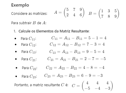 <p>Exemplo Considere as matrizes: A Para B de A: 1. Calcule os Elementos da Matriz Resultante: Para C11: C11 = - 4 Para C12: C12 = A12 - B12 = 7 3 = 4 Para C13: C13 = A13 - B13 = 9 - 5 = 4 Para C21: C21 = A21 - = 2 7 -5 Para C22: C22 = A22 - B22 = 4 - 8 = -4 Para C23: C23 = A23 - B23 = 6 - 9 -3 Portanto, a matriz resultante = 4</p>
