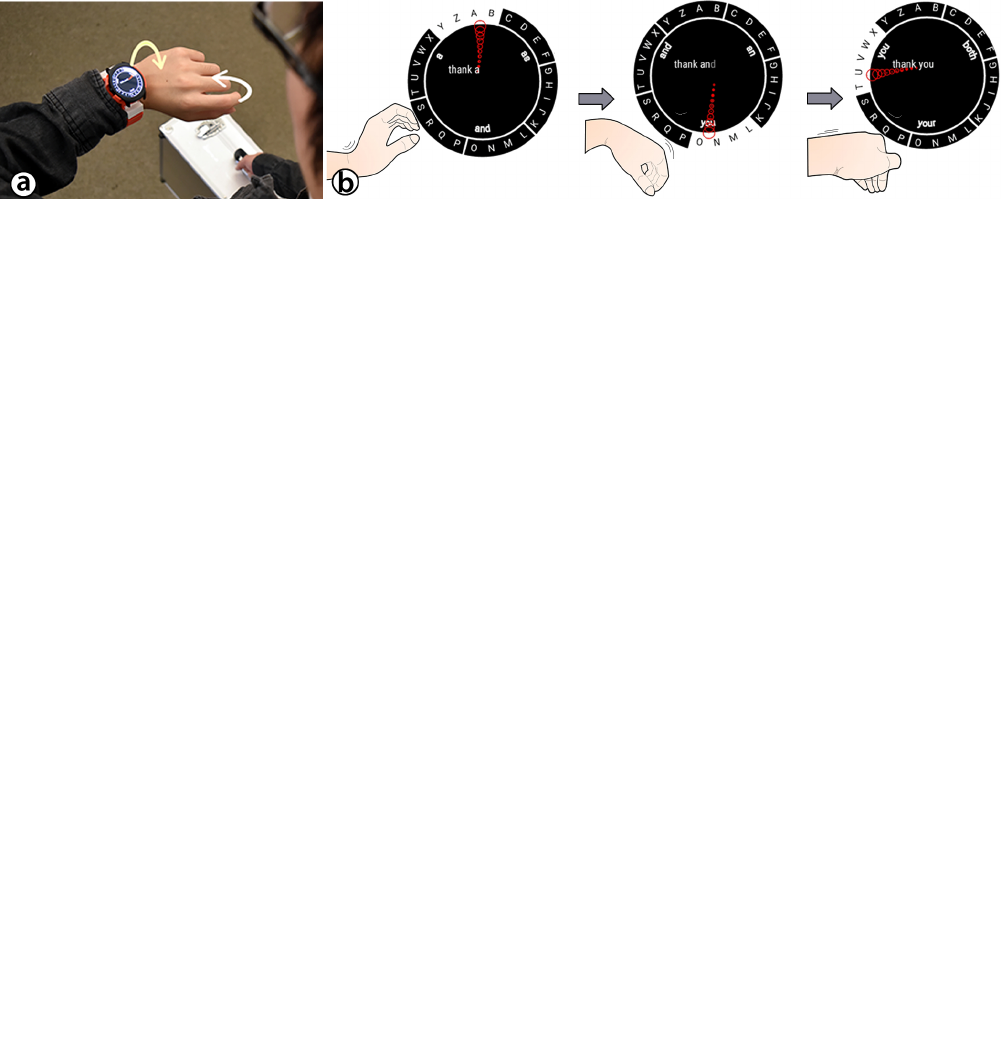 <p>WrisText: One-handed Text Entry on Smartwatch using</p><p>Wrist Gestures</p><p>Jun Gong1, Zheer Xu1,2, Qifan Guo1,3, Teddy Seyed4, Xiang ‘Anthony’ Chen5, Xiaojun Bi6,</p><p>Xing-Dong Yang1</p><p>Dartmouth College1, Shanghai Jiao Tong University2, University of Science and Technology of China3,</p><p>University of Calgary4, Carnegie Mellon University5, Stony Brook University6</p><p>{jun.gong.gr; xing-dong.yang}@dartmouth.edu, zheerxu@outlook.com, guoqifan@mail.ustc.edu.cn,</p><p>xiangchen@acm.org, teddy.seyed@ucalgary.ca, xiaojun@cs.stonybrook.edu</p><p>Figure 1. (a) One-handed text entry on a smartwatch by whirling the wrist; (b) to enter “you”, a user selects [YZAB] [ONML]</p><p> [TUVWX] by striking the wrist N S W. The entered text and suggested auto-complete are shown on the screen.</p><p>ABSTRACT</p><p>We present WrisText - a one-handed text entry technique</p><p>for smartwatches using the joystick-like motion of the</p><p>wrist. A user enters text by whirling the wrist of the watch</p><p>hand, towards six directions which each represent a key in</p><p>a circular keyboard, and where the letters are distributed in</p><p>an alphabetical order. The design of WrisText was an</p><p>iterative process, where we first conducted a study to</p><p>investigate optimal key size, and found that keys needed to</p><p>be 55º or wider to achieve over 90% striking accuracy. We</p><p>then computed an optimal keyboard layout, considering a</p><p>joint optimization problem of striking accuracy, striking</p><p>comfort, word disambiguation. We evaluated the</p><p>performance of WrisText through a five-day study with 10</p><p>participants in two text entry scenarios: hand-up and hand-</p><p>down. On average, participants achieved a text entry speed</p><p>of 9.9 WPM across all sessions, and were able to type as</p><p>fast as 15.2 WPM by the end of the last day.</p><p>Author Keywords</p><p>Smartwatch; text entry; one-handed input;</p><p>ACM Classification Keywords</p><p>H.5.2 [Information interfaces and presentation]: User</p><p>Interfaces. - Graphical user interfaces.</p><p>INTRODUCTION</p><p>Text entry is a common and important task in daily mobile</p><p>life [7], comprising of approximately 40% of mobile</p><p>activity [10]. However, entering text on a smartwatch is</p><p>challenging because of the small form factor and its</p><p>wearable context. One of the most commonly observed</p><p>problems is the need to use one or both hands for a task</p><p>(e.g. driving or walking while holding an umbrella or</p><p>shopping bags). This is cumbersome in the context of</p><p>smartwatches, as a user is required to interrupt their</p><p>ongoing task to enter text, which reduces the</p><p>purposefulness of smartwatches, as they are predominantly</p><p>valuable for accessing information while on-the-go.</p><p>To mitigate this problem, one solution is speech input,</p><p>which is socially inappropriate in some situations (e.g., at</p><p>meetings or classrooms) [61], and may also expose the</p><p>users’ privacy. Another solution is to enable one-handed</p><p>interaction for smartwatches using the same-side hand</p><p>(SSH) [31]. However, prior work has primarily been</p><p>targeted at general interactions, such as assigning discrete</p><p>commands to micro-interactions [36, 58], finger postures</p><p>[16, 46, 63], continuous gestural input [19, 51]. One-</p><p>handed text entry has been largely overlooked.</p><p>In this paper, we present WrisText, a one-handed text entry</p><p>technique for smartwatches using the wrist’s joystick-like</p><p>motion [19] (Figure 1). With it, a user whirls the wrist of</p><p>the same-side hand to strike directional marks to select</p><p>keys on a circular keyboard on a smartwatch. To explore</p><p>the design space of this new text entry technique, we took</p><p>an iterative design approach, where we optimized the</p><p>keyboard layout based on a number of factors, including</p><p>keyboard learnability, striking accuracy, word</p><p>disambiguation, and striking comfort. We first conducted a</p><p>Permission to make digital or hard copies of all or part of this work for</p><p>personal or classroom use is granted without fee provided that copies are</p><p>not made or distributed for profit or commercial advantage and that copies</p><p>bear this notice and the full citation on the first page. Copyrights for</p><p>components of this work owned by others than ACM must be honored.</p><p>Abstracting with credit is permitted. To copy otherwise, or republish, to</p><p>post on servers or to redistribute to lists, requires prior specific permission</p><p>and/or a fee. Request permissions from Permissions@acm.org.</p><p>CHI 2018, April 21–26, 2018, Montreal, QC, Canada</p><p>© 2018 Association for Computing Machinery.</p><p>ACM ISBN 978-1-4503-5620-6/18/04…$15.00</p><p>https://doi.org/10.1145/3173574.3173755</p><p>CHI 2018 Honourable Mention CHI 2018, April 21–26, 2018, Montréal, QC, Canada</p><p>Paper 181 Page 1</p><p>target acquisition task to determine the proper size of the</p><p>arc-shaped keyboard keys (e.g., 55.4˚). Based on the result,</p><p>we designed a keyboard layout with six keys, containing</p><p>groups of four to five English letters following an</p><p>alphabetical order (Figure 1). Next, we performed a step-</p><p>wise search for optimal layout variations, and identify one</p><p>that balances striking accuracy, striking comfort, and word</p><p>disambiguation (Figure 1). Finally, we conducted a 5-day</p><p>study with ten participants to evaluate the speed and</p><p>accuracy of WrisText in common smartwatch usage</p><p>scenarios, such as holding the smartwatch in front of the</p><p>chest and placing the hand downwards, alongside the body.</p><p>Our results revealed that participants could achieve an</p><p>average of 15.2 (s.e. = 0.5) WPM in the fifth day with 0.1%</p><p>uncorrected errors. Extending the study by three more days</p><p>with two randomly picked particip