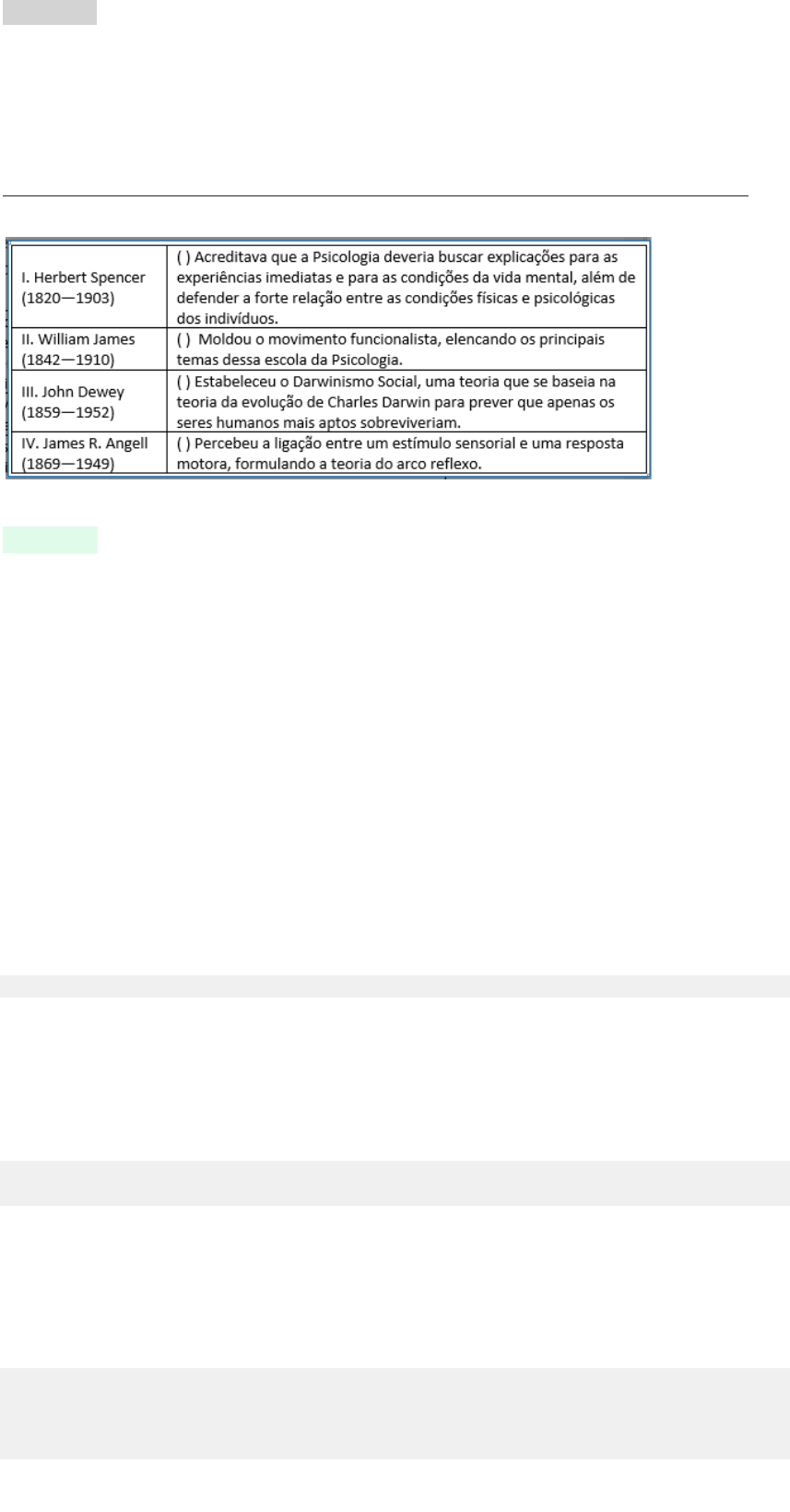 <p>UNIDADE 1</p><p>Para que o Funcionalismo pudesse existir enquanto uma escola de pensamento da</p><p>Psicologia, foram necessárias algumas influências, já que uma nova teoria nunca surge</p><p>do nada, mas sim vai se moldando em paralelo às teorias em voga no momento.</p><p>Assim, diferentes autores e pesquisadores foram essenciais para o estabelecimento</p><p>dessa escola, cada um com diferentes contribuições e métodos de análise.</p><p>Considerando essas influências, relacione os pesquisadores elencados a seguir em</p><p>relação à contribuição dada por cada um deles.</p><p>Agora, assinale a opção que apresenta a sequência correta.</p><p>II, IV, I e III.</p><p>Apesar de hoje ser vista como uma das escolas de pensamentos que deram origem</p><p>à Psicologia Moderna, originalmente o Funcionalismo tinha apenas a intenção de</p><p>combater as escolas de Wundt e de Titchener, vigentes na época. No entanto,</p><p>conforme os pesquisadores foram estabelecendo suas teorias, as ideias passaram a</p><p>ser delineadas de maneira a formar uma nova escola de pensamento.</p><p>Considerando os estudos propostos pelo Funcionalismo, analise as afirmativas a</p><p>seguir.</p><p>I) A Psicologia deve descobrir sob quais condições e de que forma ocorrem os</p><p>processos mentais.</p><p>II) A aprendizagem é uma conexão entre o estímulo apresentado e a resposta.</p><p>III) É função da consciência estabelecer mediação entre as necessidades do organismo</p><p>e o que é disponibilizado pelo ambiente.</p><p>IV) Os elementos mentais são organizados pelo processo de apercepção.</p><p>V) Analisa as relações entre mente, corpo e ambiente.</p><p>Agora, assinale a opção que apresenta ideias propostas pelo Funcionalismo.</p><p>Apenas as afirmativas I, III e V.</p><p>O britânico Edward B. Titchener fundou o estruturalismo com base nas ideias de Wundt,</p><p>apesar de formar uma escola diferente da Psicologia Experimental de seu mestre. Para</p><p>Titchener, era papel da Psicologia descobrir a natureza das experiências conscientes</p><p>elementares, ou seja, para o britânico, mais do que entender os processos cognitivos, era</p><p>necessário compreender as partes que constituíam tais processos. Para isso, Titchener:</p><p>Realizava diferentes experimentos em que os participantes deveriam anotar e relatar suas</p><p>sensações ao realizar determinadas ações.</p><p>A Psicologia se constitui de muitas visões sobre o homem e o mundo. O que liga todas essas</p><p>visões é a história dessa ciência. Esse estudo tem início nos primórdios da Filosofia, com as</p><p>pesquisas e reflexões de filósofos como Platão e Aristóteles. Considerando a origem dessa</p><p>ciência e a forma como se desenvolveu, qual é a importância de estudar o histórico dessa (ou</p><p>de qualquer outra) disciplina? Que aspectos dessa análise podem ser úteis ou proveitosos?</p><p>É apenas por meio da exploração das origens da Psicologia e do estudo do seu</p><p>desenvolvimento que se faz possível ter uma visão clara da natureza da Psicologia atual.</p><p>Conhecer a história de uma ciência organiza a desordem, coloca o passado em perspectiva e</p><p>atribui significado ao todo que parece um caos, explicando o presente.</p><p>Leia atentamente o trecho a seguir:</p><p>“A mente tem suas próprias regras de funcionamento e todas elas podem ser</p><p>expressas em uma ideia: nossa capacidade de refletir se baseia em algum tipo de</p><p>associação mental.</p><p>Existe algum tipo de conexão entre diferentes ideias criadas pela mente. Nesse</p><p>sentido, existem diferentes conexões:</p><p>1) a semelhança (unimos mentalmente impressões e ideias similares);</p><p>2) a contiguidade (conectamos elementos distintos de maneira temporária ou</p><p>espacial);</p><p>3) a causa-efeito (nossa mente conecta ideias a partir da relação necessária entre uma</p><p>causa e seu efeito).”</p><p>(ASSOCIACIONISMO - Conceito, o que é, significado. Conceitos.com. Disponível em:</p><p>https://conceitos.com/associacionismo/. Acesso em: 15 mar. 2019.)</p><p>O associacionismo teve entre seus pesquisadores de destaque Edward Lee Thorndike</p><p>(1874-1949) e Ivan Petrovitch Pavlov (1849—1936). Analise as afirmativas a seguir a</p><p>respeito desses pesquisadores e das ideias apresentadas por eles.</p><p>I) Para Thorndike, a aprendizagem podia ser entendida como o estabelecimento de</p><p>conexões entre o estímulo apresentado e a resposta.</p><p>II) A fim de postular sua teoria sobre o reflexo condicionado, Pavlov realizou</p><p>experiências com cães, analisando a salivação desses animais a partir de diferentes</p><p>estímulos.</p><p>III) Thorndike direcionou seus estudos para a experiência consciente e para os</p><p>elementos mentais, como fizeram muitos antes dele.</p><p>IV) Para Pavlov, os estímulos que recebemos geram sempre as mesmas respostas, o</p><p>que nos torna incapazes de aprender novas maneiras de responder aos mesmos</p><p>estímulos.</p><p>Agora, assinale a opção correta.</p><p>Apenas as afirmativas I e II estão corretas.</p><p>Como pode ser observado ao estudar as origens da Psicologia, essa ciência surgiu</p><p>a partir de experiências pessoais e de eventos sociais, tentando compreender, a partir</p><p>de diferentes ângulos, o comportamento e os processos mentais. Durante os</p><p>primeiros anos da Psicologia Experimental, essa tentativa de compreensão a partir de</p><p>posições distintas deu origem ao Estruturalismo, ao Funcionalismo e ao</p><p>Associacionismo. Apesar da pouca expressão dessas escolas na atualidade, diversas</p><p>abordagens utilizadas hoje têm suas bases nessas três linhas.</p><p>Assim, faz-se importante reconhecer o que era postulado por essas escolas. Relacione,</p><p>então, cada escola a seus postulados.</p><p>II, III e I.</p><p>A partir da análise do surgimento, dos primórdios e da história da Psicologia, é</p><p>possível perceber que seu ob