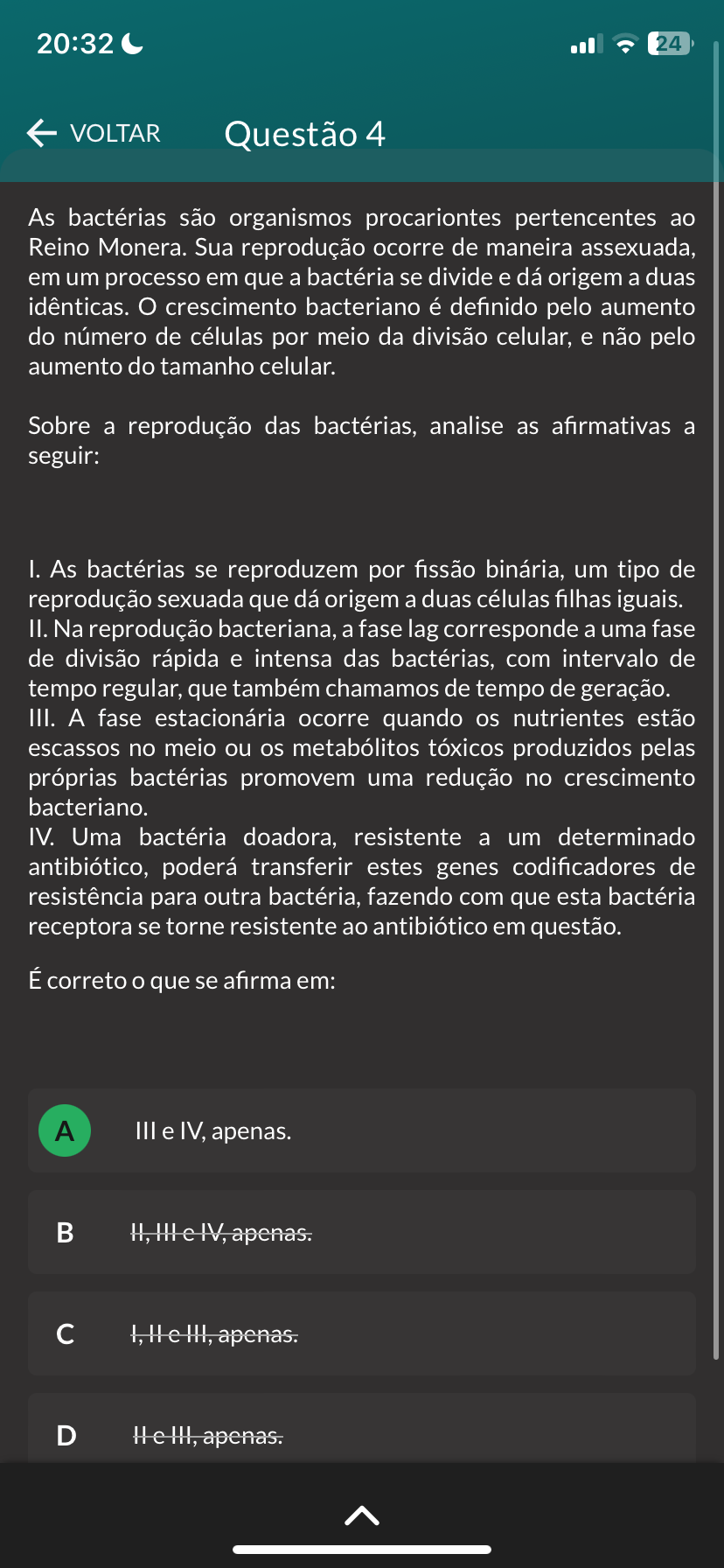 <p>20:32 C 24 VOLTAR Questão 4 As bactérias são organismos procariontes pertencentes ao Reino Monera. Sua reprodução ocorre de maneira assexuada, em um processo em que a bactéria se divide e dá origem a duas idênticas. O crescimento bacteriano é definido pelo aumento do número de células por meio da divisão celular, e não pelo aumento do tamanho celular. Sobre a reprodução das bactérias, analise as afirmativas a seguir: I. As bactérias se reproduzem por fissão binária, um tipo de reprodução sexuada que dá origem a duas células filhas iguais. II. Na reprodução bacteriana, a fase lag corresponde a uma fase de divisão rápida e intensa das bactérias, com intervalo de tempo regular, que também chamamos de tempo de geração. III. A fase estacionária ocorre quando os nutrientes estão escassos no meio ou os metabólitos tóxicos produzidos pelas próprias bactérias promovem uma redução no crescimento bacteriano. IV. Uma bactéria doadora, resistente a um determinado antibiótico, poderá transferir estes genes codificadores de resistência para outra bactéria, fazendo com que esta bactéria receptora se torne resistente ao antibiótico em questão. É correto O que se afirma em: A III e IV, apenas. B D apenas.</p>
