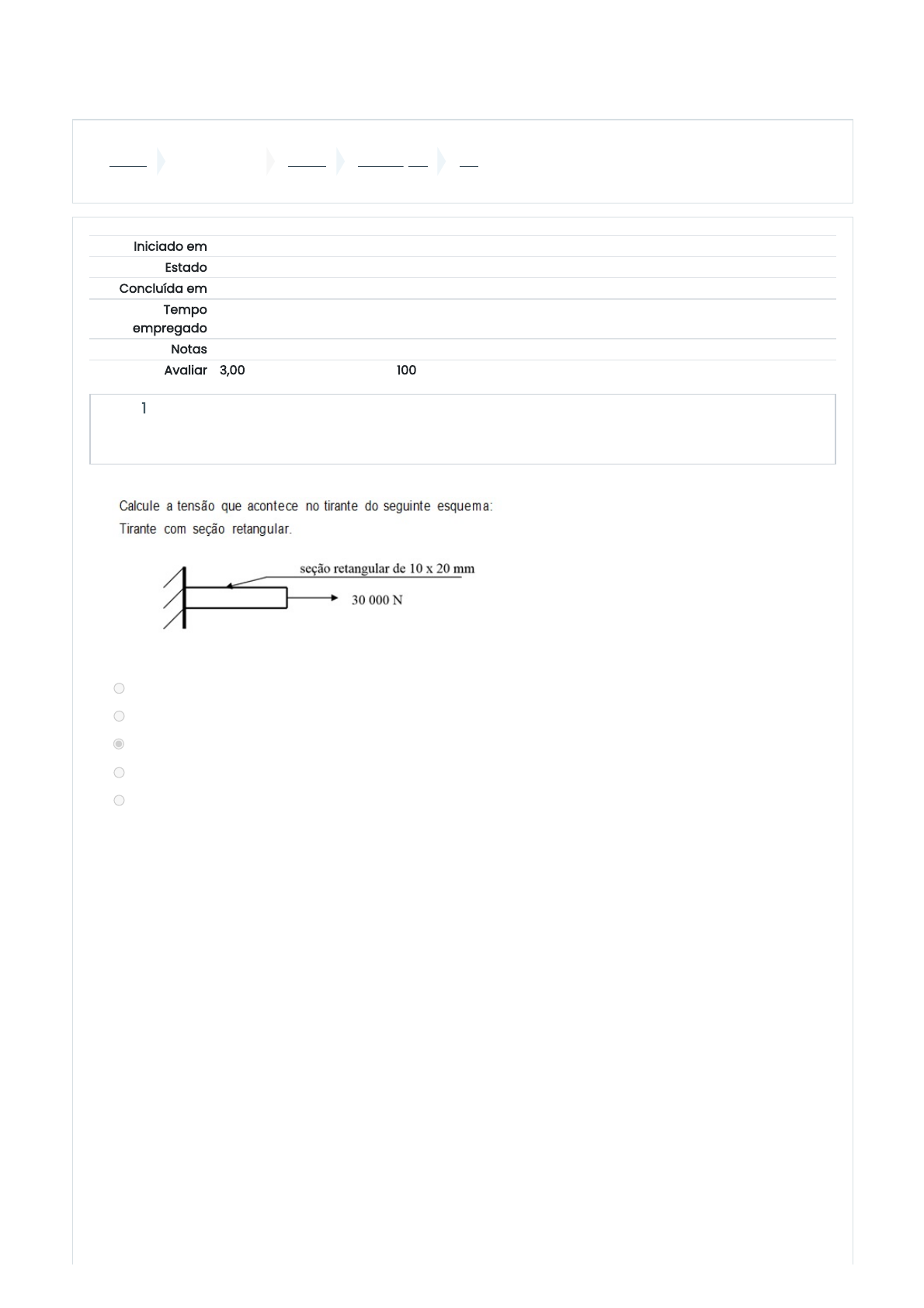 <p>09/05/2021 A1F: Revisão da tentativa</p><p>https://moodle.universo.edu.br/mod/quiz/review.php?attempt=144250&cmid=14464 1/8</p><p>Painel Meus cursos N178E1 AVALIAÇÃO A1F</p><p>Iniciado em terça, 4 mai 2021, 20:42</p><p>Estado Finalizada</p><p>Concluída em terça, 4 mai 2021, 22:08</p><p>Tempo</p><p>empregado</p><p>1 hora 25 minutos</p><p>Notas 10,00/10,00</p><p>Avaliar 3,00 de um máximo de 3,00(100%)</p><p>Questão 1</p><p>Correto</p><p>Atingiu 1,00 de 1,00</p><p>Escolha uma opção:</p><p>a. 200N/mm</p><p>b. Não há alternativa correta.</p><p>c. 150 N/mm </p><p>d. 150 KPa</p><p>e. 300 N/cm</p><p>2</p><p>2</p><p>2</p><p>Sua resposta está correta.</p><p>A resposta correta é: 150 N/mm .2</p><p>https://moodle.universo.edu.br/my/</p><p>https://moodle.universo.edu.br/course/view.php?id=1298</p><p>https://moodle.universo.edu.br/course/view.php?id=1298#section-3</p><p>https://moodle.universo.edu.br/mod/quiz/view.php?id=14464</p><p>09/05/2021 A1F: Revisão da tentativa</p><p>https://moodle.universo.edu.br/mod/quiz/review.php?attempt=144250&cmid=14464 2/8</p><p>Questão 2</p><p>Correto</p><p>Atingiu 1,00 de 1,00</p><p>Questão 3</p><p>Correto</p><p>Atingiu 1,00 de 1,00</p><p>Calcular o diâmetro de um tirante que sustente, com segurança, a carga descrita no esquema abaixo. O material do</p><p>tirante tem limite de escoamento a tração de 600 N / mm . Vamos utilizar 2 como coeficiente de segurança.</p><p>Escolha uma opção:</p><p>a. d = 12,52 mm</p><p>b. d = 1,52 mm</p><p>c. d = 6,52 mm </p><p>d. d = 3,52 mm</p><p>e. d = 6,00 mm</p><p>2</p><p>Sua resposta está correta.</p><p>A resposta correta é: d = 6,52 mm.</p><p>Escolha uma opção:</p><p>a. 63,69 N/mm </p><p>b. 63, 69 Pa</p><p>c. 70 GPa</p><p>d. 60 KPa</p><p>e. 70 Pa</p><p>2</p><p>Sua resposta está correta.</p><p>A resposta correta é: 63,69 N/mm .2</p><p>09/05/2021 A1F: Revisão da tentativa</p><p>https://moodle.universo.edu.br/mod/quiz/review.php?attempt=144250&cmid=14464 3/8</p><p>Questão 4</p><p>Correto</p><p>Atingiu 1,00 de 1,00</p><p>Questão 5</p><p>Correto</p><p>Atingiu 1,00 de 1,00</p><p>Calcular o diâmetro do tirante “1“ (sendo o diâmetro do tirante 1 igual ao do tirante 2) para que sustente, com</p><p>segurança, a carga descrita no esquema abaixo. O material do tirante tem limite de escoamento a tração de 600 N /</p><p>mm Vamos utilizar 4 como coeficiente de segurança.</p><p>Escolha uma opção:</p><p>a. d = 11,29 mm </p><p>b. d = 1129 mm</p><p>c. d = 1,129 mm</p><p>d. d = 18,00 mm</p><p>e. d = 112,9 mm</p><p>2</p><p>Sua resposta está correta.</p><p>A resposta correta é: d = 11,29 mm.</p><p>Um cabo de aço cujo diâmetro é de 12 mm, possui tensão de escoamento σ = 220 MPa sendo utilizado para içar um</p><p>equipamento. Sabendo-se que foi utilizado o coeficiente de segurança k = 4 para melhor utilização de uso (lembrar da</p><p>tensão admissível), calcule a carga máxima (força máxima) que este cabo pode içar nessas condições estabelecidas.</p><p>Escolha uma:</p><p>Escolha uma opção:</p><p>a. 6220,4 N </p><p>b. aproximadamente 3 toneladas</p><p>c. 624 N</p><p>d. 62,55KN</p><p>e. 362KN</p><p>e</p><p>Sua resposta está correta.</p><p>A resposta correta é: 6220,4 N.</p><p>09/05/2021 A1F: Revisão da tentativa</p><p>https://moodle.universo.edu.br/mod/quiz/review.php?attempt=144250&cmid=14464 4/8</p><p>Questão 6</p><p>Correto</p><p>Atingiu 1,00 de 1,00</p><p>Questão 7</p><p>Correto</p><p>Atingiu 1,00 de 1,00</p><p>Calcular o diâmetro de uma peça que trabalhe sob tração. O material dessa peça deve ter</p><p>tensão de escoamento à tração de 600 N/mm . A peça deve sustentar uma carga de 60.000 N</p><p>e utilizaremos coeficiente de segurança 2</p><p>Escolha uma opção:</p><p>a. 12,27 mm</p><p>b. 17,35 mm</p><p>c. 8,00 mm</p><p>d. 25,54 mm</p><p>e. 15,96 mm </p><p>2</p><p>Sua resposta está correta.</p><p>A resposta correta é: 15,96 mm.</p><p>Duas barras circulares maciças são soldadas no ponto B, como mostra a figura. Determine a tensão normal no ponto</p><p>médio de cada barra.</p><p>Escolha uma opção:</p><p>a. s = 95,5 MPa e s = 95,5 MPa</p><p>b. s = 95,5 MPa e s = 113,2 MPa </p><p>c. s = 113,2 MPa e s = 95,5 MPa</p><p>d. s = 100,2 MPa e s = 90,5 MPa</p><p>e. s = 113,2 MPa e s = 113,2 MPa</p><p>AB BC</p><p>AB BC</p><p>AB BC</p><p>AB BC</p><p>AB BC</p><p>Sua resposta está correta.</p><p>A resposta correta é: s = 95,5 MPa e s = 113,2 MPa.AB BC</p><p>09/05/2021 A1F: Revisão da tentativa</p><p>https://moodle.universo.edu.br/mod/quiz/review.php?attempt=144250&cmid=14464 5/8</p><p>Questão 8</p><p>Correto</p><p>Atingiu 1,00 de 1,00</p><p>A figura abaixo ilustra o resultado de um ensaio uniaxial de tração em uma barra metálica, estando plotado com as</p><p>forças e os alongamentos dos principais pontos de um corpo de prova com 10 mm de diâmetro e 100 mm de</p><p>comprimento inicial, que terminou com uma ruptura no meio do corpo, com um diâmetro médio de 6 mm.</p><p>A partir do resultado do ensaio, a tensão de ruptura, em MPa, é igual a:</p><p>Considere pi = = 3,14</p><p>Escolha uma opção:</p><p>a. 1800/pi</p><p>b. 240/pi</p><p>c. 480/pi</p><p>d. 2000/pi </p><p>e. 1120/pi</p><p>π</p><p>Sua resposta está correta.</p><p>A resposta correta é: 2000/pi.</p><p>09/05/2021 A1F: Revisão da tentativa</p><p>https://moodle.universo.edu.br/mod/quiz/review.php?attempt=144250&cmid=14464 6/8</p><p>Questão 9</p><p>Correto</p><p>Atingiu 1,00 de 1,00</p><p>A coluna está submetida a uma força axial de 8 kN no seu topo. Supondo que a seção transversal tenha as dimensões</p><p>mostradas na figura, determinar a tensão normal média que atua sobre a seção a-a.</p><p>Escolha uma opção:</p><p>a. 3,64 GPa</p><p>b. 182 KN</p><p>c. 1,82 x 10 KN</p><p>d. 18,2 Tf</p><p>e. 1,82 Mpa </p><p>-5</p><p>Sua resposta está correta.</p><p>A resposta correta é: 1,82 Mpa.</p><p>09/05/2021 A1F: Revisão da tentativa</p><p>https://moodle.universo.edu.br/mod/quiz/review.php?attempt=144250&cmid=