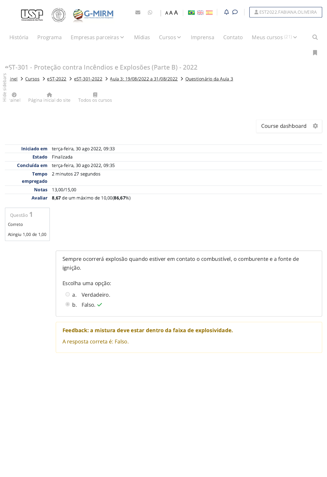 <p>História Programa Empresas parceiras⌄ Mídias Cursos⌄ Imprensa Contato Meus cursos ⌄(21) </p><p></p><p>eST-301 - Proteção contra Incêndios e Explosões (Parte B) - 2022</p><p>Painel › Cursos › eST-2022 › eST-301-2022 › Aula 3: 19/08/2022 a 31/08/2022 › Questionário da Aula 3</p><p></p><p>Painel</p><p></p><p>Página inicial do site</p><p></p><p>Todos os cursos</p><p>⚙</p><p>Questão 1</p><p>Correto</p><p>Atingiu 1,00 de 1,00</p><p>Course dashboard</p><p>Sempre ocorrerá explosão quando estiver em contato o combustível, o comburente e a fonte de</p><p>ignição.</p><p>Escolha uma opção:</p><p>a. Verdadeiro.</p><p>b. Falso. ✓</p><p>Feedback: a mistura deve estar dentro da faixa de explosividade.</p><p>A resposta correta é: Falso.</p><p>Iniciado em terça-feira, 30 ago 2022, 09:33</p><p>Estado Finalizada</p><p>Concluída em terça-feira, 30 ago 2022, 09:35</p><p>Tempo</p><p>empregado</p><p>2 minutos 27 segundos</p><p>Notas 13,00/15,00</p><p>Avaliar 8,67 de um máximo de 10,00(86,67%)</p><p> EST2022.FABIANA.OLIVEIRA A A A✉ </p><p>H</p><p>id</p><p>e</p><p>s</p><p>id</p><p>e</p><p>b</p><p>a</p><p>rs</p><p>https://gmirmusp.com.br/site/historia/</p><p>https://gmirmusp.com.br/site/sobre-o-programa/</p><p>https://gmirmusp.com.br/site/midias/</p><p>https://gmirmusp.com.br/site/cursos/</p><p>https://gmirmusp.com.br/site/imprensa/</p><p>https://gmirmusp.com.br/site/contato/</p><p>https://gmirmusp.com.br/moodle/my/courses.php</p><p>https://gmirmusp.com.br/moodle/course/view.php?id=191</p><p>https://gmirmusp.com.br/moodle/my/</p><p>https://gmirmusp.com.br/moodle/course/index.php</p><p>https://gmirmusp.com.br/moodle/course/index.php?categoryid=16</p><p>https://gmirmusp.com.br/moodle/course/view.php?id=191</p><p>https://gmirmusp.com.br/moodle/course/view.php?id=191#section-3</p><p>https://gmirmusp.com.br/moodle/mod/quiz/view.php?id=10536</p><p>https://gmirmusp.com.br/moodle/my</p><p>https://gmirmusp.com.br/moodle/?redirect=0</p><p>https://gmirmusp.com.br/moodle/course/</p><p>https://gmirmusp.com.br/moodle</p><p>https://gmirmusp.com.br/moodle</p><p>https://gmirmusp.com.br/moodle/mod/quiz/review.php?attempt=269068&cmid=10536&lang=pt_br</p><p>https://gmirmusp.com.br/moodle/mod/quiz/review.php?attempt=269068&cmid=10536&lang=pt_br</p><p>https://gmirmusp.com.br/moodle/mod/quiz/review.php?attempt=269068&cmid=10536&lang=en</p><p>https://gmirmusp.com.br/moodle/mod/quiz/review.php?attempt=269068&cmid=10536&lang=en</p><p>https://gmirmusp.com.br/moodle/mod/quiz/review.php?attempt=269068&cmid=10536&lang=es</p><p>https://gmirmusp.com.br/moodle/mod/quiz/review.php?attempt=269068&cmid=10536&lang=es</p><p>mailto:atendimento@lacaseminusp.com.br</p><p>https://api.whatsapp.com/send?phone=5511996864702</p><p>Questão 2</p><p>Correto</p><p>Atingiu 1,00 de 1,00</p><p>Questão 3</p><p>Correto</p><p>Atingiu 1,00 de 1,00</p><p>Questão 4</p><p>Correto</p><p>Atingiu 1,00 de 1,00</p><p>Situação: um botijão de gás cai do caminhão durante o transporte entre a distribuidora e o</p><p>consumidor. Explode. Neste caso temos explosão:</p><p>Escolha uma opção:</p><p>a. Química.</p><p>b. Física. ✓</p><p>c. Elétrica.</p><p>Feedback: Quadro 3.1.</p><p>A resposta correta é: Física.</p><p>Situação: Alguém vai ao jogo de futebol e esquece o isqueiro a gás dentro do carro. Faz muito calor</p><p>naquele dia. Se o isqueiro explodir teremos explosão:</p><p>Escolha uma opção:</p><p>a. Elétrica.</p><p>b. Química.</p><p>c. Física. ✓</p><p>Feedback: Quadro 3.1.</p><p>A resposta correta é: Física.</p><p>Quando é disparado um revólver, a explosão ocorrida no tambor (onde fica a munição) é uma:</p><p>Escolha uma opção:</p><p>a. Deflagração. ✓</p><p>b. Detonação.</p><p>Feedback: Item 3.3.2: as velocidades da frente de reação são da ordem de metros por segundo,</p><p>portanto, é uma deflagração.</p><p>A resposta correta é: Deflagração.</p><p>H</p><p>id</p><p>e</p><p>s</p><p>id</p><p>e</p><p>b</p><p>a</p><p>rs</p><p>Questão 5</p><p>Correto</p><p>Atingiu 1,00 de 1,00</p><p>Questão 6</p><p>Correto</p><p>Atingiu 1,00 de 1,00</p><p>Considerando o conjunto das consequências provocadas, qual tipo de explosão (sendo todas de</p><p>mesma magnitude) é considerado o mais danoso entre as alternativas abaixo?</p><p>Escolha uma opção:</p><p>a. Química. ✓</p><p>b. Elétrica.</p><p>c. Física.</p><p>d. Nenhum destes tipos de explosões causa danos significativos.</p><p>Feedback: item 3.3.2.</p><p>A resposta correta é: Química.</p><p>Pode ocorrer um BLEVE numa cozinha ao cozinharmos alimentos em panela de pressão.</p><p>Escolha uma opção:</p><p>a. Falso.</p><p>b. Verdadeiro. ✓</p><p>Feedback: pela definição de BLEVE (item 4.1.1.).</p><p>A resposta correta é: Verdadeiro.</p><p>H</p><p>id</p><p>e</p><p>s</p><p>id</p><p>e</p><p>b</p><p>a</p><p>rs</p><p>Questão 7</p><p>Incorreto</p><p>Atingiu 0,00 de 1,00</p><p>Questão 8</p><p>Correto</p><p>Atingiu 1,00 de 1,00</p><p>Uma van Kombi Volkswagen trafega por uma estrada. Ocorre vazamento no tubo que leva o</p><p>combustível do tanque de combustível (não pressurizado) para o motor. O combustível vazado pinga</p><p>sobre o escapamento e se inflama. O motor pega fogo. O calor do incêndio no motor aquece o tanque</p><p>de combustível. O tanque de combustível explode. Tivemos:</p><p>Escolha uma opção:</p><p>a. BLEVE – Boiling Liquid Expansion Vapour Explosion. ×</p><p>b. Explosão química.</p><p>c. UVCE – Unconfined Vapor Cloud Explosion.</p><p>d. Explosão física.</p><p>e. Explosão química e BLEVE.</p><p>Feedback: Item 3.3.2: Explosão química – presença simultânea de combustível, comburente</p><p>(dentro da faixa de explosividade) e calor.</p><p>A resposta correta é: Explosão química.</p><p>Qual afirmativa é falsa para o complemento da afirmação:</p><p>Conhecer qual a taxa de expansão de líquidos ao passarem da fase líquida para a fase vapor é</p><p>importante para:</p><p>Escolha uma opção:</p><