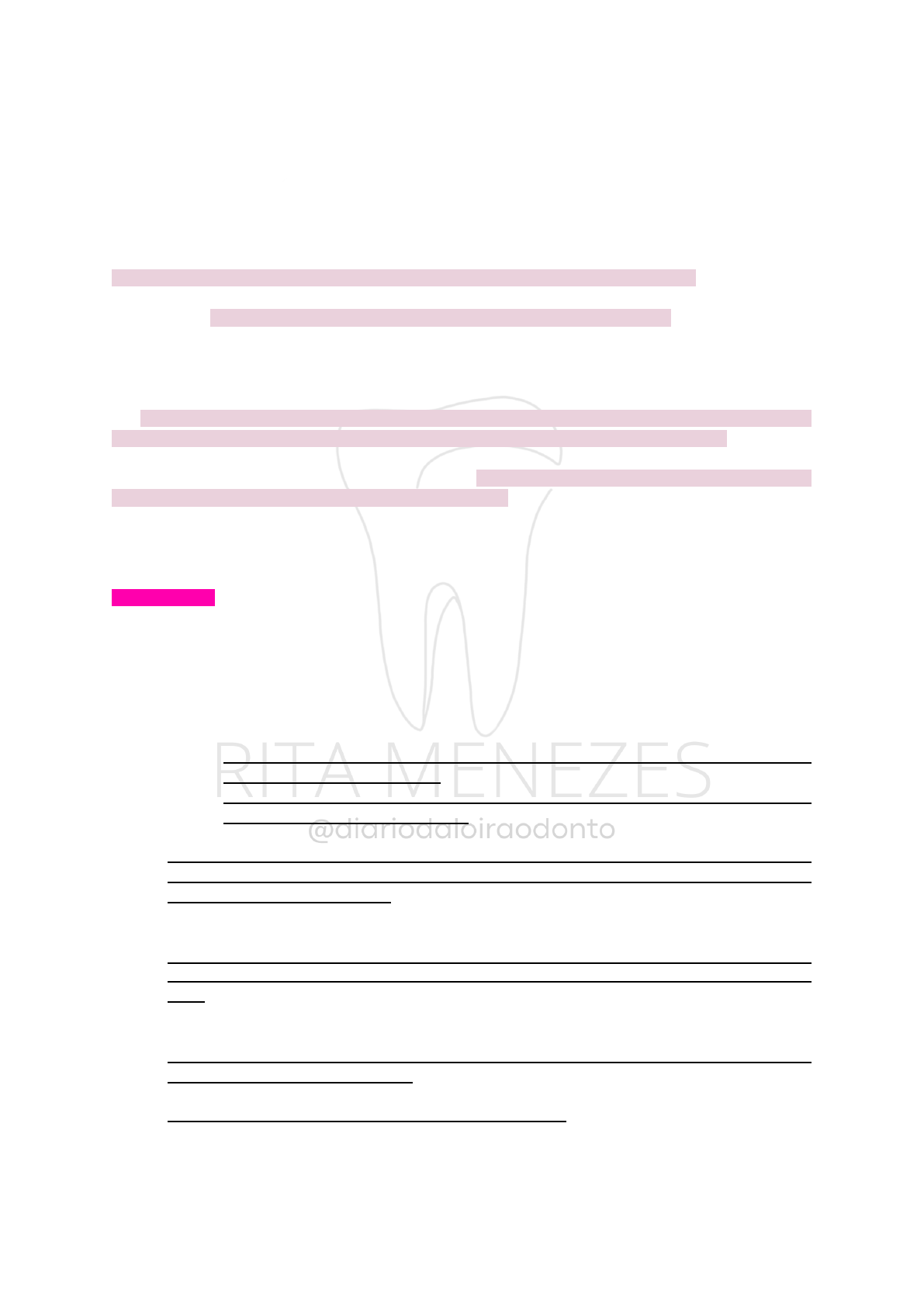 <p>@diariodaloiraodonto| RITA MENEZES - PPR</p><p>Prótese parcial Removível</p><p>● Prótese: reposição dos tecidos ausentes;</p><p>● Removível: permite ser removida pelo paciente diariamente;</p><p>● Parcial: um ou mais dentes e estruturas adjacentes;</p><p>● Total: todos os dentes e estruturas adjacentes.</p><p>Finalidade funcional, estética e substituir os dentes naturais ausentes em pacientes</p><p>parcialmente dentados, podendo ser removidas e posicionadas na boca, sempre que</p><p>necessário, sem causar danos às estruturas e elementos biológicos. A peça funciona</p><p>com grampos, apoios, conectores e selas que tem desenhos e formatos específicos</p><p>para cada caso.</p><p>● Nomeados como: pontes móveis, aparelhos parciais móveis e aparelhos</p><p>parciais removíveis.</p><p>As PPRs podem não estar apoiadas apenas nos dentes remanescentes, o rebordo</p><p>residual pode ser usado como sustentação em um ou em ambos os lados da arcada</p><p>dentária. A peça funciona com grampos, apoios, conectores e selas que tem desenhos</p><p>e formatos específicos para cada caso. Sua relação bioprotética é estabelecida entre</p><p>os elementos metálicos da prótese e os dentes, permitindo retenção e estabilidade</p><p>funcional, sua remoção e posicionamento pode ser feita pelo paciente. São indicadas</p><p>para os casos onde o paciente edêntulo não pode utilizar prótese fixa. Os espaços</p><p>pequenos devem ser restaurados com prótese fixa, e os grandes com PPR.</p><p>INDICAÇÕES</p><p>1. Extremidades livres edêntulas uni ou bilateral;</p><p>Não será indicado:</p><p>- Quando a ausência de molares é compensada pela presença de dois</p><p>pré-molares com boas condições periodontais;</p><p>- Quando o arco oponente estiver com prótese total, 2° molar ausente</p><p>com substituição não desejada;</p><p>- 2° molar contido por prótese fixa.</p><p>Nas três situações, é recomendado o uso de prótese fixa, usando os 2</p><p>pré-molares como suporte.</p><p>Se por um acaso não houver suporte posterior, é indicado o uso de PPR</p><p>com suporte dental e mucoso.</p><p>2. Espaços protéticos edêntulos extensos;</p><p>Se houver só um elemento dental posterior ao espaço edêntulo extenso,</p><p>deve-se considerar a perda desse elemento, fazendo uma indicação de uma</p><p>PPR dentomucossuportada.</p><p>3. Dentes de suporte com sustentação periodontal reduzida;</p><p>4. Excessiva perda de tecido ósseo;</p><p>A PPR certifica melhor posicionamento dos dentes artificiais, dando suporte</p><p>para os lábios e bochechas, favorecendo assim a harmonia do contorno da</p><p>face.</p><p>5. Necessidade de recolocação imediata dos dentes anteriores;</p><p>6. Cirurgias bucodento-alveolar e bucomaxilofacial;</p><p>Servem de recursos terapêuticos auxiliares, podendo ser colocadas sobre</p><p>estruturas anatômicas sadias.</p><p>7. Como auxiliares nas contenções de fraturas maxilares;</p><p>Em casos de fraturas, ortognáticas, imobilização.</p><p>8. Para pequenas movimentações</p><p>9. Estado emocional e físico do paciente;</p><p>10. Como aparelhos temporários e orientadores nas reabilitações bucais;</p><p>DI FIORE, Sérgio R.; DI FIORE, Marco Antônio; DI FIORE, Ana Paula. Atlas de Prótese Parcial Removível: Princípios Biomecânicos, bioprotéticos e</p><p>de oclusão. PPR, Santos Editora, v. 2, p. 3-7, 11-22, 24 mar. 2010.</p><p>@diariodaloiraodonto| RITA MENEZES - PPR</p><p>11. Protetor de implante;</p><p>12. Odontopediatria;</p><p>13. Fator de ordem econômica.</p><p>CONTRA-INDICAÇÃO</p><p>● Xerostomia;</p><p>● Falta de coordenação motora, provocando a má higiene;</p><p>● Debilidade mental;</p><p>● Baixa resistência à cárie e doença periodontal.</p><p>CLASSIFICAÇÃO DAS PRÓTESES DENTÁRIAS</p><p>● Próteses fixas: adaptação feita em função dos dentes remanescentes;</p><p>● Próteses totais: adaptação vinculada à mucosa alveolar;</p><p>● Próteses removíveis: a adaptação é para transmitir a força da mastigação ao</p><p>osso alveolar, podendo ocorrer pelos dentes ou de dentes + mucosa alveolar.</p><p>As PPRs são agrupadas em duas subclasses: Próteses removíveis dentossuportadas e</p><p>dentomucossuportas.</p><p>FORÇA MASTIGATÓRIAS</p><p>As próteses dentárias sendo elas, totais ou parciais, precisam receber forças</p><p>mastigatórias e transmiti-las ao osso alveolar. As vias de transmissão da força entre</p><p>dentes pilares e/ou mucosa alveolar, são diferenciadas e determinam a forma de</p><p>integração bioprotética e funcional.</p><p>O conceito de suporte deve ser entendido biologicamente como suporte ósseo: único</p><p>suporte ou fundamento mecânico da futura prótese.</p><p>● Suporte dental: os dentes recebem cargas diretamente por meios protéticos</p><p>ligados a eles ou pelas selas próximas a eles.</p><p>● Suporte mucoso: os rebordos recebem a força, como uma carga de pressão,</p><p>assim, a transmitem ao osso residual.</p><p>As PPRs podem ser classificadas em dois grupos: dentossuportadas e</p><p>dentomucossuportadas. Sendo assim, diferenciadas pela condição que determina a</p><p>transferência da força da mastigação ao osso alveolar dos maxilares. Portanto, a</p><p>estabilidade e retenção, decorrem do êxito alcançado na definição da condição de</p><p>suporte para a prótese.</p><p>PPR DENTOSSUPORTADA (caracterizada pela presença de dentes pilares nas</p><p>extremidades do espaço protético)</p><p>Quando a F (força mastigatória) é realizada sobre os dentes</p><p>artificiais, essa força é transmitida ao osso alveolar somente</p><p>através dos dentes remanescentes, apoio oclusal (a). Essa</p><p>transmissão de força é realizada pelas fibras do ligamento</p><p>periodontal desses elementos, sendo</p><p>absorvida pelo osso alveolar através</p><p>de estímulos de tração.</p><p>A mucosa que reveste o espaço</p><p>protético, intercalada entre os</p>