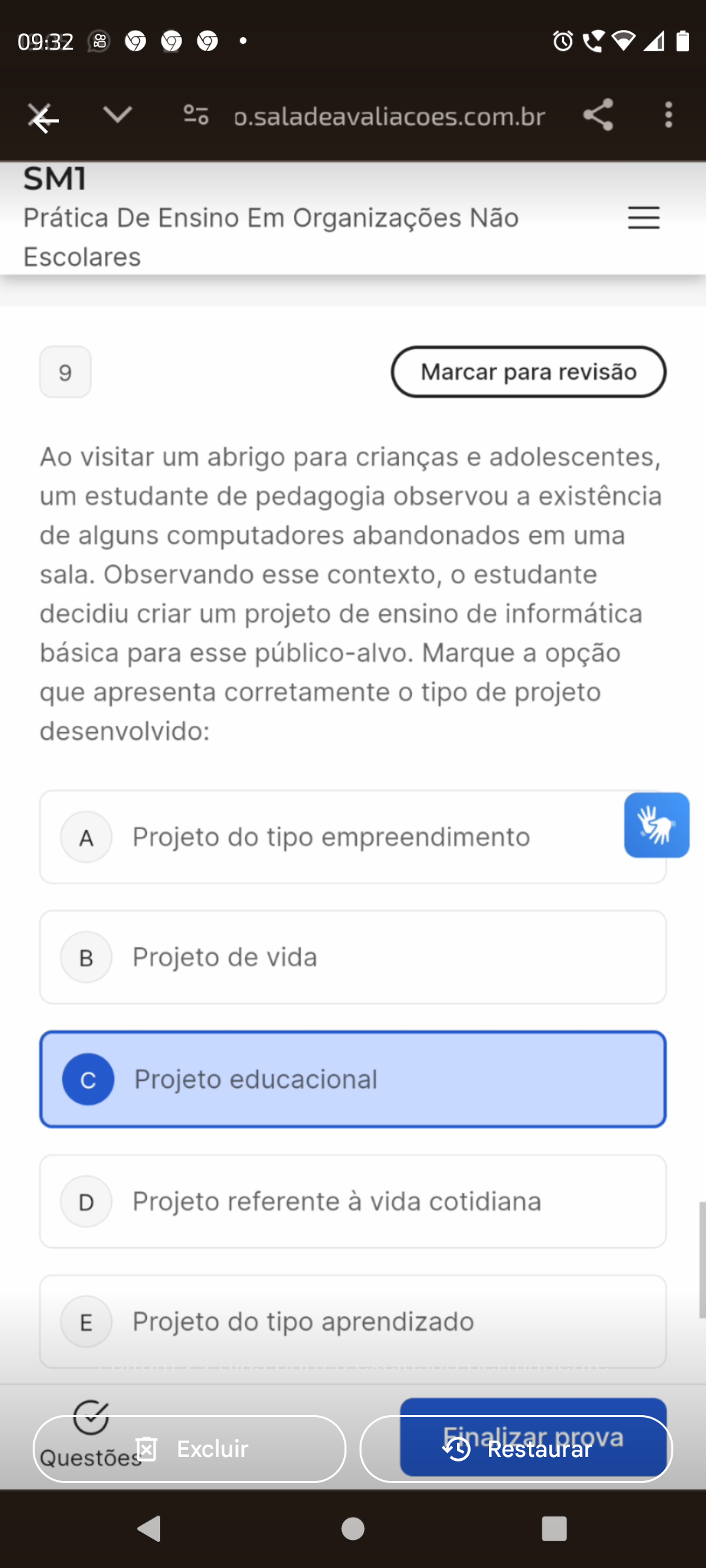 <p>09:32 88 9 V SM1 Prática De Ensino Em Organizações Não Escolares 9 Marcar para revisão Ao visitar um abrigo para crianças e adolescentes, um estudante de pedagogia observou a existência de alguns computadores abandonados em uma sala. Observando esse contexto, o estudante decidiu criar um projeto de ensino de informática básica para esse público-alvo. Marque a opção que apresenta corretamente o tipo de projeto desenvolvido: A Projeto do tipo empreendimento B Projeto de vida C Projeto educacional D Projeto referente à vida cotidiana E Projeto do tipo aprendizado Finalizar prova Questões Excluir Restaurar</p>