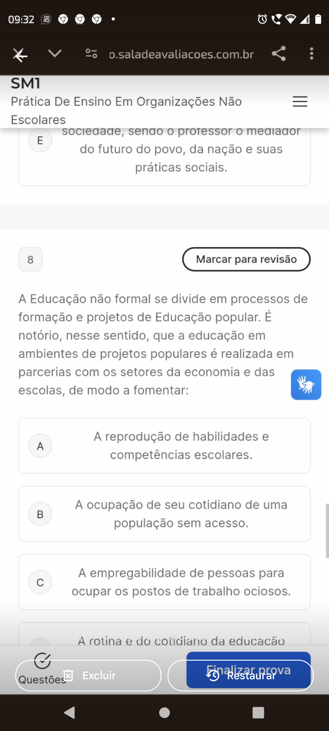 <p>09:32 .saladeavaliacoes.com.br Prática De Ensino Em Organizações Não Escolares sociedade, sendo professor E do futuro do povo, da nação e suas práticas sociais. 8 Marcar para revisão A Educação não formal se divide em processos de formação e projetos de Educação popular. É notório, nesse sentido, que a educação em ambientes de projetos populares é realizada em parcerias com os setores da economia e das escolas, de modo a fomentar: A reprodução de habilidades e A competências escolares. A ocupação de seu cotidiano de uma B população sem acesso. A empregabilidade de pessoas para C ocupar os postos de trabalho ociosos. A rotina e do da educação Questões Excluir Finalizar prova Restaurar</p>