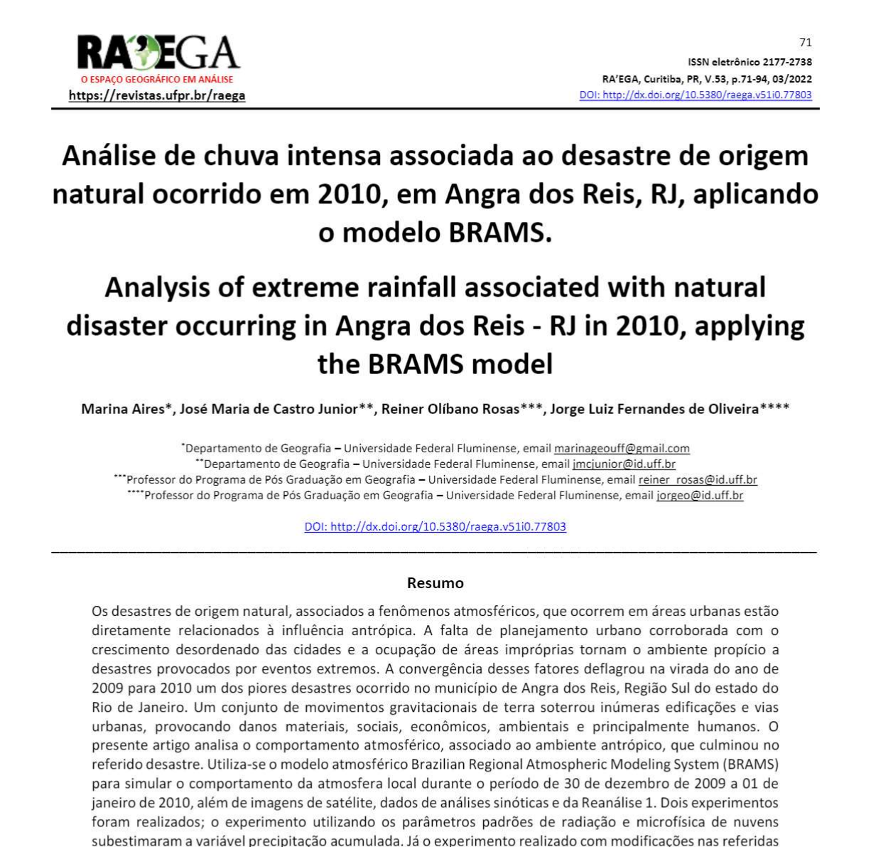 <p>71 ISSN eletrônico 2177-2738 o ESPAÇO GEOGRÁFICO EM ANÁLISE RA'EGA, Curitiba, PR, V.53, p.71-94, 03/2022 https://revistas.ufpr.br/raega Análise de chuva intensa associada ao desastre de origem natural ocorrido em 2010, em Angra dos Reis, RJ, aplicando o modelo BRAMS. Analysis of extreme rainfall associated with natural disaster occurring in Angra dos Reis - RJ in 2010, applying the BRAMS model Marina Aires*, José Maria de Castro Junior**, Reiner Olíbano Rosas*** Jorge Luiz Fernandes de Oliveira**** de Geografia - Universidade Federal Fluminense, email marinageouff@gmail.com de Geografia Universidade Federal Fluminense, email jmcjunior@id.uff.br Professor do Programa de Pós Graduação em Geografia Universidade Federal Fluminense, email reiner rosas@id.uff.br do Programa de Pós Graduação em Geografia Universidade Federal Fluminense, email jorgeo@id.uff.br DOI: Resumo Os desastres de origem natural, associados a fenômenos atmosféricos, que ocorrem em áreas urbanas estão diretamente relacionados à influência A falta de planejamento urbano corroborada com o crescimento desordenado das cidades e a ocupação de áreas impróprias tornam o ambiente propício a desastres provocados por eventos extremos. A convergência desses fatores deflagrou na virada do ano de 2009 para 2010 um dos piores desastres ocorrido no município de Angra dos Reis, Região Sul do estado do Rio de Janeiro. Um conjunto de movimentos gravitacionais de terra soterrou inúmeras edificações e vias urbanas, provocando danos materiais, sociais, econômicos, ambientais e principalmente humanos. o presente artigo analisa o comportamento atmosférico, associado ao ambiente que culminou no referido desastre. Utiliza-se o modelo atmosférico Brazilian Regional Atmospheric Modeling System (BRAMS) para simular o comportamento da atmosfera local durante o período de 30 de dezembro de 2009 a 01 de janeiro de 2010, além de imagens de satélite, dados de análises sinóticas e da Reanálise 1. Dois experimentos foram realizados; o experimento utilizando os parâmetros padrões de radiação e microfísica de nuvens subestimaram a variável precipitação acumulada. Já o experimento realizado com modificações nas referidas</p>
