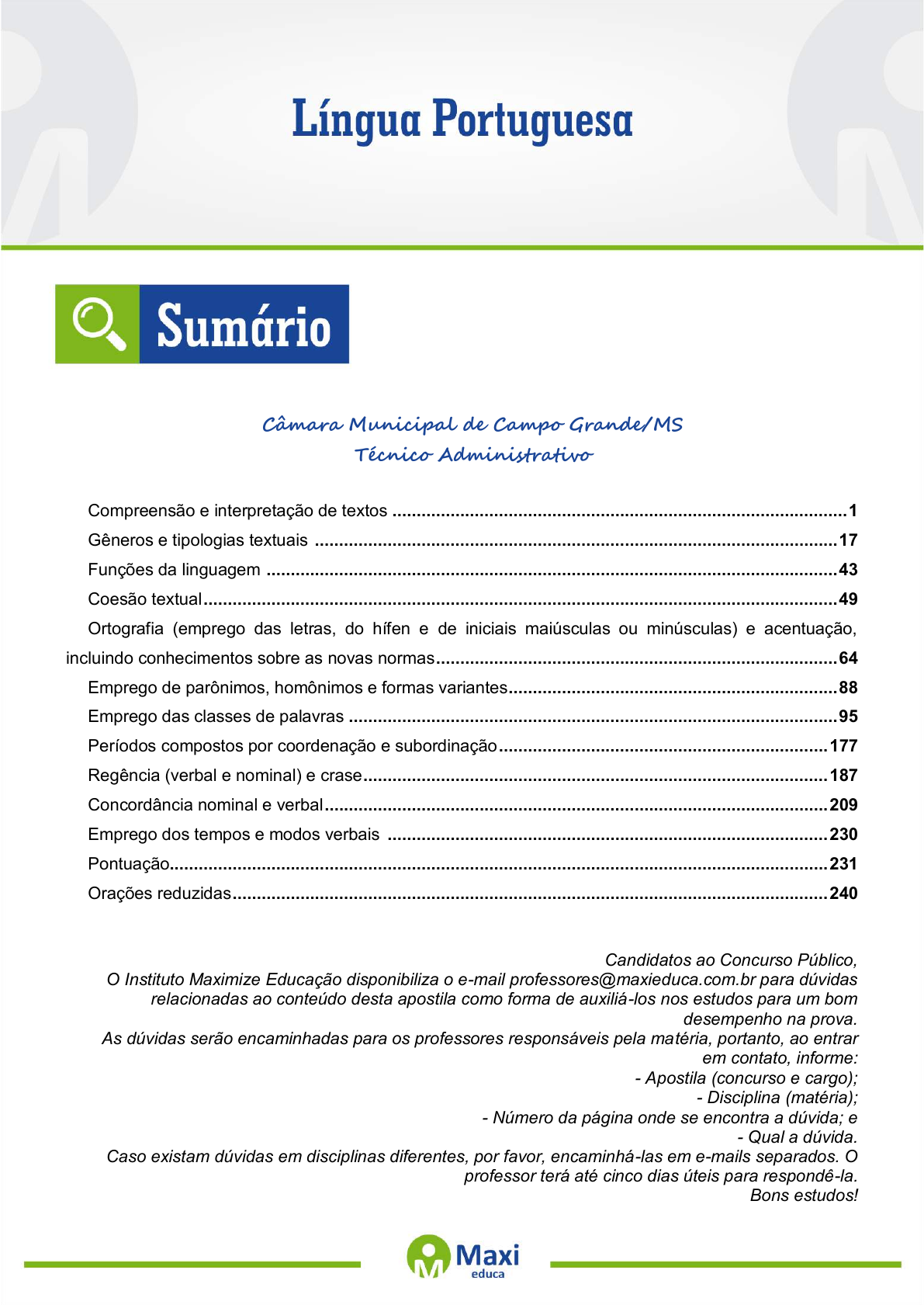<p>. 1</p><p>Câmara Municipal de Campo Grande/MS</p><p>Técnico Administrativo</p><p>Compreensão e interpretação de textos .............................................................................................. 1</p><p>Gêneros e tipologias textuais ............................................................................................................ 17</p><p>Funções da linguagem ...................................................................................................................... 43</p><p>Coesão textual ................................................................................................................................... 49</p><p>Ortografia (emprego das letras, do hífen e de iniciais maiúsculas ou minúsculas) e acentuação,</p><p>incluindo conhecimentos sobre as novas normas ................................................................................... 64</p><p>Emprego de parônimos, homônimos e formas variantes .................................................................... 88</p><p>Emprego das classes de palavras ..................................................................................................... 95</p><p>Períodos compostos por coordenação e subordinação .................................................................... 177</p><p>Regência (verbal e nominal) e crase ................................................................................................ 187</p><p>Concordância nominal e verbal ........................................................................................................ 209</p><p>Emprego dos tempos e modos verbais ........................................................................................... 230</p><p>Pontuação........................................................................................................................................ 231</p><p>Orações reduzidas ........................................................................................................................... 240</p><p>Candidatos ao Concurso Público,</p><p>O Instituto Maximize Educação disponibiliza o e-mail professores@maxieduca.com.br para dúvidas</p><p>relacionadas ao conteúdo desta apostila como forma de auxiliá-los nos estudos para um bom</p><p>desempenho na prova.</p><p>As dúvidas serão encaminhadas para os professores responsáveis pela matéria, portanto, ao entrar</p><p>em contato, informe:</p><p>- Apostila (concurso e cargo);</p><p>- Disciplina (matéria);</p><p>- Número da página onde se encontra a dúvida; e</p><p>- Qual a dúvida.</p><p>Caso existam dúvidas em disciplinas diferentes, por favor, encaminhá-las em e-mails separados. O</p><p>professor terá até cinco dias úteis para respondê-la.</p><p>Bons estudos!</p><p>1353836 E-book gerado especialmente para HIRAN COSTA BUSTAMANTE MENDES</p><p>. 1</p><p>Caro(a) candidato(a), antes de iniciar nosso estudo, queremos nos colocar à sua disposição, durante</p><p>todo o prazo do concurso para auxiliá-lo em suas dúvidas e receber suas sugestões. Muito zelo e técnica</p><p>foram empregados na edição desta obra. No entanto, podem ocorrer erros de digitação ou dúvida</p><p>conceitual. Em qualquer situação, solicitamos a comunicação ao nosso serviço de atendimento ao cliente</p><p>para que possamos esclarecê-lo. Entre em contato conosco pelo e-mail: professores @maxieduca.com.br</p><p>Apreensão e Compreensão do Texto e Sentido</p><p>Quando Lula disse a Collor no primeiro debate do segundo turno das eleições presidenciais de 1989:</p><p>“Eu sabia que você era collorido por fora, mas caiado por dentro.”</p><p>Os brasileiros colocaram essa frase no âmbito dos “discursos da campanha presidencial” e</p><p>entenderam não “Você tem cores fora, mas é revestido de cal por dentro”, mas “Você apresenta um</p><p>discurso moderno e de centro-esquerda, mas é um reacionário”.</p><p>Observe que há duas operações diferentes no entendimento do texto. A primeira é a apreensão, que</p><p>é a captação das relações que cada parte mantém com as outras no interior do texto. No entanto, ela não</p><p>é suficiente para entender o sentido integral. Uma pessoa que conhecesse todas as palavras da frase</p><p>acima, mas não conhecesse o universo dos discursos da campanha presidencial, não entenderia o</p><p>significado da frase. Por isso, é preciso colocar o texto dentro do universo discursivo a que ele pertence</p><p>e no interior do qual ganha sentido. Alguns teóricos chamam “conhecimento de mundo” ao universo</p><p>discursivo. Na frase acima, collorido e caiado não pertencem ao universo da pintura, mas da vida política:</p><p>a primeira palavra refere-se a Collor e ao modo como ele se apresentava, um político moderno e inovador;</p><p>a segunda diz respeito a Ronaldo Caiado, político conservador que o apoiava. A essa operação</p><p>chamamos compreensão.</p><p>Apreensão + Compreensão = Entendimento do texto</p><p>Para ler e entender um texto é preciso atingir dois níveis de leitura: informativa e de reconhecimento.</p><p>A primeira deve ser feita cuidadosamente por ser o primeiro contato com o texto, extraindo-se</p><p>informações e se preparando para a leitura interpretativa. Durante a interpretação grife palavras-chave,</p><p>passagens importantes; tente ligar uma palavra à ideia central de cada parágrafo.</p><p>A última fase de interpretação concentra-se nas perguntas e opções de respostas. Marque palavras</p><p>como não, exceto, respectivamente, etc., pois fazem diferença na escolha adequada.</p><p>Retorne ao texto mesmo que pareça ser perda de tempo. Leia a frase anterior e posterior para ter ideia</p><p>do sentido global proposto pelo autor.</p><p>Um texto para ser compreendido deve apresentar ideias seletas e organizadas, através dos parágrafos</p><p>que é composto pela ideia central, argumentação e/ou desenvolvimento e a c