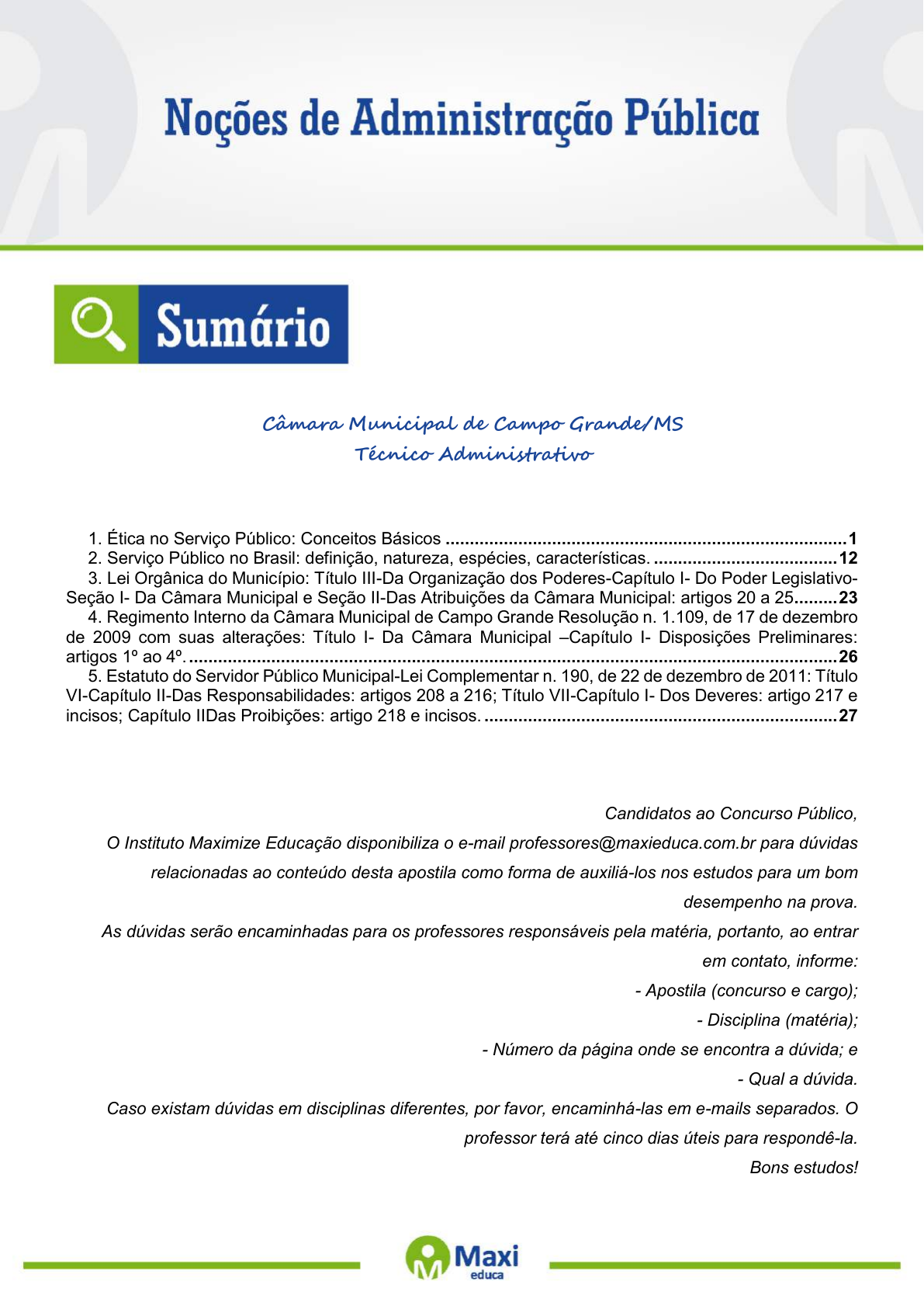 <p>. 1</p><p>Câmara Municipal de Campo Grande/MS</p><p>Técnico Administrativo</p><p>1. Ética no Serviço Público: Conceitos Básicos ................................................................................... 1</p><p>2. Serviço Público no Brasil: definição, natureza, espécies, características. ...................................... 12</p><p>3. Lei Orgânica do Município: Título III-Da Organização dos Poderes-Capítulo I- Do Poder Legislativo-</p><p>Seção I- Da Câmara Municipal e Seção II-Das Atribuições da Câmara Municipal: artigos 20 a 25. ........ 23</p><p>4. Regimento Interno da Câmara Municipal de Campo Grande Resolução n. 1.109, de 17 de dezembro</p><p>de 2009 com suas alterações: Título I- Da Câmara Municipal –Capítulo I- Disposições Preliminares:</p><p>artigos 1º ao 4º. ...................................................................................................................................... 26</p><p>5. Estatuto do Servidor Público Municipal-Lei Complementar n. 190, de 22 de dezembro de 2011: Título</p><p>VI-Capítulo II-Das Responsabilidades: artigos 208 a 216; Título VII-Capítulo I- Dos Deveres: artigo 217 e</p><p>incisos; Capítulo IIDas Proibições: artigo 218 e incisos. ......................................................................... 27</p><p>Candidatos ao Concurso Público,</p><p>O Instituto Maximize Educação disponibiliza o e-mail professores@maxieduca.com.br para dúvidas</p><p>relacionadas ao conteúdo desta apostila como forma de auxiliá-los nos estudos para um bom</p><p>desempenho na prova.</p><p>As dúvidas serão encaminhadas para os professores responsáveis pela matéria, portanto, ao entrar</p><p>em contato, informe:</p><p>- Apostila (concurso e cargo);</p><p>- Disciplina (matéria);</p><p>- Número da página onde se encontra a dúvida; e</p><p>- Qual a dúvida.</p><p>Caso existam dúvidas em disciplinas diferentes, por favor, encaminhá-las em e-mails separados. O</p><p>professor terá até cinco dias úteis para respondê-la.</p><p>Bons estudos!</p><p>1353836 E-book gerado especialmente para HIRAN COSTA BUSTAMANTE MENDES</p><p>. 1</p><p>Caro(a) candidato(a), antes de iniciar nosso estudo, queremos nos colocar à sua disposição, durante</p><p>todo o prazo do concurso para auxiliá-lo em suas dúvidas e receber suas sugestões. Muito zelo e técnica</p><p>foram empregados na edição desta obra. No entanto, podem ocorrer erros de digitação ou dúvida</p><p>conceitual. Em qualquer situação, solicitamos a comunicação ao nosso serviço de atendimento ao cliente</p><p>para que possamos esclarecê-lo. Entre em contato conosco pelo e-mail: professores @maxieduca.com.br</p><p>A questão ética é um fator imprescindível para uma sociedade e por isso sempre encontramos diversos</p><p>autores tentando definir o que vem a ser ética e como ela se interfere em uma sociedade.</p><p>O tema: Ética é por si só polêmico, entretanto causa ainda mais inquietação quando falamos sobre a</p><p>ética na administração pública, pois logo pensamos em corrupção, extorsão, ineficiência, etc., mas na</p><p>realidade o que devemos ter como ponto de referência em relação ao serviço público, ou na vida pública</p><p>em geral, é que seja fixado um padrão a partir do qual possamos em seguida julgar a atuação dos</p><p>servidores públicos ou daqueles que estiverem envolvidos na vida pública, entretanto não basta que haja</p><p>padrão, tão somente, é necessário que esse padrão seja ético, acima de tudo.</p><p>Assim, ética pública seria a moral incorporada ao Direito, consolidando o valor do justo. Diante da</p><p>relevância social de que a Ética se faça presente no exercício das atividades públicas, as regras éticas</p><p>para a vida pública são mais do que regras morais, são regras jurídicas estabelecidas em diversos</p><p>diplomas do ordenamento, possibilitando a coação em caso de infração por parte daqueles que</p><p>desempenham a função pública.</p><p>Todas as diretivas de leis específicas sobre a ética no setor público partem da Constituição Federal,</p><p>que estabelece alguns princípios fundamentais para a ética no setor público. Em outras palavras, é o</p><p>texto constitucional do artigo 37, especialmente o caput, que permite a compreensão de boa parte do</p><p>conteúdo das leis específicas, porque possui um caráter amplo ao preconizar os princípios fundamentais</p><p>da administração pública. Estabelece a Constituição Federal:</p><p>Art. 37. A administração pública direta e indireta de qualquer dos Poderes da União, dos Estados, do</p><p>Distrito Federal e dos Municípios obedecerá aos princípios de legalidade, impessoalidade, moralidade,</p><p>publicidade e eficiência e, também, ao seguinte: [...]</p><p>São princípios da administração pública, nesta ordem:</p><p>Legalidade</p><p>Impessoalidade</p><p>Moralidade</p><p>Publicidade</p><p>Eficiência</p><p>Para memorizar: veja que as iniciais das palavras formam o vocábulo LIMPE, que remete à limpeza</p><p>esperada da Administração Pública.</p><p>CONSTITUIÇÃO DA REPÚBLICA FEDERATIVA DO BRASIL DE 1988</p><p>CAPÍTULO VII</p><p>DA ADMINISTRAÇÃO PÚBLICA</p><p>Seção I</p><p>DISPOSIÇÕES GERAIS</p><p>Artigo 37- A administração pública direta e indireta de qualquer dos Poderes da União, dos Estados,</p><p>do Distrito Federal e dos Municípios obedecerá aos princípios de legalidade, impessoalidade, moralidade,</p><p>publicidade e eficiência e, também, ao seguinte: (...)</p><p>Princípio da Legalidade:</p><p>O princípio da legalidade, um dos mais importantes princípios consagrados no ordenamento jurídico</p><p>brasileiro, consiste no fato de que o administrador somente poderá fazer o que a lei permite. É importante</p><p>demonstrar a diferenciação entre o princípio da legalidade estabelecido ao administrado e ao</p><p>administrador. Como já explicitado para 