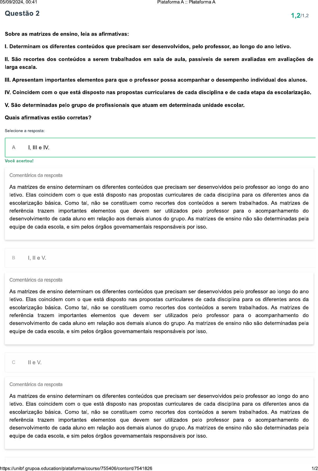 <p>05/09/2024, 00:41 Plataforma A Plataforma A Questão 2 1,2/1,2 Sobre as matrizes de ensino, leia as afirmativas: I. Determinam os diferentes conteúdos que precisam ser desenvolvidos, pelo professor, ao longo do ano letivo. II. São recortes dos conteúdos a serem trabalhados em sala de aula, passíveis de serem avaliadas em avaliações de larga escala. III. Apresentam importantes elementos para que o professor possa acompanhar o desempenho individual dos alunos. IV. Coincidem com o que está disposto nas propostas curriculares de cada disciplina e de cada etapa da escolarização. V. São determinadas pelo grupo de profissionais que atuam em determinada unidade escolar. Quais afirmativas estão corretas? Selecione a resposta: A I, III e IV. Você acertou! Comentários da resposta As matrizes de ensino determinam os diferentes conteúdos que precisam ser desenvolvidos pelo professor ao longo do ano letivo. Elas coincidem com o que está disposto nas propostas curriculares de cada disciplina para os diferentes anos da escolarização básica. Como tal, não se constituem como recortes dos conteúdos a serem trabalhados. As matrizes de referência trazem importantes elementos que devem ser utilizados pelo professor para o acompanhamento do desenvolvimento de cada aluno em relação aos demais alunos do grupo. As matrizes de ensino não são determinadas pela equipe de cada escola, e sim pelos órgãos governamentais responsáveis por isso. B I, e V. Comentários da resposta As matrizes de ensino determinam os diferentes conteúdos que precisam ser desenvolvidos pelo professor ao longo do ano letivo. Elas coincidem com o que está disposto nas propostas curriculares de cada disciplina para os diferentes anos da escolarização básica. Como tal, não se constituem como recortes dos conteúdos a serem trabalhados. As matrizes de referência trazem importantes elementos que devem ser utilizados pelo professor para o acompanhamento do desenvolvimento de cada aluno em relação aos demais alunos do grupo. As matrizes de ensino não são determinadas pela equipe de cada escola, e sim pelos órgãos governamentais responsáveis por isso. C e V. Comentários da resposta As matrizes de ensino determinam os diferentes conteúdos que precisam ser desenvolvidos pelo professor ao longo do ano letivo. Elas coincidem com o que está disposto nas propostas curriculares de cada disciplina para os diferentes anos da escolarização básica. Como tal, não se constituem como recortes dos conteúdos a serem trabalhados. As matrizes de referência trazem importantes elementos que devem ser utilizados pelo professor para o acompanhamento do desenvolvimento de cada aluno em relação aos demais alunos do grupo. As matrizes de ensino não são determinadas pela equipe de cada escola, e sim pelos órgãos governamentais responsáveis por isso. https://unibf.grupoa.education/plataforma/course/755406/content/7541826 1/2</p><p>05/09/2024, 00:41 Plataforma A Plataforma A D e III. Comentários da resposta As matrizes de ensino determinam os diferentes conteúdos que precisam ser desenvolvidos pelo professor ao longo do ano letivo. Elas coincidem com o que está disposto nas propostas curriculares de cada disciplina para os diferentes anos da escolarização básica. Como tal, não se constituem como recortes dos conteúdos a serem trabalhados. As matrizes de referência trazem importantes elementos que devem ser utilizados pelo professor para o acompanhamento do desenvolvimento de cada aluno em relação aos demais alunos do grupo. As matrizes de ensino não são determinadas pela equipe de cada escola, e sim pelos órgãos governamentais responsáveis por isso. E IV e V. Comentários da resposta As matrizes de ensino determinam os diferentes conteúdos que precisam ser desenvolvidos pelo professor ao longo do ano letivo. Elas coincidem com o que está disposto nas propostas curriculares de cada disciplina para os diferentes anos da escolarização básica. Como tal, não se constituem como recortes dos conteúdos a serem trabalhados. As matrizes de referência trazem importantes elementos que devem ser utilizados pelo professor para o acompanhamento do desenvolvimento de cada aluno em relação aos demais alunos do grupo. As matrizes de ensino não são determinadas pela equipe de cada escola, e sim pelos órgãos governamentais responsáveis por isso. https://unibf.grupoa.education/plataforma/course/755406/content/7541826 2/2</p>