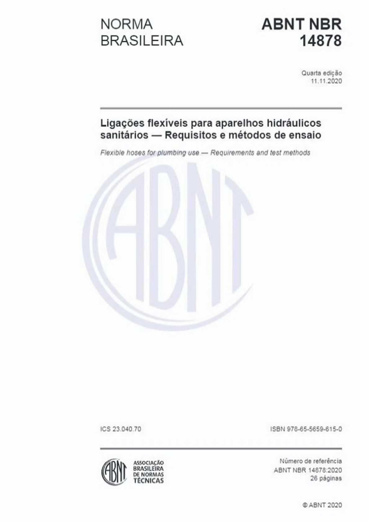 <p>NORMA ABNT NBR BRASILEIRA 14878 Quarta edição 11.11.2020 Ligações flexíveis para aparelhos hidráulicos sanitários - Requisitos e métodos de ensaio Flexible hoses for plumbing use - Requirements and test methods ICS ISBN 978-65-5659-615-0 ASSOCIAÇÃO Número de referência BRASILEIRA ABNT NBR DE NORMAS TÉCNICAS 26 páginas ABNT 2020</p><p>14878:2020 ABNT 2020 Todos os direitos A menos que especificado de outro modo, nenhuma parte desta publicação pode ser reproduzida ou utilizada por qualquer meio, eletrônico ou incluindo fotocópia e microfilme, sem permissão por escrito da ABNT Av. Treze de Maio, 13 andar 20031-901 Rio de Janeiro RJ Tel.: + 55 21 3974-2300 Fax: + 55 21 3974-2346 abnt@abnt.org.br www.abnt.org.br ABNT 2020 - Todos os direitos reservados</p><p>ABNT NBR 14878:2020 Sumário Página Prefácio vi Introdução vii 1 Escopo 1 2 Referências normativas 1 3 Termos e definições 1 4 Requisitos 4 4.1 Materiais 4 4.1.1 Generalidades 4 4.1.2 Materiais metálicos e não metálicos 4 4.2 Identificação 4 4.3 Informações gerais 4 4.4 Informações técnicas 5 4.5 Manutenção 5 4.6 Características construtivas 5 4.7 Dimensões 5 4.7.1 Conexões de entrada e 5 4.7.2 Ligação flexível 5 4.8 Acabamento superficial 7 4.8.1 Aspecto visual 7 4.8.2 Revestimento de 7 4.8.3 Revestimento eletrostático 7 4.8.4 Revestimento metalizado (metalização) 7 5 8 5.1 Generalidades 8 5.2 Ligações constantemente pressurizadas 8 5.2.1 Vazão 8 5.2.2 Estanqueidade 9 5.2.3 Resistência ao torque de montagem na instalação 9 5.2.4 Resistência ao golpe de 9 5.2.5 Resistência à corrosão 10 5.3 Ligações sujeitas a constantes solicitações mecânicas 10 5.3.1 Vazão 10 5.3.2 Estanqueidade 10 5.3.3 Resistência ao torque de montagem na instalação 10 5.3.4 Resistência ao golpe de 11 5.3.5 Resistência à tração/torção 11 5.3.6 Resistência à corrosão 11 6 Inspeção 12 7 Aceitação e rejeição 12 Anexo A (normativo) Verificação dimensional e resistência ao torque de montagem na instalação das conexões de entrada e saída 13 ABNT 2020 Todos os direitos reservados iii</p><p>ABNT NBR 14878:2020 A.1 13 A.2 Corpo de prova 13 A.3 Aparelhagem 13 A.4 Procedimento 13 A.5 Resultado 14 A.6 Relatório do 14 Anexo B (normativo) Verificação do comprimento da ligação flexível 15 B.1 15 B.2 Corpo de prova 15 B.3 Aparelhagem 15 B.4 Procedimento 15 B.5 Relatório de 16 Anexo C (normativo) Verificação da vazão mínima 17 C.1 17 C.2 Corpo de prova 17 C.3 Aparelhagem 17 C.4 Procedimento 18 C.5 Resultado 18 C.6 Relatório de ensalo 18 Anexo D (normativo) Verificação da estanqueidade 19 D.1 Principio 19 D.2 Corpo de prova 19 D.3 Aparelhagem 19 D.4 Procedimento 20 D.4.1 Ligação constantemente pressurizada 20 D.4.1.1 Ensaio hidrostático 20 D.4.1.2 Ensaio pneumostático 20 D.4.2 Ligação flexível sujeita a constantes solicitações mecânicas 20 D.4.2.1 Ensaio hidrostático 20 D.4.2.2 Ensaio pneumostático 20 D.5 Resultado 21 D.6 Relatório de ensaio 21 Anexo E (normativo) Verificação da resistência ao golpe de ariete 22 E.1 22 E.2 Corpo de prova 22 E.3 Aparelhagem 22 E.4 Procedimento 22 E.5 Resultado 24 E.6 Relatório de ensaio 24 Anexo F (normativo) Verificação da resistência à tração e torção 25 F.1 25 F.2 Corpo de prova 25 F.3 Aparelhagem 25 iv ABNT 2020 - Todos os direitos reservados</p><p>ABNT NBR 14878:2020 F.4 Procedimento 25 F.5 Resultado 26 Relatório de ensaio 26 Figuras Figura 1 - Descrição da ligação flexível 3 Figura 2 - Dimensões das conexões de saída (porca-união) e de entrada (niple) da ligação flexível 6 Figura 3 - com o uso da canopla 7 Figura 4 - Comprimento da ligação 7 Figura 5 - Esquema para o ensaio de resistência à tração/torção 12 Figura A.1 Esquema de ensaio 14 Figura B.1 - Comprimento da ligação flexível 15 Figura C.1 - Bancada de ensaio 17 Figura D.1 - Bancada para ensalo pneumostático 20 Figura E.1 - Esquema de ensalo para ligações flexíveis constantemente pressurizadas 23 Figura E.2 - Esquema de ensaio para ligações flexíveis sujeitas a constantes solicitações mecânicas 23 Figura F.1 - Esquema para o de tração e torção 26 Tabelas Tabela 1 - das conexões de entrada e da ligação flexivel 6 Tabela 2 - Ensalos para cada tipo de ligação flexivel 8 Tabela 3 - Condições para a verificação de estanqueidade das ligações flexiveis constantemente pressurizadas 9 Tabela 4 - Torques para verificação das conexões de entrada e saída 9 Tabela 5 - Condições para a verificação de estanqueidade das ligações flexiveis sujeitas a constantes solicitações mecânicas 10 ABNT 2020 - Todos os direitos reservados y</p><p>ABNT NBR 14878:2020 Prefácio A Associação Brasileira de Normas Técnicas (ABNT) é o Foro Nacional de Normalização. As Normas Brasileiras, cujo conteúdo é de responsabilidade dos Brasileiros (ABNT/CB), dos Organismos de Normalização Setorial (ABNT/ONS) e das Comissões de Estudo Especiais (ABNT/CEE), são elaboradas por Comissões de Estudo (CE), formadas pelas partes interessadas no tema objeto da normalização. Os Documentos Técnicos ABNT são elaborados conforme as regras da ABNT Diretiva 2. AABNT chama a atenção para que, apesar de ter sido solicitada manifestação sobre eventuais direitos de patentes durante a Consulta Nacional, estes podem ocorrer e devem ser comunicados à ABNT a qualquer momento (Lei 9.279, de 14 de maio de 1996). Os Documentos Técnicos ABNT, assim como as Normas Internacionais (ISO e IEC), são voluntários e não incluem requisitos contratuais, legais ou Os Documentos Técnicos ABNT não substituem Leis, Decretos ou Regulamentos, aos quais os usuários devem atender, tendo precedência sobre qualquer Documento Técnico Ressalta-se que os Documentos Técnicos ABNT podem ser objeto de citação em Regulamentos Nestes casos, os órgãos responsáveis pelos Regulamentos Técnicos podem determinar as datas para exigência dos requisitos de quaisquer D