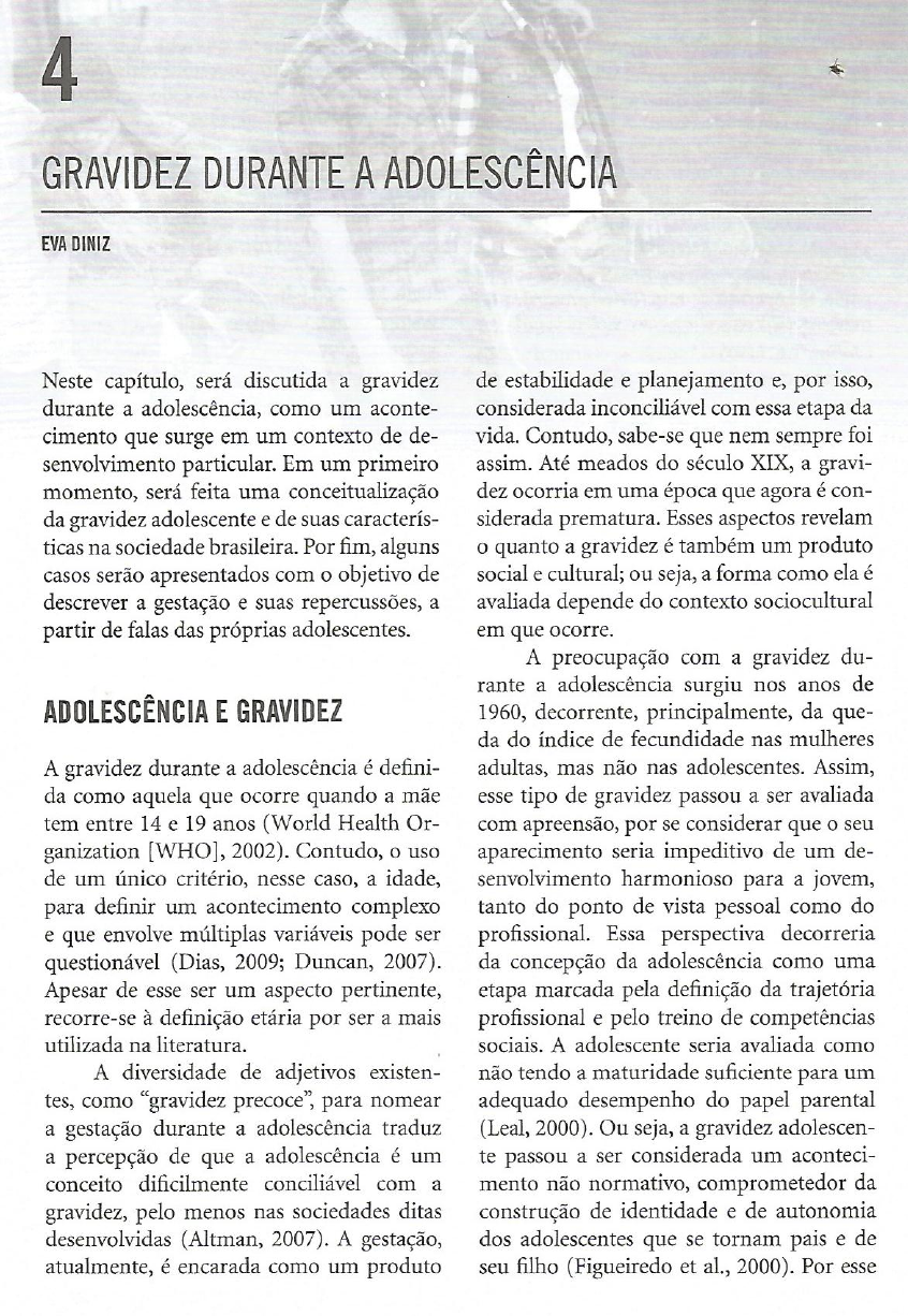 <p>4 GRAVIDEZ DURANTE A ADOLESCÊNCIA EVA DINIZ Neste capítulo, será discutida a gravidez de estabilidade e planejamento e, por isso, durante a adolescência, como um aconte- considerada inconciliável com essa etapa da cimento que surge em um contexto de de- vida. Contudo, sabe-se que nem sempre foi senvolvimento particular. Em um primeiro assim. Até meados do século XIX, a gravi- momento, será feita uma conceitualização dez ocorria em uma época que agora é con- da gravidez adolescente e de suas caracterís- siderada prematura. Esses aspectos revelam ticas na sociedade brasileira. Por fim, alguns o quanto a gravidez é também um produto casos serão apresentados com o objetivo de social e cultural; ou seja, a forma como ela é descrever a gestação e suas repercussões, a avaliada depende do contexto sociocultural partir de falas das próprias adolescentes. em que ocorre. A preocupação com a gravidez du- rante a adolescência surgiu nos anos de ADOLESCÊNCIA E GRAVIDEZ 1960, decorrente, principalmente, da que- da do índice de fecundidade nas mulheres A gravidez durante a adolescência é defini- adultas, mas não nas adolescentes. Assim, da como aquela que ocorre quando a mãe esse tipo de gravidez passou a ser avaliada tem entre 14 e 19 anos (World Health Or- com apreensão, por se considerar que o seu ganization [WHO], 2002). Contudo, o uso aparecimento seria impeditivo de um de- de um único critério, nesse caso, a idade, senvolvimento harmonioso para a jovem, para definir um acontecimento complexo tanto do ponto de vista pessoal como do e que envolve múltiplas variáveis pode ser profissional. Essa perspectiva decorreria questionável (Dias, 2009; Duncan, 2007). da concepção da adolescência como uma Apesar de esse ser um aspecto pertinente, etapa marcada pela definição da trajetória recorre-se à definição etária por ser a mais profissional e pelo treino de competências utilizada na literatura. sociais. A adolescente seria avaliada como A diversidade de adjetivos existen- não tendo a maturidade suficiente para um tes, como "gravidez precoce", para nomear adequado desempenho do papel parental a gestação durante a adolescência traduz (Leal, 2000). Ou seja, a gravidez adolescen- a percepção de que a adolescência é um te passou a ser considerada um aconteci- conceito dificilmente conciliável com a mento não normativo, comprometedor da gravidez, pelo menos nas sociedades ditas construção de identidade e de autonomia desenvolvidas (Altman, 2007). A gestação, dos adolescentes que se tornam pais e de atualmente, é encarada como um produto seu filho (Figueiredo et al., 2000). Por esse</p><p>Trabalhando com adolescentes 55 motivo, investigadores de diversas áreas de- & Menandro, 2005; Ministério da Saúde, sobre o assunto, questionando 2006), dado que ocorre em um grupo hete- o que levaria a fecundidade adolescente a rogêneo de pessoas (Duncan, 2007). Os estu- progredir de forma inversa à das mulheres dos quantitativos tendem a fornecer a visão adultas, em especial em contextos de vulne- das gestantes adolescentes como um grupo rabilidade socioeconômica (Heilborn et al., social de risco, reforçado pelo meio de vulne- 2002; Pantoja, 2003). rabilidade social de onde provêm. Contudo, A relação entre baixo nível socioeco- essa é uma concepção que não pode ser esta- nômico e gravidez adolescente é relatada belecida a priori, porque cada uma das ado- em diversos estudos (Carniel, Zanolli, Al- lescentes que compõe esse grupo tem uma meida, & Morcillo, 2006; Coley & Chase- história pessoal, da qual emerge a sua gravi- -Lansdale, 1998; Duncan, 2007; Esteves & dez (Duncan, 2007). Portanto, uma análise Menandro, 2005; Heilbron et al., 2002; Mo- contextual é imprescindível. ore & Brooks-Gunn, 2002). No entanto, é A própria concepção da idade consi- necessário ser cauteloso com essa associa- derada adequada para se ter filhos tem se ção. Considera-se que não seria a pobreza modificado ao longo do tempo, sendo asso- a gerar o aparecimento da gravidez durante ciada a aspetos sociais. Até meados do sécu- a adolescência, mas, antes, as características lo XX, era o período entre os 14 e 18 anos do contexto de desenvolvimento, frequen- que se estabeleciam os papéis de adultos. A temente marcado por baixas expectativas passagem para a vida adulta era encarada para o futuro. Nesse sentido, é fundamental pela independência econômica e pela en- atender à especificidade dos contextos de trada em uma relação estável marcada pelo desenvolvimento ao estudar/trabalhar com casamento. Contudo, atualmente, essas essa população. A influência do contexto etapas tornaram-se mais fluidas, e a ado- para compreender como a gravidez poderá lescência passou a ser encarada como um afetar o desenvolvimento e a trajetória de período sem marcos definidos, regido pela vida das adolescentes deve ser considerada instabilidade, pela procura de identidade e (Figueiredo, 2001). pela exploração de áreas como o amor e o Uma pesquisa realizada no Brasil com trabalho (Arnett & Eisenberg, 2007). Essas adolescentes brasileiras constatou que exis- mudanças geraram maior liberdade sexual, tem preocupações distintas, com relação à e, por isso, o período entre os últimos anos gravidez durante a adolescência, em função da adolescência e meados dos 20 anos já do meio social em que ocorre (Esteves & Me- não é encarado como a época para casar e nandro, 2005). Por exemplo, a preocupação estabelecer uma família, como acontecia até com a gravidez no nível social médio asso- então, mas como um momento de explo- cia-se a dúvidas com o futuro social, pro- ração individual. Além disso, assistiu-se ao fissional e acadêmico das adolescentes. No aumento do tempo em que os adolescentes entanto, em um nível socioeconômico baixo, permanecem na escola, o que afetaria os a principal preocupação se refere a questões modelos de relacionamento amo