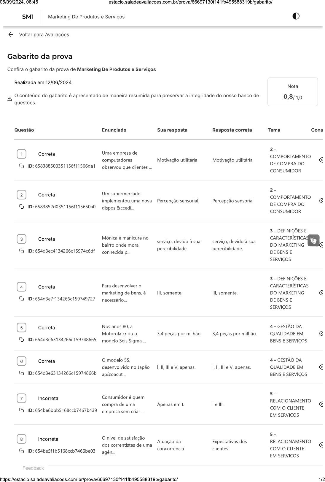 <p>05/09/2024, 08:45 Marketing De Produtos e Serviços Voltar para Avaliações Gabarito da prova Confira o gabarito da prova de Marketing De Produtos e Serviços Realizada em 12/06/2024 Nota conteúdo do gabarito é apresentado de maneira resumida para preservar a integridade do nosso banco de questões. Questão Enunciado Sua resposta Resposta correta Tema Cons 1 Correta Uma empresa de COMPORTAMENTO computadores Motivação utilitária Motivação utilitária DE COMPRA DO ID: 658388500351156f11566da1 observou que clientes CONSUMIDOR 2 Correta Um supermercado COMPORTAMENTO implementou uma nova Percepção sensorial Percepção sensorial DE COMPRA DO ID: 6583852d0351156f115650a0 disposi&ccedi... CONSUMIDOR 3 DEFINIÇÕES E 3 Correta Mônica é manicure no CARACTERÍSTICAS serviço, devido à sua serviço, devido à sua bairro onde mora, DO MARKETING ID: 654d3ec4134266c15974c6df perecibilidade. perecibilidade. conhecida p... DE BENS E SERVIÇOS 3 DEFINIÇÕES E 4 Correta Para desenvolver o CARACTERÍSTICAS marketing de bens, é III, somente. III, somente. DO MARKETING ID: 654d3e7f134266c159749727 necessário... DE BENS E SERVIÇOS 5 Correta Nos anos 80, a 4 GESTÃO DA Motorola criou o 3,4 peças por milhão. 3,4 peças por milhão. QUALIDADE EM ID: 654d3e63134266c159748665 modelo Seis BENS E SERVIÇOS 6 Correta O modelo 5S, 4 GESTÃO DA desenvolvido no Japão I, II, III e V, apenas. I, II, III e V, apenas. QUALIDADE EM ID: 654d3e63134266c15974866b ap&oacut... BENS E SERVIÇOS 7 Incorreta Consumidor é quem RELACIONAMENTO compra de uma Apenas em I. III. COM O CLIENTE ID: 654be6bbb5168ccb7467b439 empresa sem criar EM SERVICOS 8 Incorreta nível de satisfação Atuação da Expectativas dos RELACIONAMENTO dos correntistas de uma concorrência clientes COM CLIENTE ID: 654be5f1b5168ccb7466be03 agên... EM SERVICOS Feedback 1/2</p><p>05/09/2024, 08:45 9 Correta As necessidades dos COMPORTAMENTO consumidores são Bronzeador solar. Bronzeador solar. C DE COMPRA DO ID: 654d3a6b134266c15971b74e comumente div... CONSUMIDOR 3 DEFINIÇÕES E 10 Correta Ao estruturar uma CARACTERÍSTICAS Identificar o mercado- Identificar o mercado- estratégia de marketing DO MARKETING ID: 654d3e7f134266c159749709 alvo e o segmento-alvo. alvo e o segmento-alvo. de bens, DE BENS E SERVIÇOS i Encontrou algum problema? Você pode copiar o ID da questão, acessar o Campus Virtual (SIA) e abrir um requerimento. 2/2</p>