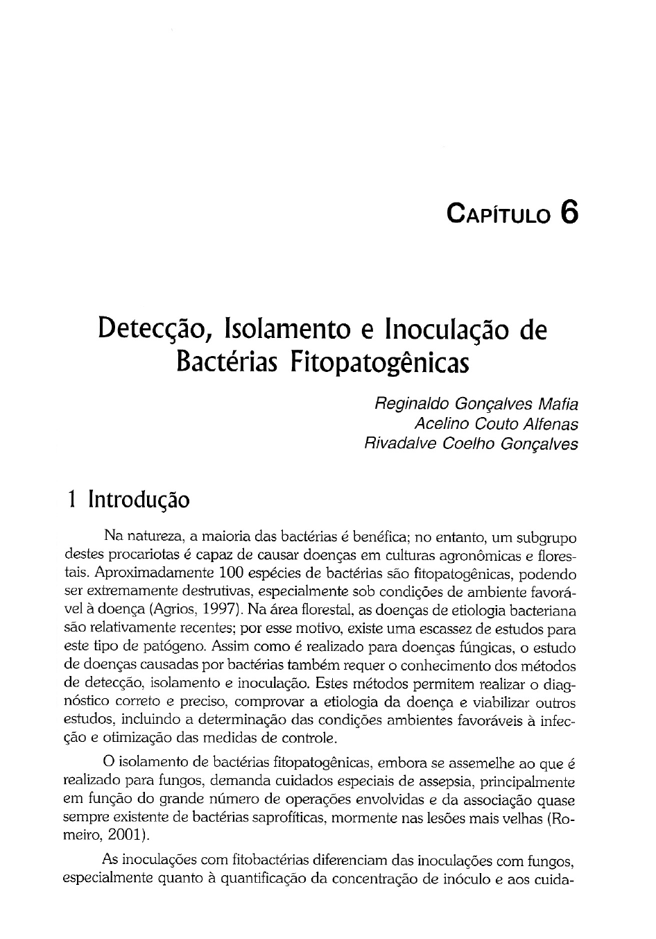<p>CAPÍTULO 6 Detecção, Isolamento e Inoculação de Bactérias Reginaldo Gonçalves Mafia Acelino Couto Alfenas Rivadalve Coelho Gonçalves 1 Introdução Na natureza, a maioria das bactérias é benéfica; no entanto, um subgrupo destes procariotas é capaz de causar doenças em culturas agronômicas e flores- tais. Aproximadamente 100 espécies de bactérias são podendo ser extremamente destrutivas, especialmente sob condições de ambiente favorá- vel à doença (Agrios, 1997). Na área florestal, as doenças de etiologia bacteriana são relativamente recentes; por esse motivo, existe uma escassez de estudos para este tipo de patógeno. Assim como é realizado para doenças fúngicas, o estudo de doenças causadas por bactérias também requer conhecimento dos métodos de detecção, isolamento e inoculação. Estes métodos permitem realizar o diag- nóstico correto e preciso, comprovar a etiologia da doença e viabilizar outros estudos, incluindo a determinação das condições ambientes favoráveis à infec- ção e otimização das medidas de controle. O isolamento de bactérias embora se assemelhe ao que é realizado para fungos, demanda cuidados especiais de assepsia, principalmente em função do grande número de operações envolvidas e da associação quase sempre existente de bactérias saprofíticas, mormente nas lesões mais velhas (Ro- meiro, 2001). As inoculações com fitobactérias diferenciam das inoculações com fungos, especialmente quanto à quantificação da concentração de inóculo e aos cuida-</p><p>140 Mafia, Alfenas e Gonçalves dos necessários durante o acondicionamento das plantas pré e pós-inoculação. Além disso, em fitobacteriologia é possível, por meio de inoculações, realizar a indução de reação de hipersensibilidade (Hypersensitive Reaction, HR) para comprovar a patogenicidade das colônias obtidas no isolamento. 2 Detecção de Bactérias Diferentemente de doenças de origem fúngica, as bacterioses de plantas normalmente têm sido diagnosticadas, com maior segurança, apenas no labora- tório. Desse modo, após suspeita de bacteriose numa planta, amostras do órgão infectado devem ser colhidas, acondicionadas em sacos de papel, envolvidos por um saco plástico e em seguida acondicionadas numa caixa de isopor, con- tendo gelo misturado com jornal picado, serragem ou vermiculita, a fim de man- ter a temperatura baixa durante o transporte. A caixa de isopor deve ser herme- ticamente fechada, com fita adesiva ou similar, devendo as amostras chegar ao laboratório, preferencialmente, até 24 h após a coleta. Normalmente, o padrão sintomatológico de manchas foliares de etiologia bacteriana varia muito (Figura 6.1 A) e, por esse motivo, a comprovação do envolvimento de fitobactérias em determinada enfermidade tem sido feita após a visualização de sinais, evidenciado por exsudação de células bacterianas (Figu- ra 6.1 B). Dependendo do órgão infectado, diferentes técnicas podem ser empre- gadas para expor as células bacterianas ao meio externo ou para estimular sua Além de possibilitar a comprovação da etiologia bacteriana, a exsudação de células permite realizar isolamento direto do agente etiológico, principalmente quando se trata de órgãos infectados de maior volume como caule de plantas arbóreas. 2.1 Detecção de fitobactérias em caules No caso de doença em caule e ramos (Figura 6.2 A), como a murcha bacteriana do eucalipto causada por Ralstonia solanacearum, a comprovação da etiologia bacteriana pode ser feita ainda no campo (Figura 6.2 B), diferentemen- te de doenças em folhas em que existe a necessidade de recursos laboratoriais. Para estas doenças, realiza-se o corte da árvore na região lesionada e a secção do caule é colocada dentro de um recipiente com água limpa. Quando há gran- de número de células bacterianas dentro dos tecidos, ocorre exsudação de pus bacteriano na superfície superior do corte (Figura 6.2 No entanto, dependen- do do grau de colonização dos tecidos vasculares, a exsudação em copo ou tubo de ensaio com água não é visualizada, sendo necessário empregar teste de exsudação em gota e visualização microscópica (Figura 6.2 D).</p><p>Detecção, isolamento e inoculação de bactérias fitopatogênicas 141 A B Figura 6.1 - Detecção de fitobacterioses em tecido foliar: A - Variação sintomatológica de lesões bacterianas em folhas de Eucalyptus spp.; e B - Detecção microscópica de pus bacteriano em gota d'água. Para realizar a detecção de bactérias em ramos, retira-se uma seção longi- tudinal na extremidade do tecido sadio, e em seguida esse corte é colocado em contato com a parede de um copo ou béquer contendo água limpa. Quando presente, a bactéria escorre como um filete de pus para fundo do recipiente.</p><p>142 Mafia, Alfenas e Gonçalves A B C D Figura 6.2 - Detecção de Ralstonia solanacearum em tecido infectado do hospe- deiro: A - Escurecimento do lenho; B - Pus bacteriano na superfície seccionada; C - Exsudação de pus bacteriano em copo com água; D - Observação microscópica de pus bacteriano; e E) Exsudação microscópica de pus.</p><p>Detecção, isolamento e inoculação de bactérias fitopatogênicas 143 2.2 Detecção de fitobactérias em folhas Nas lesões foliares (Figura 6.1 A), teste de exsudação em gota é mais apropriado para a detecção de bactérias (Figura 6.1 B). Para isso, corte, nas margens da lesão, um fragmento retangular com aproximadamente 0,4 X 0,5 cm e coloque-o em uma gota de água limpa numa lâmina microscópica. Cubra fragmento com lamínula e observe ao microscópio no menor aumento, com o diafragma fechado e condensador abaixado. Quando as células bacterianas es- tão presentes na lesão, estas exsudam a partir do interior dos tecidos para meio externo, como pus bacteriano. Em ramos, a detecção de bactérias também pode ser feita por este teste, no entanto é necessário realizar um cort