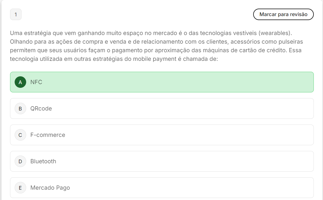 <p>1 Marcar para revisão Uma estratégia que vem ganhando muito espaço no mercado é o das tecnologias (wearables). Olhando para as ações de compra e venda e de relacionamento com os clientes, acessórios como pulseiras permitem que seus usuários façam o pagamento por aproximação das máquinas de cartão de crédito. Essa tecnologia utilizada em outras estratégias do mobile payment é chamada de: A NFC B QRcode C F-commerce D Bluetooth E Mercado Pago</p>