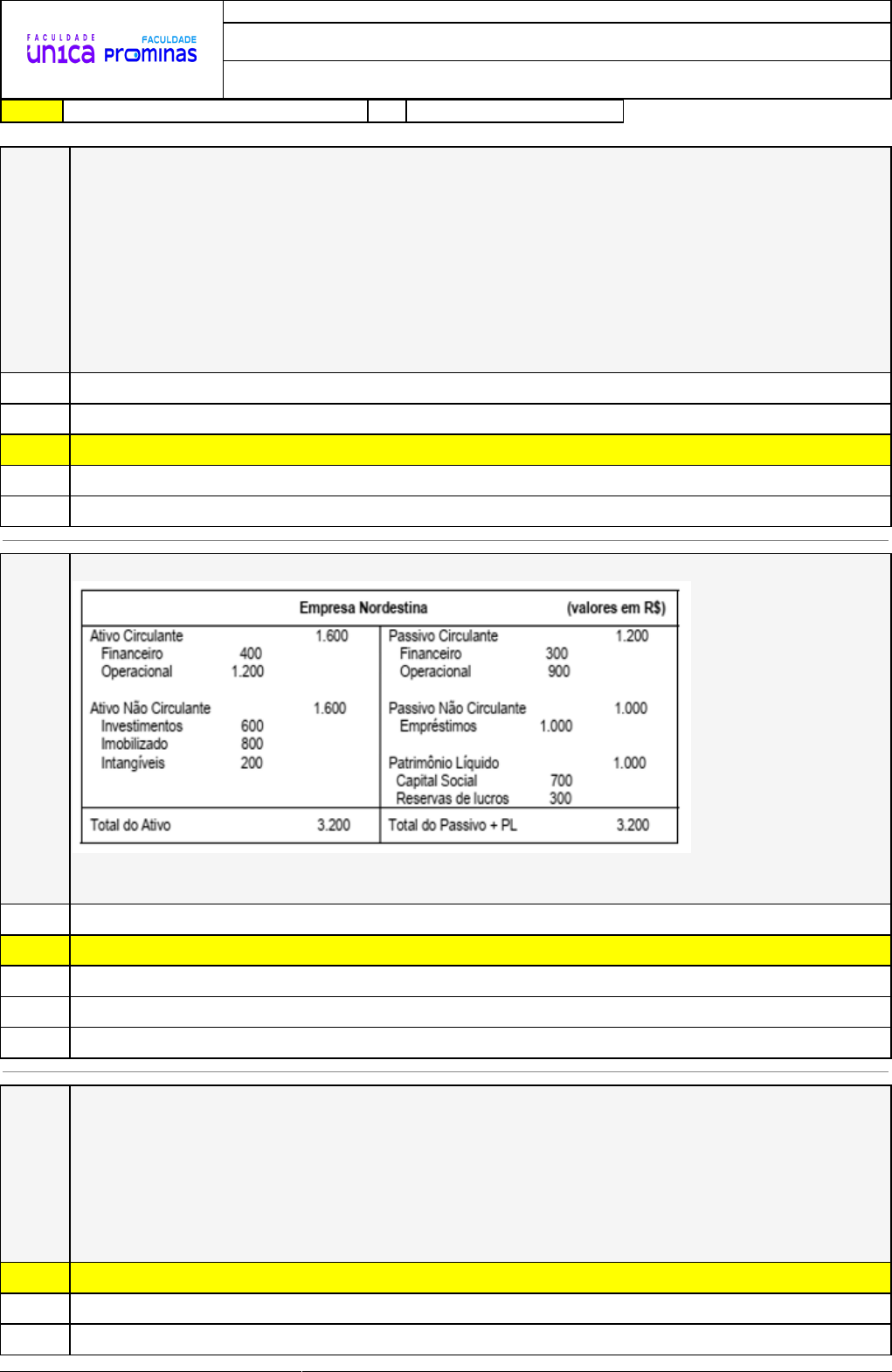 <p>05/09/2024 10:16:01 1/3</p><p>REVISÃO DE SIMULADO</p><p>Nome:</p><p>RODRIGO BARBOSA FERREIRA</p><p>Disciplina:</p><p>Análise das Demonstrações Contábeis</p><p>Respostas corretas são marcadas em amarelo X Respostas marcardas por você.</p><p>Questão</p><p>001 Leia com atenção as afirmativas:</p><p>I. Podemos citar como decisões que impactam negativamente a saúde financeira da</p><p>empresa, o aumento dos estoques, aumento dos prazos de vendas, inadimplência.</p><p>II. Algumas decisões impactam positivamente a saúde financeira da empresa, tais</p><p>como, redução de estoque, redução dos prazos de recebimento de vendas, aumento</p><p>dos prazos de fornecedores, etc.</p><p>III. Podemos citar como controles financeiros básicos: controle de caixa, bancos,</p><p>estoque, contas a pagar e a receber, etc.</p><p>Agora escolha a alternativa correta.</p><p>A) Todas as alternativas estão erradas.</p><p>X B) Somente as alternativas I e III estão corretas.</p><p>C) Todas as alternativas estão corretas.</p><p>D) Somente as alternativas II e III estão erradas.</p><p>E) Somente as alternativas I e II estão erradas.</p><p>Questão</p><p>002 A seguir é apresentado o Balanço Patrimonial da empresa Nordestina S.A.:</p><p>Com base no Balanço Patrimonial acima, é correto afirmar que a Necessidade de Capital</p><p>de Giro da empresa Nordestina S.A. é</p><p>X A) igual a R$1.200,00.</p><p>B) igual a R$300,00.</p><p>C) igual a R$400,00.</p><p>D) financiada com recursos de curto prazo.</p><p>E) financiada por ativo financeiro.</p><p>Questão</p><p>003 Com relação ao capital de giro líquido, analise as afirmativas e coloque V (verdadeiro) e</p><p>F (falso) e a seguir marque a sequência correta.</p><p>( ) Refere-se a um indicador de rentabilidade da empresa.</p><p>( ) Pode assumir valores negativos.</p><p>( ) Suas variações podem estar associadas a decisões e investimento de capital.</p><p>( ) Tem relação com a gestão financeira de curto prazo.</p><p>( ) Revela a capacidade de solvência da empresa.</p><p>X A) F; V; V; V; V.</p><p>B) F; F; F; F; V.</p><p>C) V; V; F; F; F.</p><p>05/09/2024 10:16:01 2/3</p><p>D) F; F; V; F; V.</p><p>E) V; V; F; V; F.</p><p>Questão</p><p>004 (Concurso 2018 Idecan CRF SP –) Uma empresa comercial apresenta os seguintes</p><p>saldos em suas demonstrações: Ativo Circulante = $ 75.000; Ativo Não Circulante = $</p><p>120.000; Passivo Circulante = $ 60.000; Passivo Não Circulante = $ 20.000; Patrimônio</p><p>Líquido = $ 115.000; e, Lucro Líquido do Exercício = $ 30.000. Diante dos dados</p><p>apresentados, conclui-se que o Capital de Giro disponível na e</p><p>A) $ 30.000.</p><p>X B) $ 15.000.</p><p>C) $ 75.000.</p><p>D) $ 85.000.</p><p>E) $ 35.000.</p><p>Questão</p><p>005 (Contador UEPB – 2012, UEPB/PacTcPB) A empresa “Estou com Dúvida Ltda.”, no mês</p><p>de dezembro de 2010, apresentou o seguinte Balanço Patrimonial:</p><p>Com relação ao Balanço Patrimonial acima, assinale a opção correta.</p><p>A) O capital circulante líquido foi reduzido em r$ 23.200 e o quociente de liquidez corrente</p><p>foi reduzido em 0,5164.</p><p>B) O capital circulante líquido foi reduzido em r$ 7.000 e o quociente de liquidez corrente</p><p>foi reduzido em 0,20.</p><p>C) O capital circulante líquido foi reduzido em r$ 21.200 e o quociente de liquidez corrente</p><p>foi reduzido em 0,06.</p><p>X D) O capital circulante líquido foi ampliado em r$ 13.200 e o quociente de liquidez corrente</p><p>foi ampliado em 0,10.</p><p>E) O capital circulante líquido foi ampliado em r$ 24.000 e o quociente de liquidez corrente</p><p>foi ampliado em 0,15.</p><p>Questão</p><p>006 (Exame de Suficiência – 2011-2 (CFC), adaptado) Uma empresa possui as seguintes</p><p>informações extraídas de seu Balancete de Verificação em 30 de junho de 2011, em</p><p>milhões de reais:</p><p>Em relação à variação do Capital Circulante Líquido da empresa, no primeiro semestre</p><p>de 2011, assinale a opção CORRETA.</p><p>A) A empresa teve uma variação positiva no Capital Circulante Líquido no montante de R$</p><p>19.125.000,00.</p><p>B) A empresa teve uma variação negativa no Capital Circulante Líquido no montante de R$</p><p>19.125.000,00.</p><p>C) A empresa teve uma variação negativa no Capital Circulante Líquido no montante de R$</p><p>11.125.000,00.</p><p>X D) A empresa teve uma variação positiva no Capital Circulante Líquido no montante de R$</p><p>11.125,000,00.</p><p>05/09/2024 10:16:01 3/3</p><p>E) A empresa teve uma variação negativa no Capital Circulante Líquido no montante de R$</p><p>17.500.000,00.</p><p>Questão</p><p>007 Informações de empresas do segmento da indústria têxtil:</p><p>Ao se considerar o índice de CCL (Capital circulante líquido), a empresa que apresenta o</p><p>maior e o menor resultado é respectivamente,</p><p>A) Alfa e Beta.</p><p>B) Gama e Épsilon.</p><p>C) Beta e Gama.</p><p>D) Épsilon e Beta.</p><p>X E) Delta e Alfa.</p><p>Questão</p><p>008 Observe na tabela abaixo os resultados alcançados por 06 empresas no ano de 2019.</p><p>Informe se é verdadeiro (V) ou falso (F) o que se afirma a seguir e assinale a alternativa</p><p>com a sequência correta.</p><p>I – Analisando o CCL, a NCG e a ST a situação de liquidez das empresas 5 e 6 podem ser</p><p>identificadas como sólida e péssima.</p><p>II - Analisando o CCL, a NCG e a ST da empresa 3 identificamos uma situação</p><p>insatisfatória de liquidez.</p><p>III – A empresa 4 apresenta uma situação difícil pois seu CCL é negativo e, o que é pior,</p><p>sua necessidade de capital de giro é positiva, já que não consegue financiar com seus</p><p>passivos operacionais a sua operação. Seu saldo em tesouraria é negativo, pois a</p><p>empresa está financiando sua necessidade de capital de giro com empréstimos a curto</p><p>prazo e seus passivos financeiros de curto prazo financiam inclusive parte de seu Ativo</p><p>Não Circulante, o que é d