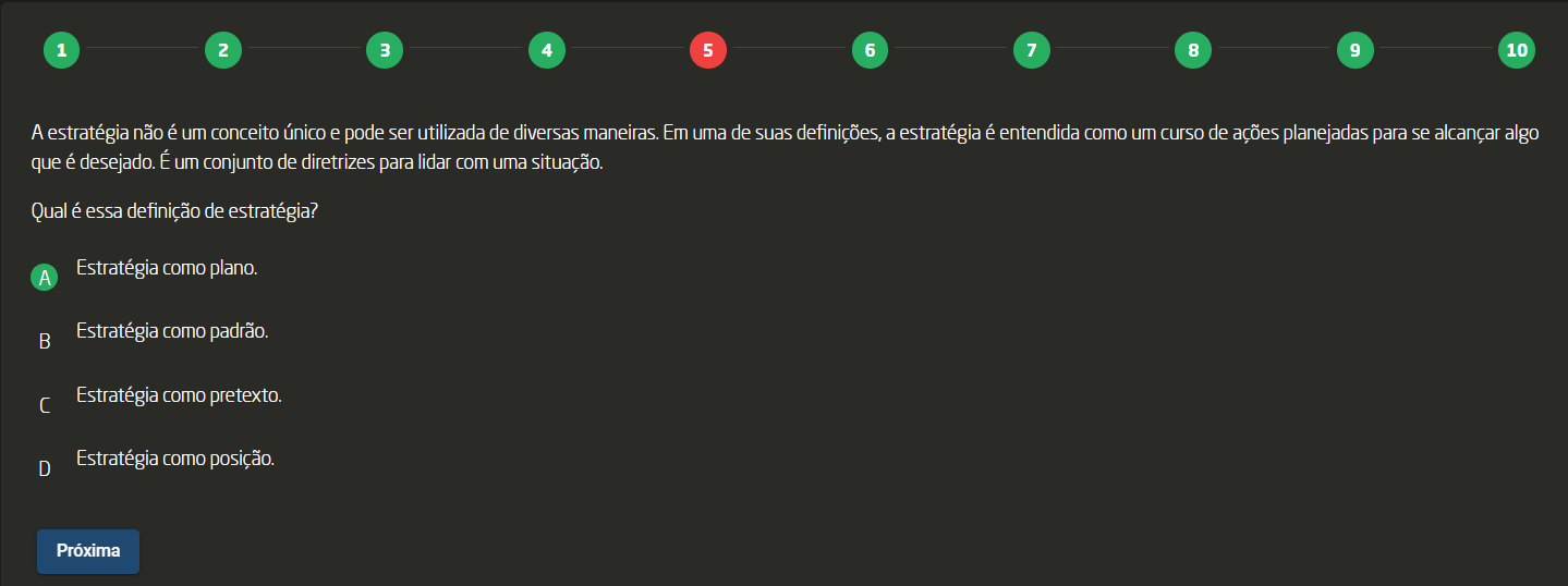 <p>1 2 3 4 5 6 7 8 10 A estratégia não é um conceito único e pode ser utilizada de diversas maneiras. Em uma de suas definições, a estratégia é entendida como um curso de ações planejadas para se alcançar algo que é desejado. É um conjunto de diretrizes para lidar com uma situação. Qual é essa definição de estratégia? A Estratégia como plano. B Estratégia como padrão. Estratégia como pretexto. D Estratégia como posição. Próxima</p>