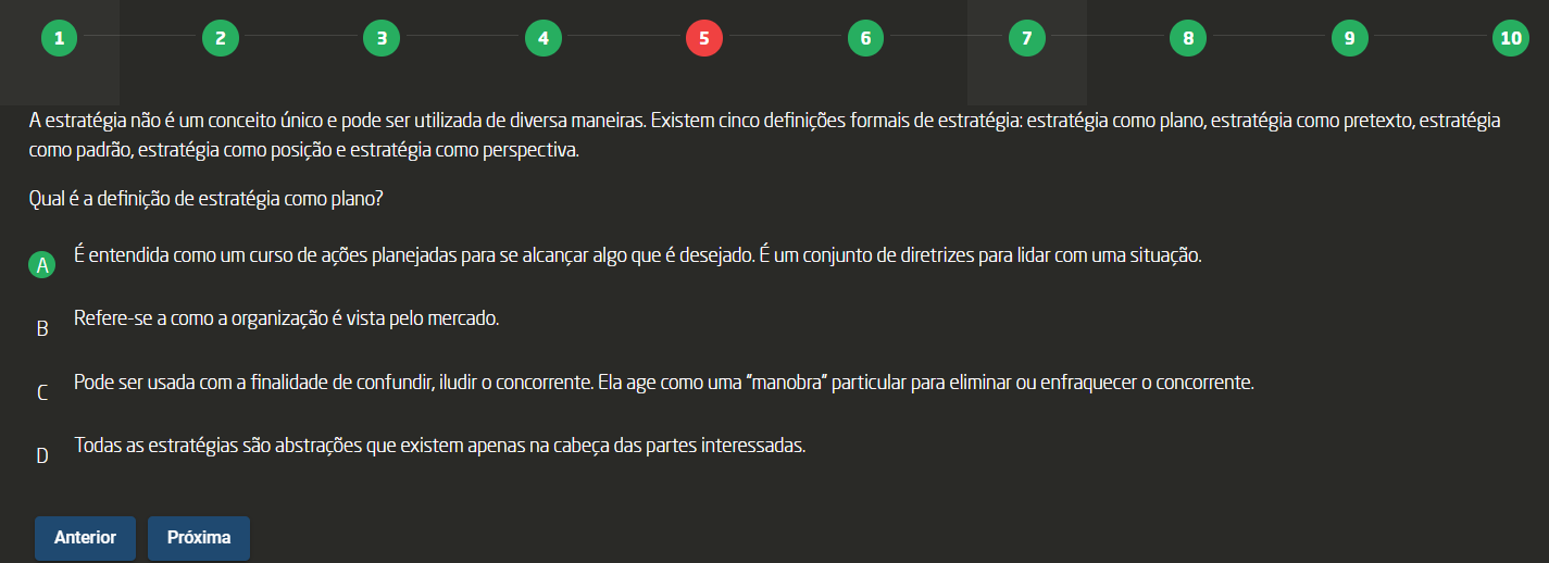 <p>1 2 3 4 5 6 7 8 9 10 A estratégia não é um conceito único e pode ser utilizada de diversa maneiras. Existem cinco definições formais de estratégia: estratégia como plano, estratégia como pretexto, estratégia como padrão, estratégia como posição e estratégia como perspectiva. Qual é a definição de estratégia como plano? A É entendida como um curso de ações planejadas para se alcançar algo que é desejado. É um conjunto de diretrizes para lidar com uma situação. B Refere-se a como a organização é vista pelo mercado. C Pode ser usada com a finalidade de confundir, iludir concorrente. Ela age como uma "manobra" particular para eliminar ou enfraquecer concorrente. D Todas as estratégias são abstrações que existem apenas na cabeça das partes interessadas. Anterior Próxima</p>