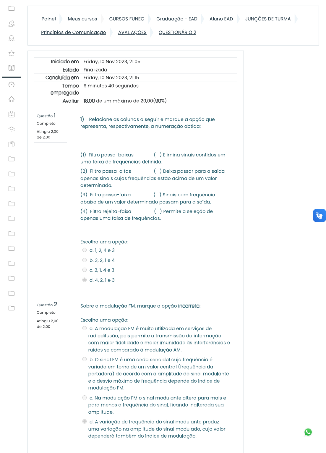 <p>Painel Meus cursos CURSOS FUNEC Graduação EAD Aluno EAD JUNÇÕES DE TURMA Princípios de Comunicação AVALIAÇÕES QUESTIONÁRIO 2 Iniciado em Friday, 10 Nov 2023, 21:05 Estado Finalizada Concluída em Friday, 10 Nov 2023, 21:15 Tempo 9 minutos 40 segundos empregado 18,00 de um máximo de 20,00(90%) Questão 1 1) Relacione as colunas a seguir e marque a opção que Completo representa, respectivamente, a numeração obtida: Atingiu 2,00 de 2,00 (1) Filtro passa-baixas ( ) Elimina sinais contidos em uma faixa de frequências definida. (2) Filtro passa-altas ( ) Deixa passar para a saída apenas sinais cujas frequências estão acima de um valor determinado. (3) Filtro passa-faixa ( ) Sinais com frequência abaixo de um valor determinado passam para a saída. (4) Filtro rejeita-faixa ( ) Permite a seleção de apenas uma faixa de frequências. Escolha uma opção: a. 1, 2, 4 e 3 b. 3, 2, 1 e 4 C. 2, 1, 4 e 3 d. 4, 2, 1 e 3 Questão 2 Sobre a modulação FM, marque a opção incorreta: Completo Atingiu 2,00 Escolha uma opção: de 2,00 a. A modulação FM é muito utilizada em serviços de radiodifusão, pois permite a transmissão da informação com maior fidelidade e maior imunidade às interferências e ruídos se comparado à modulação AM. b. sinal FM é uma onda senoidal cuja frequência é variada em torno de um valor central (frequência da portadora) de acordo com a amplitude do sinal modulante e desvio máximo de frequência depende do índice de modulação FM. C. Na modulação FM o sinal modulante altera para mais e para menos a frequência do sinal, ficando inalterada sua amplitude. d. A variação de frequência do sinal modulante produz uma variação na amplitude do sinal modulado, cujo valor dependerá também do índice de modulação.</p><p>Questão 3 Para o filtro passa-baixa a seguir, marque a opção que Completo representa a frequência de corte, considerando R = 100 = Atingiu 2,00 5 nF. de 2,00 R + + V C i Escolha uma opção: a. 500,0 GHz b. 15,9 kHz C. 2,0 MHz d. 318,3 kHz</p><p>Questão 4 Os gráficos a seguir representam, respectivamente, o sinal da Completo portadora eo(t), o sinal modulante (informação) em(t) e o sinal Atingiu 2,00 modulado e(t): de 2,00 0 a) em(t) 0 0 c) Pelas formas de ondas contidas nos gráficos, podemos concluir que: Escolha uma opção: a. tipo de modulação é FM, uma vez que a informação altera a frequência do sinal modulado e não a amplitude. b. tipo de modulação é FM, uma vez que a informação altera a amplitude do sinal modulado e não a frequência. C. tipo de modulação é AM, uma vez que a informação altera a frequência do sinal modulado e não a amplitude. d. tipo de modulação é AM, uma vez que a informação altera a amplitude do modulado e não a frequência. Questão 5 Sobre a multiplexação de canais, podemos afirmar que: Completo Atingiu 2,00 Escolha uma opção: de 2,00 a. A multiplexação permite receber uma única banda base e separar as informações em diversos canais individuais. b. A multiplexação permite a transmissão de dois ou mais canais simultaneamente, por meio de um único meio de transmissão, sem que um sinal interfira no outro. C. A multiplexação por divisão de tempo, consistem em separar cada canal em uma frequência diferente, permitindo assim que diversos canais transmitem informações sem que um interfira no outro. d. A multiplexação consiste em modificar uma onda portadora para que esta receba uma informação a ser transmitida.</p><p>Questão 6 Na modulação AM (amplitude modulation) a amplitude do Completo sinal é alterada para carregar a informação. Considerando a Atingiu 2,00 modulação AM-DSB (Modulação em amplitude com faixa de 2,00 lateral dupla), análise o espectro do sinal modulado a seguir e marque a opção que representa respectivamente a amplitude máxima da tensão da onda portadora (Eo) e o índice de modulação (m): 4 3.5 3 2.5 2 1.5 1 0.5 580 585 590 595 600 605 610 615 Frequencia (kHz) Escolha uma opção: a. = 1,5 V; m = 0,75 b. Eo = 1,5 V; m = 0,03 C. = 2 V; m = 0,25 d. Eo = 2 m = 0,50 Questão 7 Marque a seguir a opção incorreta sobre a transmissão de Completo informação na forma digital. Atingiu 2,00 de 2,00 Escolha uma opção: a. Singis digitais não permitem à criptografia, ou seja, os podem ser facilmente recebidos e interpretados por elementos indesejáveis ao sistema. b. Na transmissão digital um código de correção de erros permite que o receptor detecte erros que podem ocorrer em qualquer lugar da mensagem, fazendo a sua correção ou eliminando a informação defeituosa. C. A informação digital pode ser facilmente colocada em circuitos de memória, de forma mais compacta, eficiente e confiável do que o armazenamento de sinais analógicos. d. As comunicações digitais são realizadas através de pulsos (bits) e, por isso, são mais seguras e bem menos vulneráveis à ação de ruído elétrico do que as comunicações analógicas.</p><p>Questão 8 A figura a seguir mostra um gráfico no domínio do tempo de Completo um sinal AM modulado. Marque a opção que representa Atingiu 2,00 aproximadamente índice de modulação (m) deste sinal: de 2,00 0.5 0.3 0.2 0.1 0 -0.2 -0.3 -0,4 -0.5 0 0.1 0.2 0.3 0.4 0.5 0.6 tempo (segundos) Escolha uma opção: a.m 20% b.m 33% c.m 80%</p><p>Questão 9 A figura a seguir ilustra diagrama de Bode de um filtro, sobre Completo qual podemos afirmar que: Atingiu 2,00 de 2,00 A 3 dB Escolha uma a. Trata-se de um filtro rejeita-faixa, onde é a frequência rejeitada. b. Trata-se de um filtro passa-faixa, onde é a frequência de ressonância. C. Trata-se de um filtro passa-baixa, onde é a frequência de corte. d. Trata-se de um filtro passa-alta, onde é a frequência de corte. Questão 10 Sobre o desvio máximo de frequência, podemos afirmar que: Completo Atingiu 0,00 Escolha uma opção: de 2,00 a. desvio máximo de frequência determina qual o valor máximo da amplitude do sinal FM de