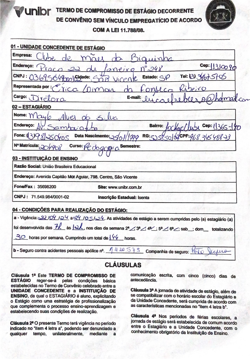 <p>RELATÓRIO FINAL DAS ATIVIDADES REALIZADAS</p><p>2024</p><p>Rua: Sorocabana, nº 59 - Centro, São Vicente/SP – Cep.: 11310-450</p><p>www.unibr.com.br</p><p>Relatório de Experiências: Observação, Participação e Regência – Gestão Escolar</p><p>Carga horária a ser realizada: 100 horas</p><p>Estudante: Mayla Alves da Silva R.A.: 204908</p><p>Curso: Pedagogia Semestre: 8º</p><p>Professor(a) Orientador(a) do Estágio: Regina Duarte</p><p>Unidade Concedente: N.E.I Xodó da Vovó</p><p>Professor(a) Supervisor do Estágio na unidade escolar: Érica Loimar da Fonseca Ribeiro</p><p>DESCREVA AS ATIVIDADES DE OBSERVAÇÃO REALIZADAS: Gestão Escolar</p><p>Data Hora (início e término) Descreva, detalhadamente, as atividades realizadas no dia.</p><p>/04/2024 7h á 12h Observei a realização de matriculas, realizações de bilhetes escolares,</p><p>digitalização de documentos dos alunos e atentimento telefonico e por</p><p>e-mail ou whatzapp.</p><p>04/2024 7h á 12h Elaboração de graficos de rendimento escolar, digitação de notas no</p><p>sistema, atendimento aos pais.</p><p>/04/2024 7h á 12h Digitação do planejamento dos professores no sistema, contagem de</p><p>faltas dos alunos no diário escolar, atendimento telefonico e whtazapp.</p><p>/04/2024 7h á 12h Reunião pedagógica, digitalização da pauta de reunião pedagogica.</p><p>/05/2024 7h á 12h Digitalização dos livros da biblioteca e sua atualização, e organização.</p><p>/05/2024 7h á 12h Reunião de desenvolvimento por setor (secretaria), digitalização da</p><p>ATA da reunião pedagógica.</p><p>/05/2024 7h á 12h Atendimento aos pais que havia horario marcado para conhecer a</p><p>escola, matricula, organização de documentos de alunos e</p><p>professores.</p><p>/05/2024 7h á 12h Digitalização dos documentos dos professores, cotação de preços de</p><p>uniformes escolares e materias.</p><p>RELATÓRIO FINAL DAS ATIVIDADES REALIZADAS</p><p>2024</p><p>Rua: Sorocabana, nº 59 - Centro, São Vicente/SP – Cep.: 11310-450</p><p>www.unibr.com.br</p><p>/05/2024 7h á 12h Atentimento aos pais para relatar dificuldades do aluno em sala de</p><p>aula, digitalização da ATA do atendimento.</p><p>/05/2024 7h á 12h Digitalização da ATA de ocorrencia, digitalização e imopreção de</p><p>bilhetes.</p><p>DESCREVA AS ATIVIDADES DE PARTICIPAÇÃO REALIZADAS: Gestão Escolar</p><p>Data Hora (início e término) Descreva, detalhadamente, as atividades realizadas no dia.</p><p>13/05/2024 7h á 12h Auxílio na organização do almoxarifado.</p><p>14/05/2024 7h á 12h Digitação de planejamento de professores.</p><p>15/05/2024 7h á 12h Organização de planilha da biblioteca.</p><p>16/05/2024 7h á 12h Confecção de planilhas do almoxarifado.</p><p>17/05/2024 7h á 12h Digitação de relatórios.</p><p>20/05/2024 7h á 12h Confecção de bilhetes escolares.</p><p>21/05/2024 7h á 12h Acompanhamento de reunião de professores com a coordenação, e</p><p>relatório da reunião em ATA.</p><p>22/05/2024 7h á 12h Organização da Biblioteca.</p><p>23/05/2023 7h á 12h Gráficos de rendimento escolar.</p><p>24/05/2024 7h á 12h Digitação de notas no sistema.</p><p>Total de horas realizadas em Observação,</p><p>Participação e Regência – Gestão Escolar:</p><p>120</p><p>RELATÓRIO FINAL DAS ATIVIDADES REALIZADAS</p><p>2024</p><p>Rua: Sorocabana, nº 59 - Centro, São Vicente/SP – Cep.: 11310-450</p><p>www.unibr.com.br</p><p>PARECER FINAL SOBRE AS ATIVIDADES DE ESTÁGIO QUE FORAM DESENVOLVIDAS.</p><p>DESCREVA SUAS EXPERIÊNCIAS VIVENCIADAS NO ESTÁGIO, RELACIONANDO COM OS</p><p>CONTEÚDOS QUE FORAM ABORDADOS NAS DISCIPLINAS AO LONGO DO CURSO.</p><p>O estágio de gestão foi enriquecedor, proporcionando diversos aprendizados, onde pude observar,</p><p>participar e aplicar práticas administrativas e pedagógicas que me permitiram entender de forma</p><p>prática o funcionamento e a organização de uma instituição de ensino.</p><p>Durante a fase de observação, acompanhei de perto a rotina administrativa da escola, incluindo o</p><p>planejamento e a execução das atividades diárias. Observei as estratégias de gestão utilizadas</p><p>pelo diretor e pela equipe administrativa, compreendendo como são tomadas as decisões</p><p>estratégicas e operacionais. Também participei de reuniões com a equipe pedagógica, onde foram</p><p>discutidos temas como o planejamento curricular, a avaliação dos alunos e a organização de</p><p>eventos escolares. Esta etapa foi fundamental para entender a complexidade e a importância de</p><p>uma gestão eficiente para o bom funcionamento da escola.</p><p>Durante a fase de observação, acompanhei de perto a rotina administrativa da escola, incluindo o</p><p>planejamento e a execução das atividades diárias. Observei as estratégias de gestão utilizadas</p><p>pelo diretor e pela equipe administrativa, compreendendo como são tomadas as decisões</p><p>estratégicas e operacionais. Também participei de reuniões com a equipe pedagógica, onde foram</p><p>discutidos temas como o planejamento curricular, a avaliação dos alunos e a organização de</p><p>eventos escolares. Esta etapa foi fundamental para entender a complexidade e a importância de</p><p>uma gestão eficiente para o bom funcionamento da escola.</p><p>Na fase de participação, atuei diretamente no apoio às atividades administrativas, colaborando na</p><p>organização de documentos, na gestão de recursos e no atendimento a pais e alunos. Auxiliei na</p><p>elaboração de relatórios administrativos, no controle de matrículas e na coordenação de projetos</p><p>escolares. Essa experiência prática permitiu-me desenvolver habilidades de organização,</p><p>comunicação e resolução de problemas.</p><p>O estágio proporcionou uma experiência rica e diversificada, permitindo a aplicação prática dos</p><p>conteúdos teóricos adquiridos no curso de Pedagogia, com ênfase em gestão escolar. A