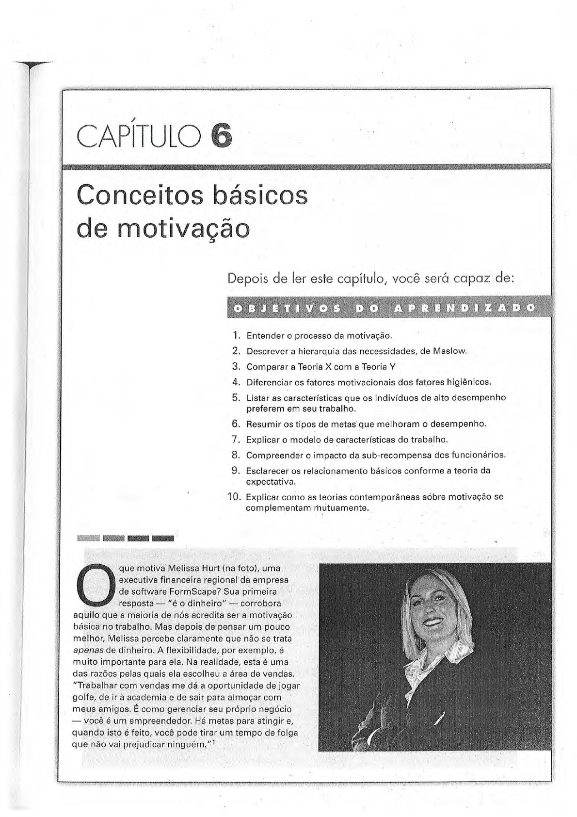 <p>CAPÍTULO 6 Conceitos básicos de motivação Depois de ler este capítulo, você será capaz de: DO 1. Entender o processo da motivação. 2. Descrever a hierarquia das necessidades, de Maslow. 3. Comparar a Teoria X com a Teoria Y 4. Diferenciar os fatores motivacionais dos fatores higiênicos. 5. Listar as características que os indivíduos de alto desempenho preferem em seu trabalho. 6. Resumir os tipos de metas que melhoram o desempenho. 7. Explicar o modelo de características do trabalho. 8. Compreender o impacto da sub-recompensa dos funcionários. 9. Esclarecer os relacionamento básicos conforme a teoria da expectativa. 10. Explicar como as teorias contemporâneas motivação se complementam mutuamente. que motiva Melissa Hurt (na foto), uma executiva financeira regional da empresa de software FormScape? Sua primeira resposta "é o dinheiro" - corrobora aquilo que a maioria de nós acredita ser a motivação básica no trabalho. Mas depois de pensar um pouco melhor, Melissa percebe claramente que não se trata apenas de dinheiro. A flexibilidade, por exemplo, é muito importante para ela. Na realidade, esta é uma das razões pelas quais ela escolheu a área de vendas. "Trabalhar com vendas me dá a oportunidade de jogar golfe, de à academia e de sair para almoçar com meus amigos. É como gerenciar seu próprio negócio você é um empreendedor. Há metas para atingir e, quando isto é feito, você pode tirar um tempo de folga que não vai prejudicar</p><p>CAPÍTULO 6 Conceitos básicos de motivação 133 Teoria da hierarquia das necessidades Podemos afirmar que a mais conhecida teoria sobre motivação é, provavelmente, a hierarquia das necessida- des, de Abraham Maslow.5 Segundo este autor, dentro de cada ser humano existe uma hierarquia de cinco cate- gorias de necessidades. São elas: 1. Fisiológica: inclui fome, sede, abrigo, sexo e outras necessidades do corpo. 2. Segurança: inclui segurança e proteção contra danos físicos e emocionais. 3. inclui afeição, aceitação, amizade e sensação de pertencer a um grupo. 4. Estima: inclui fatores internos de estima, como respeito próprio, realização e autonomia; e fatores externos de estima, como status, reconhecimento e atenção. 5. Auto-realização: a intenção de tornar-se tudo aquilo que se é capaz de ser; inclui crescimento, alcance do seu próprio potencial e autodesenvolvimento Na medida em que cada uma destas necessidades é atendida, a próxima torna-se a dominante. Como mostra Quadro 6-1, indivíduo move-se para topo da hierarquia, apresentada em forma de pirâmide. Do ponto de vista da motivação, esta teoria sugere que, embora jamais uma necessidade possa ser satisfeita completamente, uma necessidade substancialmente satisfeita extingue a motivação. Assim, de acordo com a teoria de Maslow, para motivar alguém é preciso saber em que nível da hierarquia a pessoa se encontra no momento e focar a satisfação naquele nível ou no patamar imediatamente superior. Maslow separou as cinco categorias de necessidades em patamares mais altos e mais baixos. As necessidades fisiológicas e de segurança são descritas como necessidades de nível mais baixo e aquelas relacionadas à auto-rea- lização são chamadas de necessidades de nível mais alto. A diferenciação entre estes dois níveis parte da premissa de que as necessidades de nível mais alto são satisfeitas internamente (dentro do indivíduo) enquanto as de nível mais baixo são satisfeitas quase sempre externamente (através de coisas como remuneração, acordos sindicais e permanência no emprego). A teoria das necessidades de Maslow recebeu amplo reconhecimento, especialmente por parte de executi- vos formados na prática. Isto pode ser atribuído à lógica intuitiva da teoria e à facilidade que ela oferece para a compreensão. Infelizmente, contudo, as pesquisas não validam, de maneira geral, a teoria. Maslow não for- nece comprovação empírica substancial e vários outros estudos que buscaram validar a teoria não conseguiram encontrar embasamento para ela.6 As antigas teorias, especialmente aquelas intuitivamente lógicas, parecem não morrer facilmente. Embora a hierarquia das necessidades e sua terminologia permaneçam populares entre os executivos, existe pouco embasa- mento para afirmar que as necessidades são organizadas de acordo com as dimensões propostas por Maslow, ou que uma necessidade atendida ativa um movimento em direção a um novo nível de Teoria e Douglas McGregor propôs duas visões distintas do ser humano: uma basicamente negativa, chamada de Teoria X; e outra basicamente positiva, chamada de Teoria Depois de observar a forma como os executivos tratavam seus funcionários, McGregor concluiu que a visão que os executivos têm da natureza dos seres humanos se baseia em certos agrupamentos de premissas e que eles tendem a moldar seu próprio comportamento em relação aos funcionários conforme este conjunto de premissas. QUADRO 6-1 Hierarquia das Necessidades, de Maslow realização Estima Social Segurança Fisiológica Fonte: A. H. Maslow, Motivation and personality, 3 R. Fragere J. Fadiman (orgs.) 1997. Adaptado com permissão da Pearson Education, Inc., Upper Salle River, New Jersey.</p><p>134 Comportamento Organizacional Sob a Teoria X, as quatro premissas dos executivos são: 1. Os funcionários não gostam de trabalhar por sua própria natureza e tentarão evitar trabalho sempre que 2. Como eles não gostam de trabalhar, precisam ser coagidos, controlados ou ameaçados com punições para que atinjam as metas. 3. Os funcionários evitam responsabilidades e buscam orientação formal sempre que possível. 4. A maioria dos trabalhadores coloca a segurança acima de todos os fatores associados ao trabalho e mostra pouca ambição. Em contraste com essas visões negativas, McGregor lista as quatro premissas positivas, sob a chamada Teoria Y: 1. Os funcionários podem achar trabalho algo tão natural quan