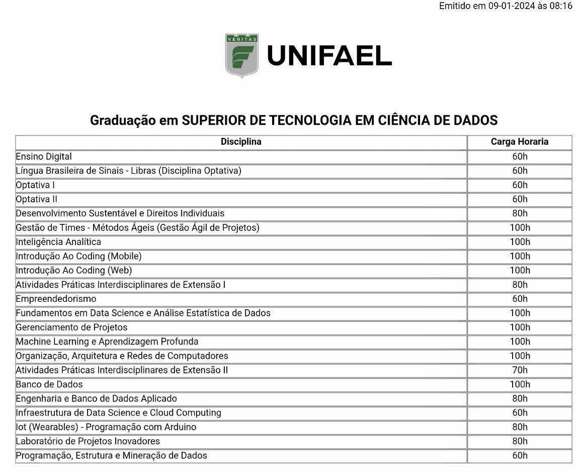 <p>Emitido em 09-01-2024 às 08:16 VERITAS UNIFAEL Graduação em SUPERIOR DE TECNOLOGIA EM CIÊNCIA DE DADOS Disciplina Carga Horaria Ensino Digital 60h Língua Brasileira de Sinais - Libras (Disciplina Optativa) 60h Optativa 60h Optativa 60h Desenvolvimento Sustentável e Direitos Individuais 80h Gestão de Times - Métodos Ágeis (Gestão Ágil de Projetos) 100h Inteligência Analítica 100h Introdução Ao Coding (Mobile) 100h Introdução Ao Coding (Web) 100h Atividades Práticas Interdisciplinares de Extensão 80h Empreendedorismo 60h Fundamentos em Data Science e Análise Estatística de Dados 100h Gerenciamento de Projetos 100h Machine Learning e Aprendizagem Profunda 100h Organização, Arquitetura e Redes de Computadores 100h Atividades Práticas Interdisciplinares de Extensão 70h Banco de Dados 100h Engenharia e Banco de Dados Aplicado 80h Infraestrutura de Data Science e Cloud Computing 60h lot (Wearables) - Programação com Arduino 80h Laboratório de Projetos Inovadores 80h Programação, Estrutura e Mineração de Dados 60h</p>