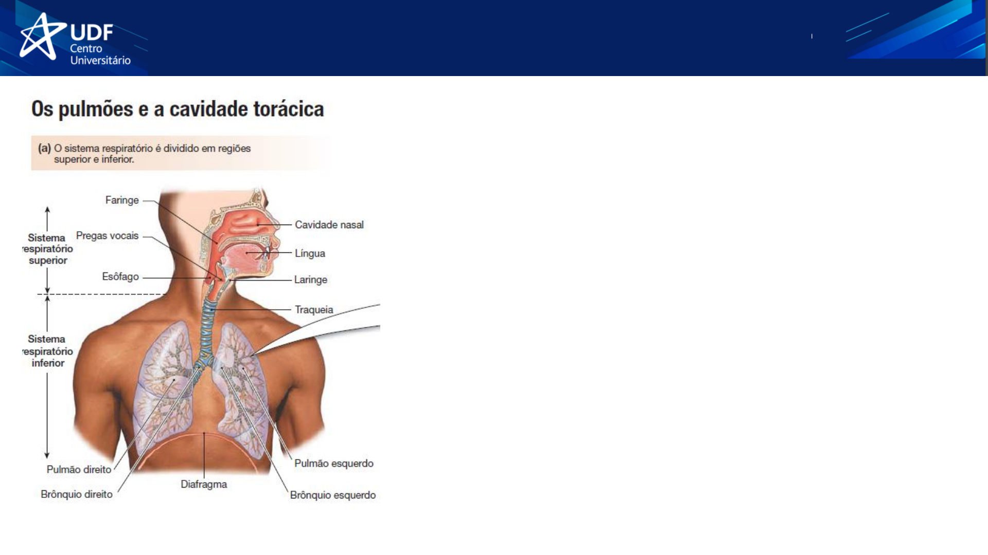 <p>Sistema respiratório –</p><p>parte 1</p><p>Professora Déborah Morais</p><p>dmorais@udf.edu.br</p><p>https://www.youtube.com/watch?v=ayBp8QPWkwc</p><p>VEJA SEM SOM</p><p>https://www.youtube.com/watch?v=ayBp8QPWkwc</p><p>Respiração celular</p><p>Reação intracelular do oxigênio</p><p>com moléculas orgânicas para</p><p>produzir CO2, água e energia na</p><p>forma de ATP</p><p>Respiração externa</p><p>Movimento de gases entre o meio</p><p>externo e as células do corpo.</p><p>Respiração celular</p><p>Reação intracelular do oxigênio</p><p>com moléculas orgânicas para</p><p>produzir CO2, água e energia na</p><p>forma de ATP</p><p>Respiração externa</p><p>Movimento de gases entre o meio</p><p>externo e as células do corpo.</p><p>Respiração externaMovimento de gases entre o meio</p><p>externo e as células do corpo.</p><p>Respiração externaMovimento de gases entre o meio</p><p>externo e as células do corpo.</p><p>Respiração externaMovimento de gases entre o meio</p><p>externo e as células do corpo.</p><p>Respiração externa</p><p>Movimento de gases entre o meio</p><p>externo e as células do corpo.</p><p>A respiração externa pode ser subdividida em</p><p>quatro processos integrados</p><p>Respiração externa</p><p>Movimento de gases entre o meio</p><p>externo e as células do corpo.</p><p>1. A troca de ar entre a atmosfera e os</p><p>pulmões.</p><p>Conhecido como ventilação, ou</p><p>respiração. Inspiração (inalação) e o</p><p>movimento do ar para dentro dos</p><p>pulmões. Expiração (exalação) e o</p><p>movimento de ar para fora dos pulmões.</p><p>2. A troca de O2 e de CO2 entre os</p><p>pulmões e o sangue.</p><p>3. O transporte de O2 e CO2 pelo sangue.</p><p>4. A troca de gases entre o sangue e as</p><p>células.</p><p>5. Eliminar água e calor</p><p>A respiração externa pode ser subdividida em</p><p>quatro processos integrados</p><p>CONTRIBUIÇÕES DO SISTEMA RESPIRATÓRIO PARA</p><p>MANUTENÇÃO DA HOMEOSTASIA</p><p>Funções primárias do Sistema Respiratório</p><p>1. Troca de gases entre a atmosfera e o sangue.</p><p>O corpo traz o O2 e o distribui para os tecidos, eliminando o CO2 produzido pelo metabolismo.</p><p>2. Regulação homeostática do pH do corpo.</p><p>Os pulmões podem alterar o pH corporal retendo ou eliminando seletivamente o CO2.</p><p>3. Proteção contra patógenos e substâncias irritantes inalados.</p><p>Assim como todos os outros epitélios que tem contato com o meio externo, o epitélio respiratório e</p><p>bem suprido com mecanismos de defesa que aprisionam e destroem substancias potencialmente</p><p>nocivas antes que elas possam entrar no corpo.</p><p>4. Vocalização.</p><p>O ar move-se através das pregas vocais, criando vibrações usadas para falar, cantar e outras formas</p><p>de comunicação.</p><p>CONTRIBUIÇÕES PARA MANUTENÇÃO DA HOMEOSTASIA</p><p>Funções primárias do Sistema Respiratório</p><p>1. Troca de gases entre a atmosfera e o sangue.</p><p>O corpo traz o O2 e o distribui para os tecidos,</p><p>eliminando o CO2 produzido pelo metabolismo.</p><p>CONTRIBUIÇÕES PARA MANUTENÇÃO DA HOMEOSTASIA</p><p>Funções primárias do Sistema Respiratório</p><p>2. Regulação homeostática do pH do corpo.</p><p>Os pulmões podem alterar o pH corporal retendo ou eliminando</p><p>seletivamente o CO2.</p><p>Ocorre no sangue</p><p>CONTRIBUIÇÕES PARA MANUTENÇÃO DA HOMEOSTASIA</p><p>Participação das hemácias na regulação do</p><p>pH sanguíneo</p><p> As hemácias contêm a enzima anidrase carbônica (CA);</p><p> Catalisa a conversão de dióxido de carbono e água em ácido</p><p>carbônico, que, por sua vez, se dissocia em H+ e HCO3</p><p> Importância: (1) permite que cerca de 70% do CO2 seja transportado</p><p>no plasma sanguíneo das células teciduais para os pulmões na forma</p><p>de HCO3 e (2) serve como um importante tampão no líquido</p><p>extracelular.</p><p>Relembrando...</p><p>Funções primárias do Sistema Respiratório</p><p>3. Proteção contra patógenos e substâncias irritantes inalados.</p><p>Assim como todos os outros epitélios que tem contato com o meio</p><p>externo, o epitélio respiratório e bem suprido com mecanismos de</p><p>defesa que aprisionam e destroem substâncias potencialmente nocivas</p><p>antes que elas possam entrar no corpo.</p><p>CONTRIBUIÇÕES PARA MANUTENÇÃO DA HOMEOSTASIA</p><p>Passagem pelas fossas nasais:</p><p>• Filtram – pelos;</p><p>• Aquecem – irrigadas de sangue que aquecem o ar;</p><p>• Umidifica – secreções (muco).</p><p>Funções primárias do Sistema Respiratório</p><p>3. Proteção contra patógenos e substâncias irritantes inalados.</p><p>Assim como todos os outros epitélios que tem contato com o meio</p><p>externo, o epitélio respiratório e bem suprido com mecanismos de</p><p>defesa que aprisionam e destroem substâncias potencialmente nocivas</p><p>antes que elas possam entrar no corpo.</p><p>CONTRIBUIÇÕES PARA MANUTENÇÃO DA HOMEOSTASIA</p><p>Espirro Tosse</p><p>Espirro</p><p>Contração espasmódica dos músculos</p><p>expiratórios que expele forçosamente o ar</p><p>através do nariz e da boca.</p><p>O estímulo: irritação da túnica mucosa do</p><p>nariz.</p><p>Tosse</p><p>Inspiração profunda e prolongada, seguida pelo</p><p>fechamento completo da glote (laringe), o que</p><p>resulta em expiração forte que empurra</p><p>bruscamente a glote aberta e envia um jato de</p><p>ar através das vias respiratórias superiores.</p><p>O estímulo: corpo estranho alojado na laringe,</p><p>traqueia ou epiglote.</p><p>Funções primárias do Sistema Respiratório</p><p>4. Vocalização.</p><p>O ar move-se através das pregas vocais,</p><p>criando vibrações usadas para falar, cantar</p><p>e outras formas de comunicação.</p><p>Pregas vocais estão na laringe.</p><p>CONTRIBUIÇÕES PARA MANUTENÇÃO DA HOMEOSTASIA</p><p>Funções primárias do Sistema Respiratório</p><p>4. Vocalização.</p><p>O ar move-se atra