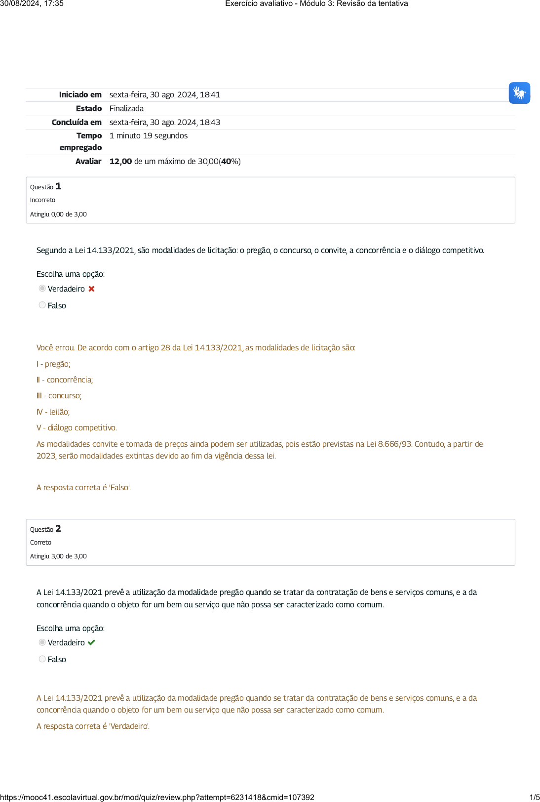 <p>Iniciado em sexta-feira, 30 ago. 2024, 18:41</p><p>Estado Finalizada</p><p>Concluída em sexta-feira, 30 ago. 2024, 18:43</p><p>Tempo</p><p>empregado</p><p>1 minuto 19 segundos</p><p>Avaliar 12,00 de um máximo de 30,00(40%)</p><p>Questão 1</p><p>Incorreto</p><p>Atingiu 0,00 de 3,00</p><p>Questão 2</p><p>Correto</p><p>Atingiu 3,00 de 3,00</p><p>Segundo a Lei 14.133/2021, são modalidades de licitação: o pregão, o concurso, o convite, a concorrência e o diálogo competitivo.</p><p>Escolha uma opção:</p><p>Verdadeiro </p><p>Falso</p><p>Você errou. De acordo com o artigo 28 da Lei 14.133/2021, as modalidades de licitação são:</p><p>I - pregão;</p><p>II - concorrência;</p><p>III - concurso;</p><p>IV - leilão;</p><p>V - diálogo competitivo.</p><p>As modalidades convite e tomada de preços ainda podem ser utilizadas, pois estão previstas na Lei 8.666/93. Contudo, a partir de</p><p>2023, serão modalidades extintas devido ao �m da vigência dessa lei.</p><p>A resposta correta é 'Falso'.</p><p>A Lei 14.133/2021 prevê a utilização da modalidade pregão quando se tratar da contratação de bens e serviços comuns, e a da</p><p>concorrência quando o objeto for um bem ou serviço que não possa ser caracterizado como comum.</p><p>Escolha uma opção:</p><p>Verdadeiro </p><p>Falso</p><p>A Lei 14.133/2021 prevê a utilização da modalidade pregão quando se tratar da contratação de bens e serviços comuns, e a da</p><p>concorrência quando o objeto for um bem ou serviço que não possa ser caracterizado como comum.</p><p>A resposta correta é 'Verdadeiro'.</p><p>30/08/2024, 17:35 Exercício avaliativo - Módulo 3: Revisão da tentativa</p><p>https://mooc41.escolavirtual.gov.br/mod/quiz/review.php?attempt=6231418&cmid=107392 1/5</p><p>Questão 3</p><p>Correto</p><p>Atingiu 3,00 de 3,00</p><p>Questão 4</p><p>Correto</p><p>Atingiu 3,00 de 3,00</p><p>Um dos objetivos do processo licitatório é incentivar a inovação e o desenvolvimento nacional sustentável.</p><p>Escolha uma opção:</p><p>Verdadeiro </p><p>Falso</p><p>Você acertou. De acordo com o artigo 11 da nova lei de licitações, o processo licitatório tem por objetivos:</p><p>I – assegurar a seleção da proposta apta a gerar o resultado de contratação mais vantajoso para a Administração Pública, inclusive no</p><p>que se refere ao ciclo de vida do objeto;</p><p>II – assegurar tratamento isonômico entre os licitantes, bem como a justa competição;</p><p>III – evitar contratações com sobrepreço ou com preços manifestamente inexequíveis e superfaturamento na execução dos contratos;</p><p>IV – incentivar a inovação e o desenvolvimento nacional sustentável.</p><p>A resposta correta é 'Verdadeiro'.</p><p>Considerando os princípios constitucionais da ampla defesa e do devido processo legal, o licitante pode recorrer contra habilitação e</p><p>julgamento das propostas a qualquer tempo sempre que se considerar prejudicado durante o processo licitatório.</p><p>Escolha uma opção:</p><p>Verdadeiro</p><p>Falso </p><p>Resposta correta. Veja que o recurso contra habilitação e julgamento das propostas é único e se não for apresentado no momento</p><p>próprio ocorrerá a preclusão (perda da faculdade de praticar um ato processual).</p><p>Art. 165. Dos atos da Administração decorrentes da aplicação desta Lei cabem:</p><p>I – recurso, no prazo de 3 (três) dias úteis, contado da data de intimação ou de lavratura da ata, em face de:</p><p>a) ato que de�ra ou inde�ra pedido de pré-quali�cação de interessado ou de inscrição em registro cadastral, sua alteração ou</p><p>cancelamento;</p><p>b) julgamento das propostas;</p><p>c) ato de habilitação ou inabilitação de licitante;</p><p>d) anulação ou revogação da licitação;</p><p>e) extinção do contrato, quando determinada por ato unilateral e escrito da Administração;</p><p>II – pedido de reconsideração, no prazo de 3 (três) dias úteis, contado da data de intimação, relativamente a ato do qual não caiba</p><p>recurso hierárquico.</p><p>§ 1º Quanto ao recurso apresentado em virtude do disposto nas alíneas “b” e “c” do inciso I do caput deste artigo, serão observadas as</p><p>seguintes disposições:</p><p>I – a intenção de recorrer deverá ser manifestada imediatamente, sob pena de preclusão, e o prazo para apresentação das razões</p><p>recursais previsto no inciso I do caput deste artigo será iniciado na data de intimação ou de lavratura da ata de habilitação ou</p><p>inabilitação ou, na hipótese de adoção da inversão de fases prevista no § 1º do art. 17 desta Lei, da ata de julgamento.</p><p>A resposta correta é 'Falso'.</p><p>30/08/2024, 17:35 Exercício avaliativo - Módulo 3: Revisão da tentativa</p><p>https://mooc41.escolavirtual.gov.br/mod/quiz/review.php?attempt=6231418&cmid=107392 2/5</p><p>http://www.planalto.gov.br/ccivil_03/_ato2019-2022/2021/lei/L14133.htm#art17%C2%A71</p><p>Questão 5</p><p>Incorreto</p><p>Atingiu 0,00 de 3,00</p><p>Questão 6</p><p>Incorreto</p><p>Atingiu 0,00 de 3,00</p><p>É obrigatória a análise dos riscos nos processos licitatórios.</p><p>Escolha uma opção:</p><p>Verdadeiro</p><p>Falso </p><p>Você errou. A gestão de riscos é obrigatória, conforme consignado no art. 11, parágrafo único, da Lei 14.133/2021.</p><p>Parágrafo único. A alta administração do órgão ou entidade é responsável pela governança das contratações e deve implementar</p><p>processos e estruturas, inclusive de gestão de riscos e controles internos, para avaliar, direcionar e monitorar os processos licitatórios e</p><p>os respectivos contratos, com o intuito de alcançar os objetivos estabelecidos no caput deste artigo.</p><p>A resposta correta é 'Verdadeiro'.</p><p>Da mesma forma que no pregão, na concorrência a inversão de fases é sempre obrigatória.</p><p>Escolha uma opção:</p><p>Verdadeiro </p><p>Falso</p><p>Você errou. De acordo com 