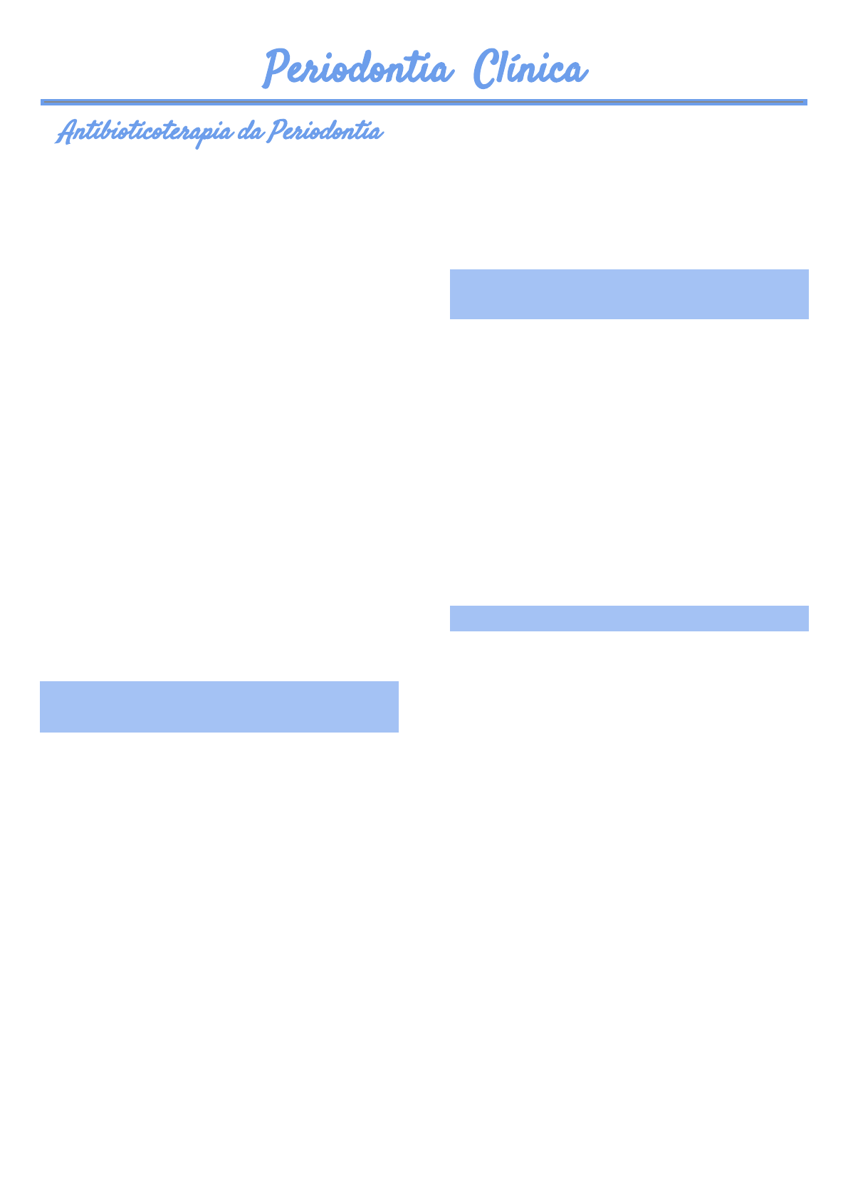 <p>Periodontia Clínica</p><p>Antibioticoterapia da Periodontia</p><p>Obstáculo aos antimicrobianos: bactérias em</p><p>biofilmes são mais resistentes a antimicrobianos</p><p>- O antibiótico não age no biofilme</p><p>- Não prescrever antibiótico sem realizar</p><p>raspagem e alisamento radicular</p><p>Mecanismo que a bactéria tempara fugir do</p><p>antimicrobiano: elas se comunicam para sair das</p><p>margens e ir para o centro que chama “quorum</p><p>sensing”</p><p>LEMBRANDO:</p><p>Saúde: pouca bactéria, 10% de sangramento a</p><p>sondagem, predominância de cocos</p><p>Gengivite:muita placa, aeróbios facultativos,</p><p>anaeróbios estritos</p><p>Periodontite: atividade de osteoclasto mais</p><p>aumentada, anaeróbios estritos</p><p></p><p>- Quando a gengiva está inflamada o fluido folicular é</p><p>produzido em excesso</p><p>- Não operar paciente com inflamação no sítio que</p><p>será operado</p><p>SUSCETIBILIDADE DE PATÓGENOS PERIODONTAIS A</p><p>ANTIMICROBIANOS</p><p>METRONIDAZOL</p><p>- Inibe a síntese do ácido nucléico</p><p>- Inibe a replicação da bactéria</p><p>- Muito eficaz contra os patógenos periodontais</p><p>- Bactericida e altamente tóxico ao complexo</p><p>vermelho: Pg, Tf, Td</p><p>- Não age contra o Aa, somente associado</p><p>- Efeito antabuse: cuidado</p><p>- Provoca efeitos alucinógenos, deprime respiração,</p><p>sensação de morte</p><p>- Avisar para o paciente não beber umagota de álcool</p><p>associado ao metronidazol</p><p>AMOXICILINA</p><p>- Age no bloqueio da síntese da parede celular</p><p>- Estende o espectro para outros tipos de bactérias</p><p>- Instigadores de betalactamases: clavulanato de</p><p>potássio</p><p>- Usado para Inibir alguma resistência bacteriana</p><p>- Sal inibidor de enzima que produzem a resistência</p><p>bacteriana</p><p>- Usado em cirurgias</p><p>ASSOCIAÇÃO DA RASPAGEM + AMOXICILINA +</p><p>METRONIDAZOL</p><p>1- Pacientes comperiodontite Estágio III e V</p><p>- Associar antibioticoterapia de amoxicilina e</p><p>metronidazol reduz a prevalência de bactérias do</p><p>complexo vermelho</p><p>- Redução significativa das bolsas com a associação</p><p>de antibióticos</p><p>- Em pacientes diabéticos eu posso e é indicado usar</p><p>antibioticoterapia associado à raspagem</p><p>2- Tabagismo</p><p>- Ainda não existe evidência científica suficiente que</p><p>embase o uso de raspagem + antibioticoterapia</p><p></p><p>ANTIBIOTICOTERAPIA</p><p>- Usar o antibiótico na reavaliação periodontal</p><p>- Critérios clínicos: casos refratários ao tratamento</p><p>com sítios de aumento de PS e com sangramento,</p><p>perda óssea progressiva, mobilidade progressiva e</p><p>supuração.</p><p>Considerar a terapia para: paciente jovem com</p><p>periodontite estadio III ou IV e diabéticos.</p><p>PRESCRIÇÃO:</p><p>Amoxicilina 500mg- 1 cp de 8\8h por 14 dias</p><p>Metronidazol 400mg- 1 cp de 8\8h por 14 dias</p><p>Metronidazol = Flagil 250mg</p><p>Eventos adversos :Diarréia, gosto metálico, cansaço,</p><p>sono excessivo (se persistir receitar Floratil)</p><p></p><p>Pacientes alérgicos a penicilina</p><p>Sinais de reação alérgica: erupções cutâneas, urticária,</p><p>inchaço, dificuldade para respirar</p><p>O que usar? Clindamicina 300mg a cada 8h.</p><p>Feito por: Mayza Tavares ODONTOLOGIA USF</p><p>Qual a atual recomendação?</p><p>- Não recomendo uso rotineiro em raspagem</p><p>- Somente em categorias específicas</p><p>- Não prescrever sempre pois pode causar resistência</p><p>ao antibiótico (saúde pública)</p><p>- Pacientes com comorbidades como diabetes</p><p>- Não prescrever no início do tratamento</p><p>Tratamento Periodontal Cirúrgico</p><p>OBJETIVOS</p><p>Qual o objetivo do tratamento periodontal não</p><p>cirúrgico?</p><p>- Restabelecer saúde periodontal através do</p><p>controle do biofilme.</p><p>Raspagem: procedimento mecânico que objetiva a</p><p>remoção de biofilme, cálculos e pigmentos extrínsecos.</p><p>Alisamento radicular: remoção do cálculo residual,</p><p>cemento contaminado ou amolecido para obter uma</p><p>superfície lisa e dura.</p><p>Quando reavaliar?</p><p>- aproximadamente 4 semanas</p><p>- observar se houve diminuição da inflamação</p><p>- formação de fibras colágenas</p><p>- formação do epitélio juncional longo</p><p>Oque será reavaliado?</p><p>- profundidade clínica de sondagem</p><p>- índice de SS</p><p>- posição da margem gengival (recessão ou aumento</p><p>gengival)</p><p>- nível clínico de inserção</p><p>- envolvimento de furcas</p><p>- grau de mobilidade</p><p>Objetivos:</p><p>- Redução ou resolução do SS <10%</p><p>- PCS <4mm e sem SS</p><p>- IP <10%</p><p>- ausência de dor</p><p>- satisfação individual de estética e função</p><p>TRATAMENTO PERIODONTAL CIRÚRGICO</p><p>Com a finalidade de tratar as sequelas,</p><p>efeitos mucogengivais e estética.</p><p>Objetivos das cirurgias periodontais</p><p>- contribuir para a preservação do periodonto a longo</p><p>prazo</p><p>- facilitar remoção e controle do biofilme</p><p>- melhorar estética</p><p>Como?</p><p>- acesso para RAR</p><p>- eliminando ou reduzindo a profundidade de bolsas</p><p>- estabelecendo a morfologia que facilite controle de</p><p>placa</p><p>- regeneração da inserção perdida pela doença</p><p>Quando indicar?</p><p>- bolsas residuais moderadas >4mm e SS</p><p>- bolsas residuais profundas <6mm</p><p>- só podem ser realizadas APÓS o tratamento</p><p>não-cirúrgico</p><p>Indicações:</p><p>- acesso e defeitos ósseos</p><p>- redução e\ou eliminação da bolsa periodontal</p><p>- tratamento de bi ou trifurcação</p><p>- aumento de coroa clínica</p><p>- regeneração tecidual guiada (RTG)</p><p>- aumento da gengiva inserida</p><p>- recobrimento de retrações</p><p>- Raspagem e alisamento radicular eficaz;</p><p>- Tratar lesões de furca;</p><p>- de anormalidades estéticas;</p><p>- Cirurgias pré protéticas</p><p>- Estabel