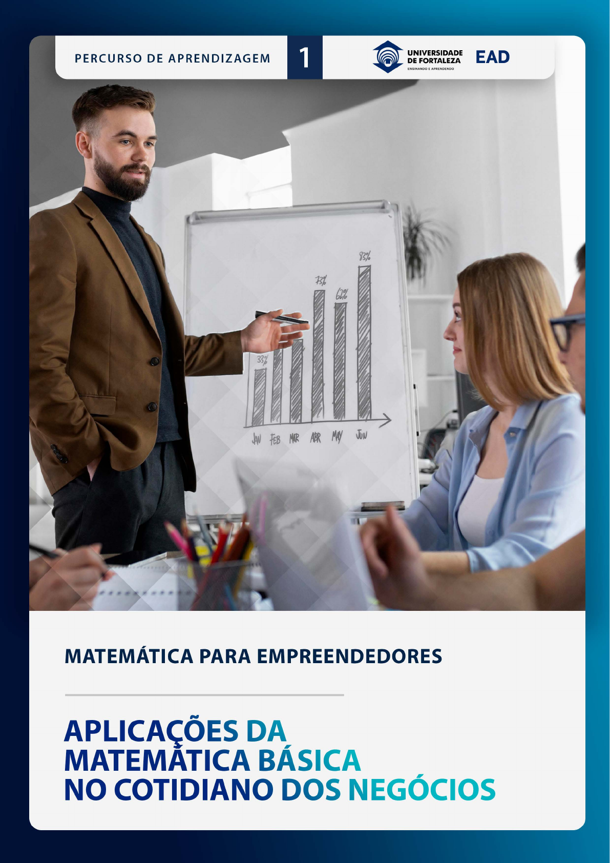 <p>Este trabalho está licenciado com uma Licença Creative Commons</p><p>Atribuição-NãoComercial-SemDerivações 4.0 Internacional.</p><p>APLICAÇÕES DA MATEMÁTICA BÁSICA NO</p><p>COTIDIANO DOS NEGÓCIOS</p><p>Frações e operações com frações aplicadas à gestão</p><p>de negócios1.</p><p>Porcentagem e variação percentual para o cálculo da</p><p>eficiência empresarial.2.</p><p>Elementos e propriedades de potenciação e de</p><p>radiciação3.</p><p>Equações do 1º grau, conjuntos numéricos e lógica</p><p>matemática na análise de cenários4.</p><p>Sumário</p><p>Sumário clicável</p><p>4</p><p>Voltar ao sum</p><p>ário</p><p>Este Percurso de Aprendizagem se dedica a</p><p>demonstrar como os conhecimentos elementares</p><p>da matemática podem ajudar o empreendedor a</p><p>conhecer seu ambiente de negócios e melhorar</p><p>seu processo de tomada de decisão. Para isso, é</p><p>importante que você fique atento ao método de</p><p>resolução dos problemas, pois vamos estudar e</p><p>aplicar as noções de frações e suas operações,</p><p>porcentagem, potenciação, radiciação e equações,</p><p>em situações comuns ao ambiente de trabalho do</p><p>empreendedor. Assim, poderemos responder a</p><p>questionamentos como: quais as situações em que</p><p>precisarei usar esse conhecimento matemático?</p><p>Preciso decorar todas as fórmulas? Como interpreto</p><p>os resultados de equação? Agora, vamos aos</p><p>estudos!</p><p>Olá</p><p>5</p><p>Voltar ao sum</p><p>ário</p><p>Frações e operações com frações aplicadas à gestão de</p><p>negócios1.</p><p>É natural que todos os dias você resolva vários problemas matemáticos. A maior parte</p><p>dessas resoluções é tão simples e intuitiva que acabamos nem percebendo o quanto</p><p>sabemos e dominamos os conceitos e técnicas matemáticos. Por isso será muito simples</p><p>compreender e aplicar em casos práticos as noções de frações e suas operações.</p><p>Para definirmos o que é uma fração, vamos compreendê-la da seguinte maneira:</p><p>Toda vez que fragmentamos um determinado elemento em partes iguais,</p><p>estaremos fracionando esse elemento. Por isso, uma fração é simplesmente “a</p><p>divisão de um item em partes necessariamente iguais”.</p><p>Esses fragmentos, ou “pedaços”, podem ser somados uns aos outros, ou subtraídos um</p><p>em relação ao outro; podem ainda multiplicarem-se ou serem divididos. Quando fazemos</p><p>isso, dizemos que: houve uma operação de frações.</p><p>Em seu cotidiano à frente da gestão de sua empresa, na elaboração ou análise de um</p><p>plano de negócios, é comum que se façam divisões de orçamentos anuais em orçamentos</p><p>mensais, fragmentação do quantitativo de produção mensal em produção semanal,</p><p>consumo de insumo por produto acabado, e são nessas situações que você precisará</p><p>das noções aqui estudadas.</p><p>Mas como faço a aplicação desse conceito?</p><p>Sendo a figura abaixo uma placa quadrada de 2m de lado, e se precisamos de 0,5m</p><p>quadrados dessa placa para fabricar um dado produto, logo cada placa atende a demanda</p><p>de 4 produtos, já que 0,5m2 + 0,5m2 + 0,5m2 + 0,5m2 = 2m2.</p><p>Então, qual fração da placa será usada em cada produto? Para solucionar esse problema,</p><p>podemos usar uma fração!</p><p>6</p><p>Voltar ao sum</p><p>ário</p><p>Onde os termos dessa fração serão a porção necessária para cada produto como o</p><p>numerador e a área da placa como denominador.</p><p>Assim:</p><p>numerador</p><p>denominador</p><p>=</p><p>0,5m</p><p>2,0m</p><p>=</p><p>Nesse caso, vamos multiplicar ambos os termos por 10 e transformá-los em números</p><p>naturais:</p><p>0,5 x1 0 5</p><p>2,0 1 0 20x</p><p>= =</p><p>Como representamos a fração por números naturais, tanto no numerador como no</p><p>denominador, precisaremos usar o Máximo Divisor Comum – MDC, para transformarmos</p><p>essa fração em uma fração ideal. Então, precisaremos do MDC de 5 e 20. Para isso</p><p>faremos assim:</p><p>5, 20</p><p>1, 4 2</p><p>1, 2 2</p><p>1,1</p><p>5</p><p>Como o 5 é único número que divide tanto ele mesmo quanto o 20, então o 5 é o Máximo</p><p>Divisor Comum, tanto para o 5 quanto para o 20. E para concluirmos a fração, basta agora</p><p>dividir tanto o numerador quanto o denominador pelo MDC, que nesse caso é o 5. Ficará</p><p>assim:</p><p>Para ajudá-lo(a) a fixar o conceito e o método, veja esses exemplos:</p><p>7</p><p>Voltar ao sum</p><p>ário</p><p>Exemplo 1: Uma panificadora que produz 160 bolos mensalmente produzirá em média ¼</p><p>de sua produção semanalmente, pois:</p><p>Exemplo 2: Em uma churrascaria que serve 1kg de carne para 5 pessoas, considera-se</p><p>que cada cliente consome até 200g. Qual a fração da carne servida a cada cliente?</p><p>Até aqui já conseguimos fazer essa breve revisão. São tópicos básicos, mas de muita</p><p>importância para os nossos próximos Percursos de Aprendizagem.</p><p>Como as noções de frações foram tratadas, agora precisamos aplicar suas operações.</p><p>Para isso vamos estudar um pouco sobre: soma e subtração e multiplicação e divisão de</p><p>fração.</p><p>Soma e subtração de frações</p><p>Vamos iniciar admitindo que um gerente de produção precise direcionar 1/3 dos insumos</p><p>X para a produção de um produto A, e ¼ desse mesmo insumo para a produção de um</p><p>produto B. Nessas condições, se precisarmos saber a soma total do quanto foi utilizado</p><p>desse insumo, precisamos proceder da seguinte forma:</p><p>1 1</p><p>3 4</p><p>= +</p><p>Aqui temos um principal ponto de atenção: tanto na soma quanto na subtração de frações</p><p>com denominadores diferentes, teremos que deixar esses denominadores iguais. Para</p><p>isso precisamos determinar o Mínimo Múltiplo Comum – MMC de 3 e de 4. Faremos</p><p>assim:</p><p>3, 4</p><p>3, 2</p><p>3, 1</p><p>1,1</p><p>2</p><p>2<
