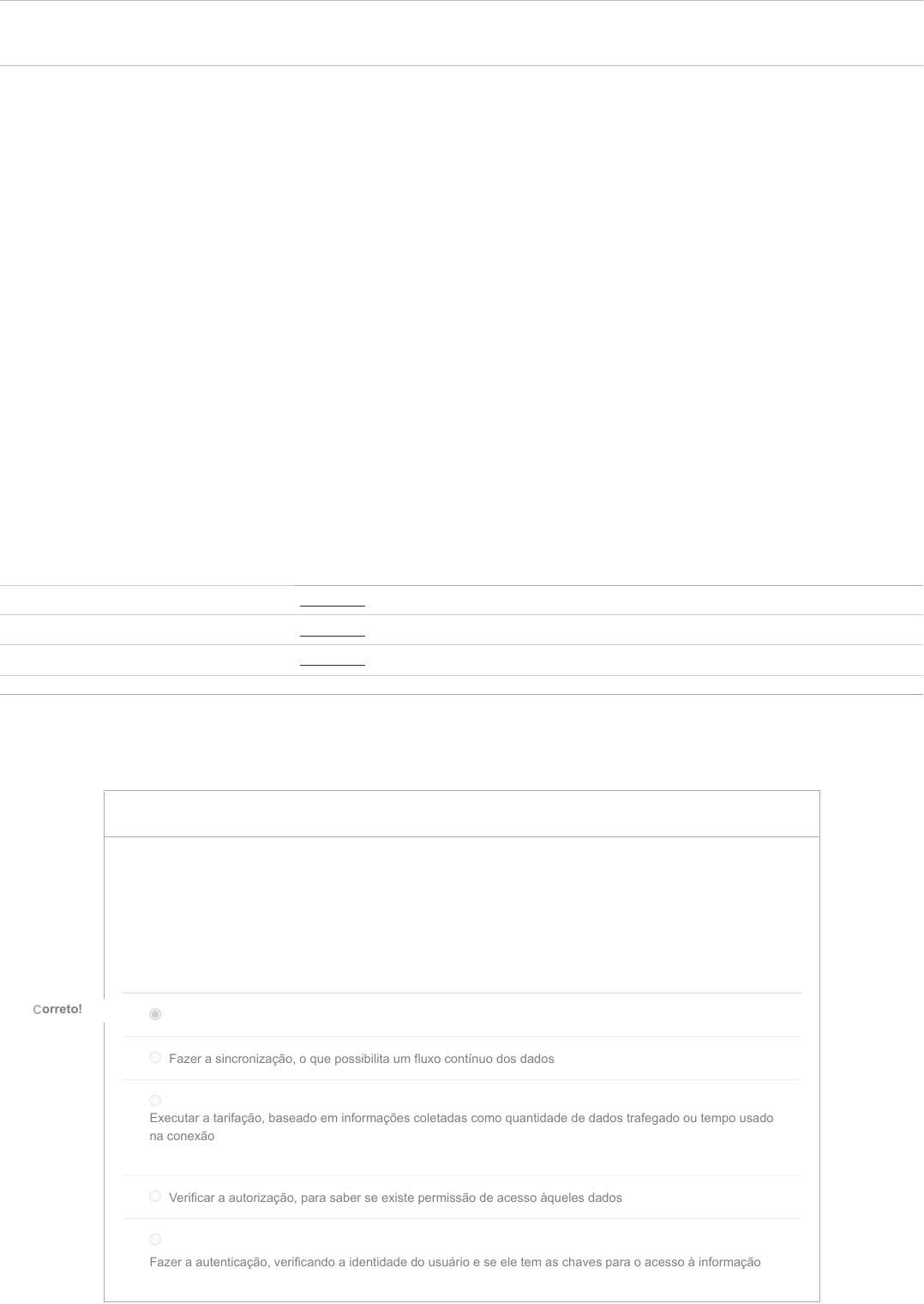 <p>Q04 - Questionário 04</p><p>Entrega 5 dez em 23:59 Pontos 0,4 Perguntas 4 Disponível 23 out em 19:00 - 5 dez em 23:59</p><p>Limite de tempo Nenhum Tentativas permitidas 2</p><p>Instruções</p><p>Histórico de tentativas</p><p>Tentativa Tempo Pontuação</p><p>MANTIDO Tentativa 2 2 minutos 0,4 de 0,4</p><p>MAIS RECENTE Tentativa 2 2 minutos 0,4 de 0,4</p><p>Tentativa 1 9 minutos 0,2 de 0,4</p><p>Pontuação desta tentativa: 0,4 de 0,4</p><p>Enviado 31 out em 10:29</p><p>Esta tentativa levou 2 minutos.</p><p>Instruções do Questionário!</p><p>1. Antes de responder o Questionário: Assista a videoaula e leia o capítulo correspondente do livro.</p><p>2. Abra o questionário somente quando for responder;</p><p>3. Ao abrir o questionário você terá 4 questões para responder;</p><p>4. Leia com calma todas as questões e entenda o que pede a questão: se pede a incorreta, a correta e qual o tema da questão;</p><p>5. Lembre-se de Clicar no botão "Enviar Teste";</p><p>6. Você tem duas tentativas para fazer o teste, a segunda tentativa é opcional;</p><p>7. Lembre-se que as respostas mudam de lugar em cada tentativa;</p><p>8. As respostas corretas só aparecem após o envio da segunda tentativa;</p><p>9. O sistema considera a maior nota entre as duas tentativas;</p><p>10. Lembre-se que a segunda tentativa vai zerar TODAS as questões, inclusive as que você acertou na primeira tentativa;</p><p>11. Caso queira ter o questionário para arquivo pessoal, basta selecionar a impressão do questionário e escolher a opção de "salvar em PDF";</p><p>Bons estudos! 😀</p><p>0,1 / 0,1 ptsPergunta 1</p><p>No modelo OSI a camada de Sessão é a camada que tem a responsabilidade de controlar o diálogo da</p><p>rede, estabelecendo, mantendo e fazendo a sincronia da comunicação dos dois hosts que resolveram</p><p>trocar informações. No controle do diálogo, a comunicação pode ser em uma direção por vez ou nos dois</p><p>sentidos ao mesmo tempo. Além disso, a camada de Sessão tem muitas outras responsabilidades.</p><p>Destas abaixo, qual não é uma função da camada de sessão?</p><p>Fazer a criptografia, para manter o sigilo das informações trocadas Correto!Correto!</p><p>Fazer a sincronização, o que possibilita um fluxo contínuo dos dados</p><p>Executar a tarifação, baseado em informações coletadas como quantidade de dados trafegado ou tempo usado</p><p>na conexão</p><p>Verificar a autorização, para saber se existe permissão de acesso àqueles dados</p><p>Fazer a autenticação, verificando a identidade do usuário e se ele tem as chaves para o acesso à informação</p><p>https://ucaead.instructure.com/courses/66490/quizzes/242918/history?version=2</p><p>https://ucaead.instructure.com/courses/66490/quizzes/242918/history?version=2</p><p>https://ucaead.instructure.com/courses/66490/quizzes/242918/history?version=1</p><p>0,1 / 0,1 ptsPergunta 2</p><p>A camada de apresentação do modelo OSI é muito importante para a tradução dos dados que estão</p><p>trafegando entre diferentes Sistemas Operacionais e arquiteturas. Se não fosse essa tradução, a</p><p>interoperabilidade entre diferentes sistemas seria bem mais difícil. Além dessa função, qual das</p><p>alternativas abaixo também é uma função da camada de apresentação?</p><p>Definir a porta lógica da aplicação que será usada na comunicação</p><p>Fazer a compactação dos dados reduzindo a quantidade de bits trafegada Correto!Correto!</p><p>Fazer a criptografia, que consiste em usar protocolos compatíveis com o Sistema Operacional utilizado</p><p>Escolher os protocolos corretos para que as comunicações possam ser feitas por diferentes fabricantes de</p><p>software e hardware</p><p>Fazer a restauração dos dados, garantindo que após uma queda de energia a comunicação possa ser</p><p>restabelecida</p><p>0,1 / 0,1 ptsPergunta 3</p><p>O endereço IP é um campo do protocolo IP que permite que os pacotes possam alcançar o seu destino e</p><p>depois retornarem à sua origem. Na sua versão 4, o IPv4 tem quatro campos de oito bits cada um,</p><p>chamados de octetos. Qual destas representações não é a de um endereço IP válido?</p><p>200.219.56.89</p><p>31.67.87.254</p><p>172.26.65.91</p><p>192.168.0.256 Correto!Correto!</p><p>192.168.255.9</p><p>0,1 / 0,1 ptsPergunta 4</p><p>O endereçamento CIDR permitiu que as redes pudessem ser subdivididas em pedaços menores ou</p><p>maiores de acordo com a necessidade da organização. Assim os endereços IP são melhor aproveitados,</p><p>não havendo nem desperdício nem falta de endereços. Qual a quantidade de hosts e redes que uma</p><p>classificação CIDR /30 permite?</p><p>3 hosts e 30 redes</p><p>30 hosts e 125 redes</p><p>8 hosts e 32 redes</p><p>6 hosts e 32 redes</p><p>4 hosts e 64 redes Correto!Correto!</p><p>Pontuação do teste: 0,4 de 0,4</p>