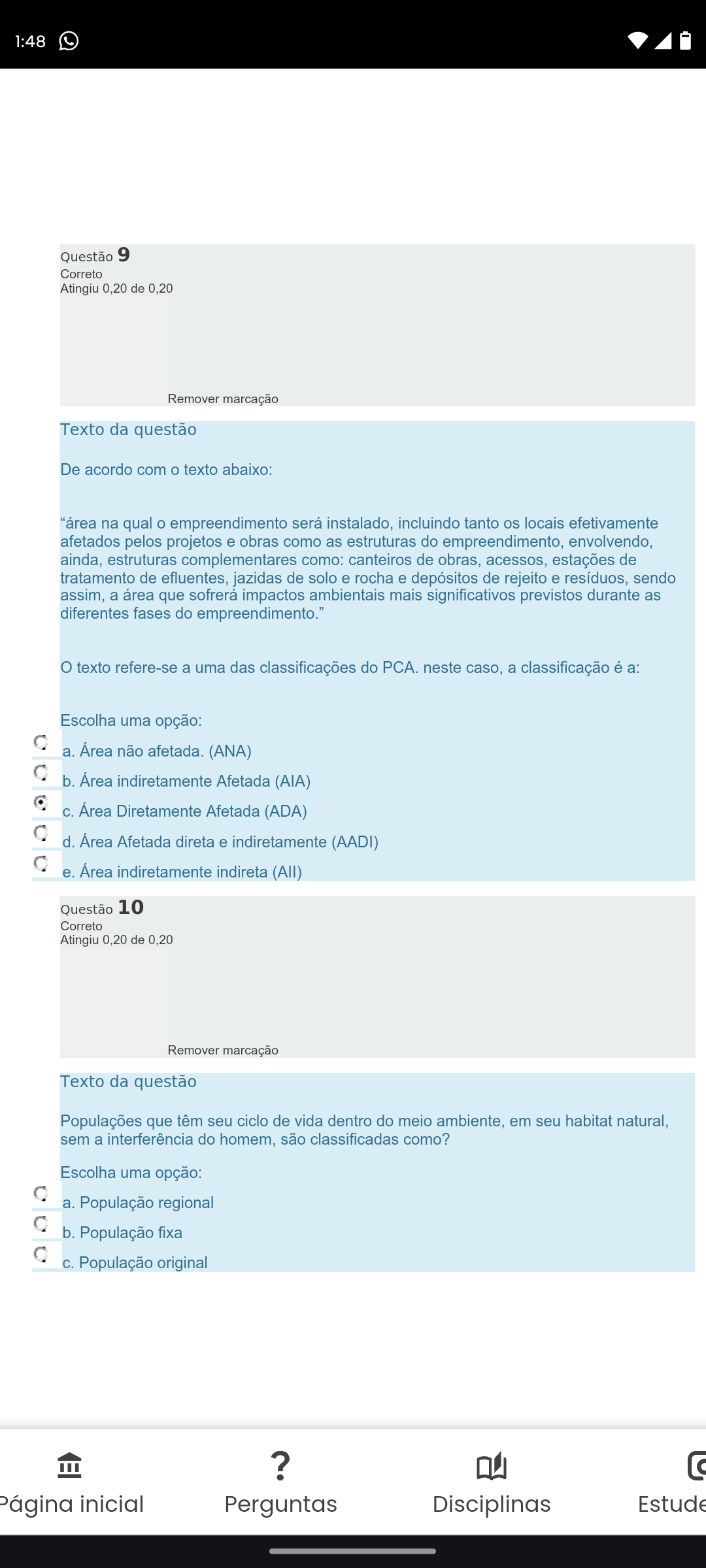 <p>Questão 9 Correto Atingiu 0,20 de 0,20 Remover marcação Texto da questão De acordo com o texto abaixo: "área na qual o empreendimento será instalado, incluindo tanto os locais efetivamente afetados pelos projetos e obras como as estruturas do envolvendo, ainda, estruturas complementares como: canteiros de obras, acessos, estações de tratamento de efluentes, jazidas de solo e rocha e depósitos de rejeito e sendo assim, a área que sofrerá impactos ambientais mais significativos previstos durante as diferentes fases do empreendimento." texto refere-se a uma das classificações do PCA. neste caso, a classificação é a: Escolha uma opção: a. Área não afetada. (ANA) b. Área indiretamente Afetada (AIA) C. Área Diretamente Afetada (ADA) d. Área Afetada direta e indiretamente (AADI) e. Área indiretamente indireta (All) Questão 10 Correto Atingiu 0,20 de 0,20 Remover marcação Texto da questão Populações que têm seu ciclo de vida dentro do meio ambiente, em seu habitat natural, sem a interferência do homem, são classificadas como? Escolha uma opção: a. População regional b. População fixa C. População original ? C Página inicial Perguntas Disciplinas Estude</p>