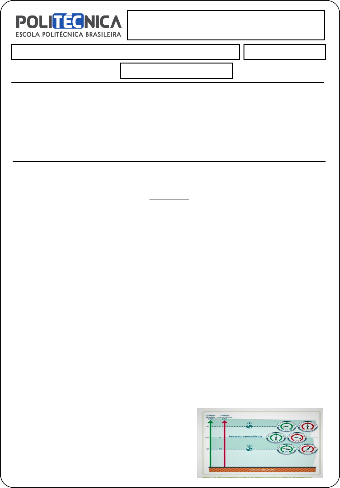 <p>Atividade de Aprendizagem 01: Mecânica Técnica</p><p>Observação: Só será avaliada a questão que apresentar o seu respectivo desenvolvimento.</p><p>QUESTÕES</p><p>1. Descreva como se comporta a distribuição da pressão hidrostática em uma massa fluida?</p><p>O peso específico desses fluidos permanece constante com a profundidade da massa fluida, o</p><p>que define os fluidos incompressíveis. A variação da pressão no fluido varia linearmente com a</p><p>profundidade, fenômeno conhecido como distribuição da pressão hidrostática. As pressões</p><p>absolutas e pressões manométricas são consideradas em relação ao referencial da escala.</p><p>2. O que se entende por altura de carga?</p><p>Para formatar o texto corretamente e melhorar a compreensão, aqui está a versão revisada:</p><p>A altura de carga, representada como h [m], é definida como a altura de uma coluna de líquido</p><p>com peso específico γ [N/m³] necessária para manter uma diferença de pressão (p – p0).</p><p>Matematicamente, isso pode ser expresso por:</p><p>h = (p – p0) / γ</p><p>Esta altura é crucial na mecânica dos fluidos para determinar a pressão exercida por um líquido</p><p>devido à sua coluna vertical sobre um ponto específico.</p><p>3. Explique em uma figura as diferenças entre pressão manométrica e pressão absoluta?</p><p>A pressão absoluta é medida tendo como referência a pressão de zero absoluto, enquanto a</p><p>pressão manométrica é medida tendo como referência a pressão atmosférica. Na figura abaixo,</p><p>pode-se visualizar de forma gráfica a relação entre essas pressões:</p><p>Mecânica Técnica</p><p>Aluno (a): João Victor Santana da Silva Data: 22/06/2024</p><p>Atividade de Aprendizagem 01</p><p>ORIENTAÇÕES:</p><p>❖ Esta Atividade contém 08 questões, totalizando 10 (dez) pontos.</p><p>❖ Ler atentamente as instruções contidas no documento é de fundamental importância na realização da avaliação.</p><p>❖ Para esta atividade o aluno poderá utilizar-se das ferramentas de pesquisas como: internet, artigos científicos, manuais</p><p>técnicos, livros e literaturas disponibilizadas em nossa biblioteca.</p><p>❖ Você deve preencher dos dados no Cabeçalho para sua identificação - Nome / Data de entrega</p><p>❖ Ao terminar grave o arquivo com o nome Atividade de Envio (nome do aluno).</p><p>❖ A nota será lançada no sistema.</p><p>❖ O prazo de correção é de até 07 (sete) dias úteis.</p><p>❖ Envie o arquivo pelo sistema em formato digital em PDF ou WORD.</p><p>Bons Estudos!</p><p>Atividade de Aprendizagem 01: Mecânica Técnica</p><p>4. Qual a pressão manométrica em kPa em um recipiente contendo óleo cujo tubo piezométrico apresenta</p><p>uma leitura de 0,30 m. Considere a densidade relativa do óleo igual a 0,9?</p><p>5. Por que os medidores de pressão mecânicos ou elétricos são mais práticos que os manômetros de coluna</p><p>de líquido?</p><p>Um manômetro de coluna de líquido só pode ser utilizado para medir pressão em reservatórios</p><p>com líquidos e não com gases, pois estes escapariam pela extremidade aberta e se dispersariam</p><p>na atmosfera. Além disso, as pressões manométricas a serem medidas devem ser positivas e</p><p>não podem ser muito elevadas, pois isso resultaria em uma coluna de líquido com altura</p><p>excessiva, o que não é prático para construção do manômetro nem para obtenção das leituras</p><p>precisas.</p><p>6. No lado da sucção de uma bomba, um medidor de pressão de Bourdon mede 40 kPa de vácuo. Qual a</p><p>pressão absoluta equivalente, se a pressão atmosférica absoluta é igual a 100 kPa?</p><p>Pabs=Prel+Patm</p><p>Pabs=-40+100</p><p>Pabs=60kPa</p><p>7. Deduza a equação para determinar a pressão no reservatório B em função da pressão no reservatório A da</p><p>Figura 1.8 da aula 01?</p><p>Pa+ℽl.hl+ℽ2.h2=Pb+ℽ3.h3</p><p>Pb=Pa+ℽl.hl+ℽ2.h2-ℽ3.h3</p><p>8. Qual a pressão sobre o casco de um submarino que viaja a 50 m abaixo da superfície livre? Considerando a</p><p>pressão atmosférica igual a 100 kPa, quantas vezes a pressão sobre o casco é maior do que a pressão</p><p>atmosférica?</p><p>P= Patm+d.g.h</p><p>P=108+(103.10.50)</p><p>P=600000P=600kPa</p><p>600/100=6</p><p>A pressão sobre o casco é 6 vezes maior do que a pressão atmosférica</p>
