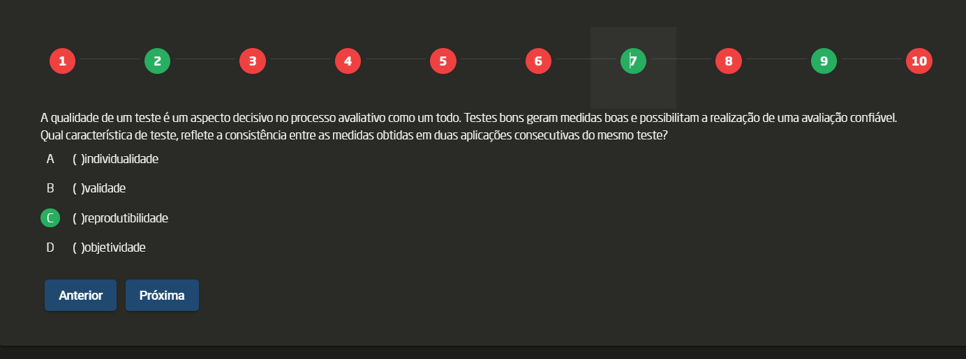 <p>1 2 3 4 5 6 7 8 9 10 A qualidade de um teste é um aspecto decisivo no processo avaliativo como um todo. Testes bons geram medidas boas e possibilitam a realização de uma avaliação confiável. Qual característica de teste, reflete a consistência entre as medidas obtidas em duas aplicações consecutivas do mesmo teste? A ( )individualidade B ( )validade C ( )reprodutibilidade D ( )objetividade Anterior Próxima</p>