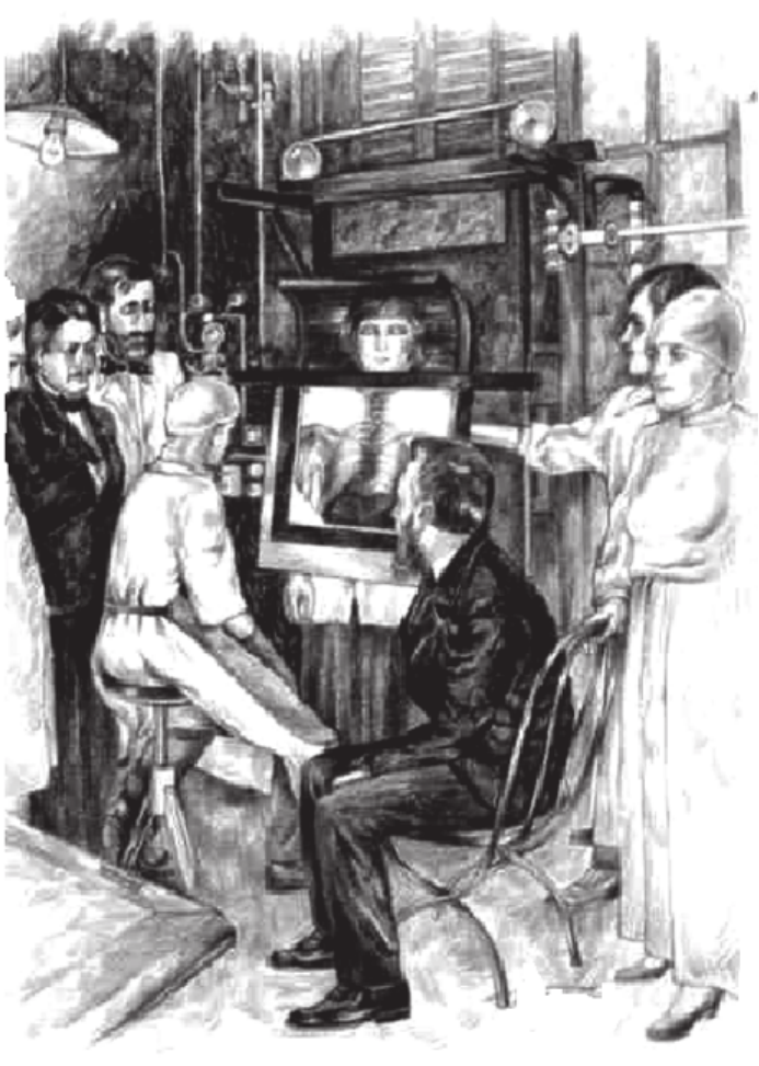 <p>Física da Radiologia</p><p>Diagnóstico por imagaem</p><p>Fundamentos Básicos</p><p>Phillip Patrik Dmitruk</p><p>2</p><p>1. Conceito de radiações.</p><p>Radiações ionizantes:</p><p>Toda radiação produz efeitos letais sobre</p><p>células e tecidos vivos, daí a necessidade de se</p><p>estabelecer normas para proteção e higiene</p><p>assegurando o adequado uso da mesma.</p><p>Proteção: Estabelecimento das normas de</p><p>segurança e técnicas que levem a boa interação</p><p>com o público , em trabalho ou em tratamento.</p><p>Higiene: Estabelecimento de normas de</p><p>conservação de Saúde.</p><p>Princípios a serem utilizados quando é</p><p>objetivada uma prevenção ou um controle de</p><p>exposição a radiação ionizante:</p><p>a. Remove-se a fonte da radiação ionizante;</p><p>b. Mantê-la sobre rígido controle e</p><p>c. Proteger quem esteja exposto a fonte,</p><p>seja paciente ou trabalhador.</p><p>Antes de entrarmos nos conceitos de</p><p>radiações,vamos estabelecer alguns conceitos</p><p>básicos sobre física atômica:</p><p>1.1 O átomo</p><p>Constituído de um núcleo central rígido onde se</p><p>encontram os prótons e os nêutrons, também</p><p>denominados “núcleons”. No núcleo esta</p><p>concentrada a massa do átomo. Gravitando ao</p><p>redor do núcleo estão os elétrons , distribuídos</p><p>pela eletrosfera, esta constituída pelas camadas</p><p>K,L,M,N,O,P,Q com seu número máximo</p><p>permissível de elétrons.</p><p>Símbolo Químico :</p><p>ZXA</p><p>A ..... número de massa</p><p>Z ..... número atômico</p><p>Particularidades :</p><p>Isóbaros: mesmo no de massa (A)</p><p>(6C</p><p>14, 8O</p><p>14, 7N</p><p>14)</p><p>Isótopos: mesmo no Atômico (Z)</p><p>(1H1, 1H2, 1H3 )</p><p>mp = 1,00759 uma</p><p>mn = 1,00898 uma</p><p>me = 1,67 x 10kg</p><p>Defeito de massa: é a diferença entre a massa</p><p>de repouso de um núcleo e a soma das massa</p><p>isoladas de cada um dos seus núcleons.</p><p>Capítulo 01</p><p>Proteção e higiene às radiações</p><p>Conceitos, normas e segurança no trabalho com radiações ionizantes</p><p>Energia de ligação: é a quantidade de energia</p><p>a ser fornecida ao sistema para separar as</p><p>partículas completamente.</p><p>∆ m = defeito de massa</p><p>∆ m = Z. mp +Zme+(A-Z) mn - m A</p><p>∆ m = Z.mH + (A-Z) mn - mA</p><p>∆ m = Z. 1,008142 + (A-Z). 1,00898 - mA</p><p>1 uma = l,60.10Kg</p><p>1 mH =1,008142 uma</p><p>Segundo Planck-Einstein temos:</p><p>E = m . c2</p><p>E = 1,60.10-27.(3.108)2 = 1,493.1010joules. 1ev</p><p>1,66.10-19joules</p><p>E = 931 MeV</p><p>assim, a energia de ligação será,</p><p>EL = E. Δm = 931 . [ Z. . 1,008142+(A-Z) . 1,008982 - mA ]</p><p>3</p><p>1896 - A.R. Becquerel verifi cou que os sais de</p><p>urânio emitiam radiações que impressionavam</p><p>chapas fotográfi cas, mesmo quando envoltas</p><p>por um papel preto. Impressionado com este</p><p>fato denominou-a de “Radiação penetrante”,</p><p>1.2 Conceitos básicos sobre radiações</p><p>Divisão:</p><p>a) Radiação corpuscular: Constituí-se de um</p><p>feixe de partículas subatômicas assim como os</p><p>elétrons, os prótons, as alfas, os dêuterons e</p><p>etc., acelerados a altas velocidades, onde, para</p><p>radiação corpuscular,</p><p>E = 1 mV2</p><p>correção relativística da massa (m)</p><p>m = m0 .[ 1 - (v2 /c2) ]-1/2</p><p>Fenômenos ligados: Produção, Absorção e</p><p>Espalhamento dos R-X constituindo-se de</p><p>ondas que possuem a mesma velocidade,</p><p>contudo variam quanto ao seu comprimento de</p><p>onda λ (lambda).</p><p>b) Radiação eletromagnética: Todas as</p><p>radiações que possuem oscilações elétricas</p><p>e magnéticas, Fenômenos ligados: Refl exão,</p><p>Difração e Polarização</p><p>1901- Max Planck desenvolveu a teoria dos</p><p>“quanta” que hoje são denominados “fotóns”</p><p>devido a A. Einstein, segundo estes a energia</p><p>dos fótons varia com a freqüência de onda da</p><p>radiação, onde:</p><p>E = hν</p><p>h = Constante de Plank = 6,626 v10-34 joules . seg</p><p>Pierre e M.me. Currie</p><p>2</p><p>provando após trabalhar com vários e diferentes</p><p>sais de Urânio que ela provinha deste elemento</p><p>e que quanto maior a quantidade de Urânio</p><p>maior a quantidade de radiação não variando</p><p>com a temperatura, pressão, campos elétricos e</p><p>magnéticos e até mesmo estado químico.</p><p>1897 - E. Rutherford dividiu as radiações</p><p>naturais em três tipos ou espécies:</p><p>α( alfa) β (beta) γ (gama)</p><p>Postulou que, a radioatividade é a transformação</p><p>espontânea do núcleo atômico de um nuclídeo</p><p>para outro, emitindo um ou mais tipos de</p><p>radiação, que dependem da característica de</p><p>transformação ou do nuclídeo “pai”. A alteração</p><p>de um nuclídeo “pai” para outro “fi lho” e</p><p>denominada Desintegração radioativa.</p><p>1898 - P Curie e M.. S. Curie denominaram</p><p>este tipo de fenômeno de “Radiatividade”</p><p>determinando ainda a existência de um outro</p><p>elemento radioativo em meio a Plechblenda</p><p>(minério do Urânio) e separando uma pequena</p><p>quantidade do mesmo, o qual denominaram</p><p>“Polônio” e uma outra denominada “Radium”.</p><p>1.4 Tipos de desintegração</p><p>a) Desintegração alfa (α): São intrinsecamente</p><p>núcleos de gás Hélio (He),possuem carga positiva</p><p>e massa maior que a do elétron. A desintegração</p><p>se dá segundo a seguinte relação:</p><p>ZX</p><p>A Z-2Y</p><p>A-4 + α + Qα</p><p>onde,</p><p>Qα = Energia liberada = A . Eα</p><p>A-4</p><p>Eα = 1/2 ( m V )</p><p>1.3 Radioativida natural</p><p>Histórico</p><p>1895 - W.C. Röentgen descobre os R-X</p><p>A. R. Becquerel</p><p>4</p><p>b) Desintegração beta (β -) : Núcleos que</p><p>possuem excesso de nêutrons, alcançam a</p><p>estabilidade convertendo um nêutron num</p><p>próton e uma partícula bet