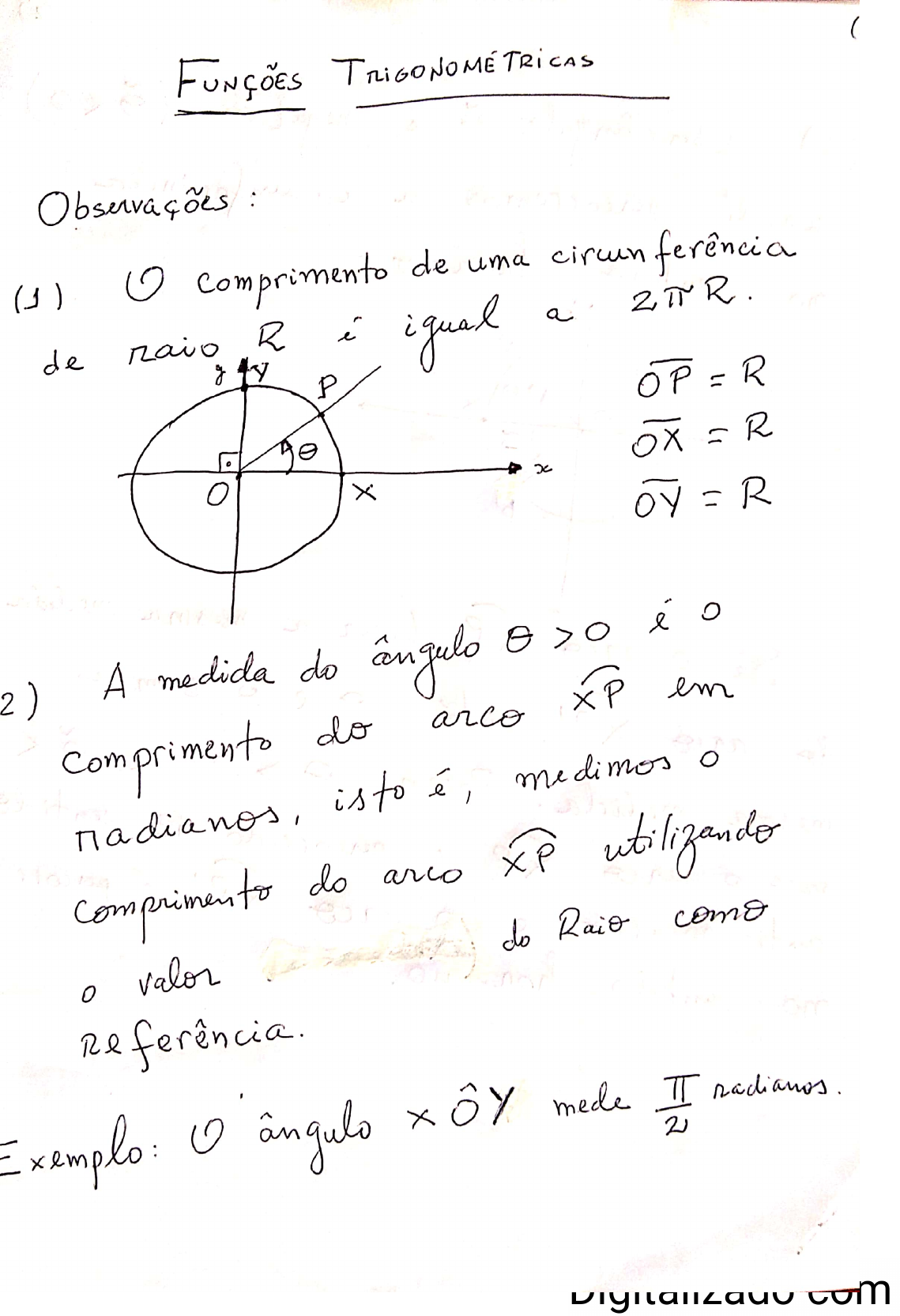 <p>( Observações comprimento de uma circun ferência (1) de raio R i igual a P = R X oy = R 2) A medida do XP em do arco medimos isto do arco XP utilizando do Raio valor Rl ferência. angulo mede II 2</p><p>(2) (3) Um negative grando percorremos a no sentido : y P 10 Se arco tiver a mesma medida tem a l do O >0 mesma 0 XP i percorrido no sentido pois anti- horario e 0 arco XP' i percorrido no sentido</p><p>(3) de Triangulos e a das cosseno e tangente B3 B2 B, 10 A3 A1 A2 OA,B, OA2B2 e OA3B3 angulos sao radianos. Obs: reto tem medida a A2B2 A3B3 sen(o) = OB, = OB2 = OB3 = OA, = OA2 = OA3 = A2B2 = A3 B3 sen(9) OB, OB2 OB3 . = OA2 OA3</p><p>(4) De acordo com as anteriores, temos = sen = = 1 e = das Vamos considerar a ( 1) : y y O X 1 = y to = x : abscissa do =</p><p>(5) ( extensio das fungoes (1) Se a medida de a 0>0 t percorremos sentido for unitaria no anti- até a medida de radianos t radianos. circum do ponto X= sija Se que em um P sobre valor de t a = = e (2) Se a de um for t caso anterior, entas podemos porem proceder a como no sera percorrida no sentido</p><p>(6) (3) A de uma circun de centro na e R= 1 dada x2+ 1 . 2 Portanto, 2 + = 1 . (4) Sinal das em cada seno + - + - + + - + + - (5) Como da as unitaria igual a 2TT, de fungoes periodo igual a periodicas sen 2TT) = cos =</p><p>(7) ser percorrida tanto no anti- (6) que a unitaria pode no sentido escrever sen = i cos + tg = para todo k E Z dos AO PRiMEiRO Quadrante Vamos considerar um angulo do primeiro assim II</p><p>(8) um angulo do P' XP : correspondents as R=1 ao Q 0 Q' : correspondente do medida a II radianos OBSERVAÇÕES 1) = 2) 3) = - cos(x) = - i = = sen Lembre-se de que a ordenada abscissa do P e sen i a do to P.</p><p>(9) 20 ao angulo do 32 1) = ao Q 2) DOPQ 3) - ao sen(X)= P 3. i do (1) (2) AOPQ P usar (3) cos(ao) = sen (ao) = - sen</p><p>(10) das seno e P1. Cos (- sen (-0) = - A dessa da das seno e (usando a e seguintes medida (o) = (- = 2) Se um e isosceles, entas da base P'= (costa), P a Q P= sen(a)) R a cos(a) P'OP sent-a) = sen(a)</p><p>a e b angulos do (11) cos(a+b) = - Segue da figure a S. S= b P= 1=R R=1 Q= DOXP DOQS QOS = e Assim, = = sen 2 - 2 = = (1-</p><p>(12) 2 2 + + 2 + 2 senca) 2 2 = 2 + 'Cos (a+b) + sen / = 1 1 - 2 cos(a) cos(b) 2 (b) + 1 = 1 - 2 cos (a+b) + 1 - 2 2 sen(b) 2 (a+b) = Cos(a) Cos sen(a) u P3. Sejam a do quadrante tais Cosla- b) = Cos(a) cos(b) + senca) Veja a Figura as lads a-b x R=1 M=(1,0) R=1 - b = a (cos(-a),</p><p>(13) Na propriedade se - (a- - b) Assim, pela (a - = = cos(b-a) = cos(b) + = cos(a) + sen(a) = Dado e tais < 2T e = Saja II x I EZ. vimos no inicio do curso de Calculo, x < Seja = x - = e</p><p>(14) Usando Teorema anterior, a de um quadrante e as demais resultados vistos nessas notas de aula, nos podemos mostrar = cos(a) senca) - b) = e cos(b) e disso, podemos = senca) + senlb) cos(a) e - senca) coslb) - sen(b) cos(a).</p><p>(15) (1) Cos (a+b)) = ; (2) cos = - sen = - sen(a) (3) = = - sent sen = - sen (4) = = sen(a+b) = - cos + (a+b)) = - - coslb) - sen sen(6)] - [- cos(b) - cos(a). sen(6)] senca) + sen (b)</p><p>Limites a Figura de T 0 T P 4 M Considere as A1= area do = 2 = 2 = = = = - 2 A area do circular OMP = 2 A are do de R=1 i = - area do circular OMP f MP x - i dada pela de 3 2 - A. A = A a a do circular</p><p>(17) A3= A area do DOMT = 2 = 1 . obs h2 = = = 1 Dessa que A1 < A2 sen(x) X sen(x) 2 2 2 podemos que (i) < sen (x) 2 . 2 X (ii) 1 sen(x) X < sen(x) 2 2 < . de x um do e, e</p><p>(18) primeiro Limite Fundamental vamos analisar i dado por lim sencx) = 1 . X Para resolvermos esse sera necessario usar do Confron Se < hcx) C = L lim L, lim = L. . C L of dado un / E>0, existe If = com tal E { V</p><p>(19) Teorema do Como = dado existe tal que < < < ( de (i) (ii) (iii) 1x-cl < Logo, lim = L. C</p><p>(20) Voltando para a analise do mental lim = 1 1 observe < <1, para todo X X E Co, Alem disso, = Cos + 2 = 2 e sen 2 = Assim, 2 Cos(x) = sen 2 - sen ) 2 Cos(x) = 2 sen ) 2 2 sen = 1- 2 sen = 1- 2 : seja, 2 2 para Assim, < sen < se X E</p><p>(21) Podemos concluir 2 < x2 X 4 2 2 1- < = 4 2 < 2 D . - 2 Dessa 1- < Cos(x) < 1 2 com a dessa ( Lembre-se de que 1, de acordo 2 observe lim (1- 2 ) 1 = 2 = 1-0 = 1. 2 Pelo Teorema do Confronto, lim 1= Portanto continua em</p><p>(22) se considerarmos Portanto, todor - 0 < - < Assim, consultando a pagina sen (-x) < < 1 2 2 2 ) - sen(x) < x < - sen(x) 2 2 2 ( Lembre-se de que = - e Cos (x) ) . 1 < < 2 2 2 < X 2</p><p>(23) Dessa forma, considerando tem-se 1 < 2 2 (x<o) sen(x) < x > < < 1 X ( Note 2 < 2 ) 2 Alim disso, Cos ( 2 = 11 1- sen 2 sen = 1- 2 . cos(x) = sen se se 2 Assim, 2 Como < sen - >- - sen . 2 2 Assim 2 > 4 ( obsure <0 Logo -</p><p>(24) 2 2 1- sen ) 4 2 1- < x2 2 2 2 Cos(x) > 2 Assim, 1- < se 2 X C (- De com Teorema do lin = 1 = 1 6 OBS e continua :</p><p>(25) X E < 1 Como = 1 = X->0 lim = 1 de X X acordo Teorma do Limite Fundamental lim ) = De note 1- = ( 1 - ( ) = = ( 2 = 2 X = X_ = (1+cow)</p><p>(26) Portanto, usando as de lim = 2 2 = lim lim . = X Assim, = X = x X lim sen(x) = ) XPO = Portanto, a e continua em = = pois</p><p>(1) sen (3x) = 5 3 pois sen(3x) sen(3x) = = 3x =3 sen(5x) sen(5x) ( sen 5x ) 5 5x lim 3x sen(3x) = 3. = = 5 lim 5x Podemos mostrar = 1, ax pois = a. (2) = 1, pois sen(x) = TT-X + = sen(x) = lim lim sen = 1, pois T-X</p><p>28 Calcule limites (1) lim sen(7x) i (2) tg(az) bx (3) lim (4) x-1 1-x2 (5) Cos = Cos x-1 x-1 (6) lim 1- { X-70 x2 denominador (1+ (7) lim - ; (8) - (9) (10) lim (sick) -1)x2 1- x2 (secante ). = Cosec(x) = ( 1 = ( fun</p>
