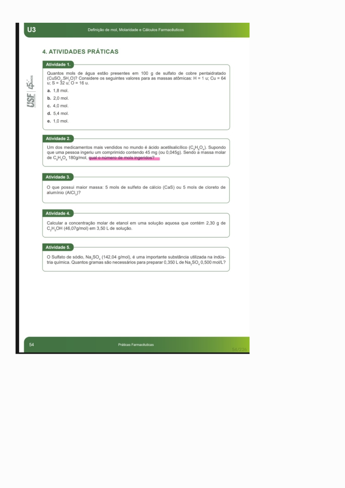 <p>U3 Definição de Molaridade e Cálculos Farmacêuticos 4. ATIVIDADES PRÁTICAS Atividade 1. Quantos mols de água estão presentes em 100 g de sulfato de cobre pentaidratado Considere os seguintes valores para as massas atômicas: Cu = 64 S = 32 = 16 u. a. 1,8 mol. b. 2,0 mol. 4,0 mol. d. 5,4 mol. e. 1,0 mol. Atividade 2. Um dos medicamentos mais vendidos no mundo é ácido acetilsalicílico Supondo que uma pessoa ingeriu um comprimido contendo 45 mg (ou 0,045g). Sendo a massa molar de 180g/mol, qual número de mois ingeridos? Atividade 3. que possui maior massa: 5 mols de sulfeto de cálcio (CaS) ou 5 mols de cloreto de alumínio Atividade 4. Calcular a concentração molar de etanol em uma solução aquosa que contém 2,30 g de (46,07g/mol) em 3,50 L de solução. Atividade 5. Sulfato de g/mol), é uma importante substância utilizada na tria Quantos gramas são necessários para preparar L de 0,500 mol/L? 54 Práticas Farmacêuticas 54/226</p><p>/ / = 271106.5 = = massa M= m 2.30g M= 2.30g MM 142,049 m (g) M=0, M.M.V m 0,350L 24,85g / / do 0.04.16 64 total = a tris sog do 100g 500 n=2 Em 2 mals de H2O 250 2- do 45mg 0,045g n= (g) EVELYN VICTORIA PINTO DE BRITO\ RA202423757 2SEM\ FARMÁCIA</p>