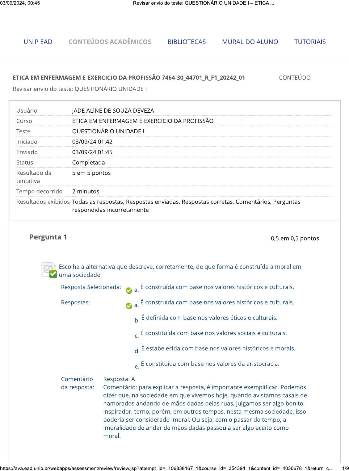<p>03/09/2024, 00:45 Revisar envio do teste: QUESTIONÁRIO UNIDADE ETICA UNIP EAD CONTEÚDOS ACADÊMICOS BIBLIOTECAS MURAL DO ALUNO TUTORIAIS ETICA EM ENFERMAGEM E EXERCICIO DA PROFISSÃO 7464-30_44701_R_F1_20242_0 CONTEÚDO Revisar envio do teste: QUESTIONÁRIO UNIDADE Usuário Curso ETICA EM ENFERMAGEM E EXERCICIO DA PROFISSÃO Teste QUESTIONÁRIO UNIDADE Iniciado 03/09/24 01:42 Enviado 03/09/24 01:45 Status Completada Resultado da 5 em 5 pontos tentativa Tempo decorrido 2 minutos Resultados exibidos Todas as respostas, Respostas enviadas, Respostas corretas, Comentários, Perguntas respondidas incorretamente Pergunta 1 0,5 em 0,5 pontos Escolha a alternativa que descreve, corretamente, de que forma é construída a moral em uma sociedade: Resposta Selecionada: É construída com base nos valores históricos e culturais. a. Respostas: É construída com base nos valores históricos e culturais. a. b. É definida com base nos valores éticos e culturais. É constituída com base nos valores sociais e culturais. C. É estabelecida com base nos valores históricos e morais. d. É constituída com base nos valores da aristocracia. e. Comentário Resposta: A da resposta: Comentário: para explicar a resposta, é importante exemplificar. Podemos dizer que, na sociedade em que vivemos hoje, quando avistamos casais de namorados andando de mãos dadas pelas ruas, julgamos ser algo bonito, inspirador, terno, porém, em outros tempos, nesta mesma sociedade, isso poderia ser considerado imoral. Ou seja, com o passar do tempo, a imoralidade de andar de mãos dadas passou a ser algo aceito como moral. 1/9</p><p>03/09/2024, 00:45 Revisar envio do teste: QUESTIONÁRIO UNIDADE - ETICA. Pergunta 2 0,5 em 0,5 pontos Escolha a alternativa que conceitua, corretamente, a ética: Resposta e. Selecionada: Trata-se de uma maneira de lidar com as situações da vida e do modo como estabelecemos as relações com outras pessoas. Respostas: a. Trata-se de uma maneira de lidar com as situações da vida e do modo como estabelecemos as relações com outras classes sociais. b. Trata-se de uma maneira de lidar com as situações temerosas e do modo como estabelecemos as relações com o inimigo. C. Trata-se de uma maneira de lidar com as situações duvidosas e do modo como estabelecemos as relações com uma casta da sociedade. d. Trata-se de uma maneira correta de lidar com as situações ambíguas e do modo como estabelecemos as relações com a sociedade. e. Trata-se de uma maneira de lidar com as situações da vida e do modo como estabelecemos as relações com outras pessoas. Comentário Resposta: E da resposta: Comentário: pode-se considerar a ética como um tipo de postura que se refere a um modo de ser, à natureza da ação humana. Ética é a parte da Filosofia que estuda a moral, pois reflete e questiona as regras morais, compreendendo que a ética, por si só, não avalia se um ato é correto ou incorreto. Quais são as nossas responsabilidades pessoais em uma relação com o outro? Como lidamos com as outras pessoas em sociedade? Uma conduta ética pode ser um tipo de comportamento mediado por princípios e valores morais. Pergunta 3 0,5 em 0,5 pontos Dentre as alternativas a seguir, escolha aquela que estabelece a relação entre a ética e a moral: Resposta Selecionada: C. A ética tem como objeto de estudo a própria moral. 2/9</p><p>03/09/2024, 00:45 Revisar envio do teste: QUESTIONÁRIO UNIDADE - Respostas: Tudo que não é ético, é moral. a. b. A moral se destina à ética. A ética tem como objeto de estudo a própria moral. C. d. A moral tem como objeto de estudo a ética. A ética tem como objetivo a moral e. Comentário da Resposta: C resposta: Comentário: Ética é a parte da Filosofia que estuda a moral, pois reflete e questiona as regras morais, compreendendo que a ética, por si só, não avalia se um ato é correto ou incorreto. Pergunta 4 0,5 em 0,5 pontos Sendo a consciência, um dos fundamentos da ética, escolha a alternativa que melhor descreve o seu conceito:</p><p>03/09/2024, 00:45 Revisar envio do teste: QUESTIONÁRIO UNIDADE ETICA. Resposta b. Selecionada: Consciência é a capacidade de julgar o que é correto e o que não é, de acordo com os valores morais de conhecimento e de sabedoria. Respostas: a. Consciência é a capacidade de julgar o que é não é correto, de acordo com os valores éticos de conhecimento. b. Consciência é a capacidade de julgar o que é correto e o que não é, de acordo com os valores morais de conhecimento e de sabedoria. C. Consciência é a capacidade de escolher o que é correto, de acordo com os valores morais. d. Consciência é a capacidade moral de escolher o que é correto e o que não é. e. Consciência é a capacidade de pensar e escolher o que é correto, e o que não é, de acordo com os seus valores morais. Comentário Resposta: B da resposta: Comentário: sendo racionais, os seres humanos têm a capacidade de sentir a própria identidade, podendo interpretar o presente, o futuro e o passado. Portanto, quanto maior o conhecimento e a paciência para compreender a situação, melhor será o julgamento entre o correto e o não correto, o que deve e o que não deve ser feito, e as consequências dos próprios atos. Pergunta 5 0,5 em 0,5 pontos "Os valores atribuídos diferem, significativamente, entre as pessoas, as sociedades e as populações, diferenciando as tomadas de decisão sobre um mesmo dilema ético." Assim sendo, o enfermeiro, como um profissional que lidera uma equipe, precisa compreender que: Resposta d. Selecionada: A manifestação de uma pessoa ou de um grupo dependerá dos valores atribuídos por eles mesmos, e, dessa forma, a manifestação dependerá de um juízo de valor. Respostas: a. O enfermeiro possui a sua consciência, formada com base em suas experiências construídas no decorrer de sua vida.</p><p>03/09/2024, 00:45 Revisar envio do teste: QUESTIONÁRIO UNIDADE b. Aquele que, por ação ou omissão vol