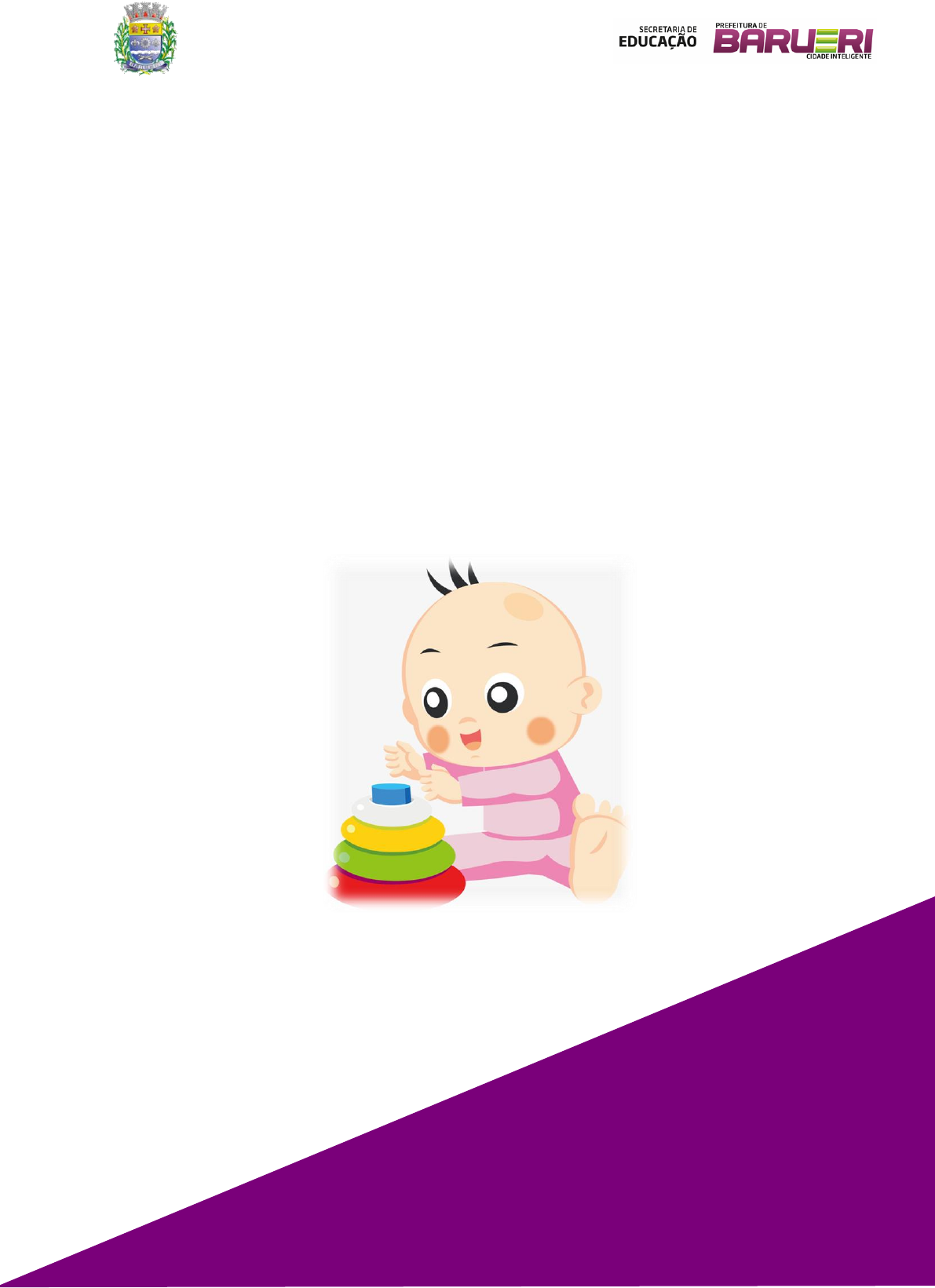 <p>SUGESTÃO DE</p><p>ATIVIDADES</p><p>BERÇÁRIO</p><p>2020</p><p>A IMPORTÂNCIA DA ROTINA NO DESENVOLVIMENTO DAS</p><p>CRIANÇAS</p><p>A rotina é um elemento importante no dia a dia da criança, por dar a elas</p><p>sentimentos de estabilidade e segurança. Também proporciona maior facilidade de</p><p>organização espaço-temporal e a liberta do estresse que uma rotina desestruturada pode</p><p>causar.</p><p>As crianças sentem maior conforto e segurança quando conhecem a rotina do seu</p><p>dia. Assim, elas se habituam à sequência de atividades e têm condições de prever aquilo</p><p>que está por vir.</p><p>Pensando na situação atual e nas orientações que estão sendo divulgadas a todo</p><p>momento pela televisão, rádio e internet sobre a necessidade de ficarmos isolados em</p><p>nossos lares, é importante ressaltar o cuidado de se evitar aglomerações, sendo assim</p><p>tal rotina deve ser aplicada somente às crianças da residência, não reunindo-se com</p><p>amigos, primos e vizinhos.</p><p>Organizar uma rotina eficiente para bebês e crianças pequenas requer a harmonia</p><p>entre o cuidar e o educar. É uma etapa em que são importantes tanto as necessidades</p><p>biológicas, como o sono, a alimentação e a higiene, quanto as afetivas, motoras e</p><p>cognitivas.</p><p>É aconselhável que todos os dias, a rotina do bebê e da criança respeite os</p><p>mesmos horários para:</p><p>– Alimentação;</p><p>– Banho se sol;</p><p>– Momentos de brincar;</p><p>– Hora da história;</p><p>– Hora do banho;</p><p>– Momento do descanso (sonecas durante dia);</p><p>– Hora de dormir.</p><p>Uma boa ideia é criar um quadro com imagens ilustrativas com a rotina diária,</p><p>fixando-o ao alcance da criança.</p><p>ATIVIDADES E BRINCADEIRAS PARA BEBÊS</p><p>Os brinquedos e as brincadeiras, além de serem um meio de distração e de</p><p>entretenimento para as crianças, também são importantes no processo de</p><p>desenvolvimento cognitivo. É, em primeiro lugar, brincando que as crianças</p><p>desenvolvem a memória, a criatividade, o raciocínio e a solução de problemas.</p><p>Consequentemente, é nas brincadeiras que a criança se relaciona com o mundo. E</p><p>o brinquedo é o estimulador da curiosidade e da iniciativa, proporcionando uma</p><p>divertida forma de desenvolvimento da linguagem, do pensamento e da atenção.</p><p>Portanto, simplesmente se jogue, divirta-se e aproveite para programar dias</p><p>incríveis com a família. Vou deixar aqui algumas dicas de brinquedos e brincadeiras</p><p>para a faixa etária.</p><p>HORA DE BRINCAR COM A FAMÍLIA</p><p>✓ BRINCAR COM MOLHO DE CHAVES</p><p>Balance as chaves próximo ao ouvido do bebê.</p><p>Altere um balançar bem baixinho e mais alto das chaves.</p><p>Ofereça brinquedos leves para que possa colocar na</p><p>boca. Móbiles para tocar, chocalhos, bichinhos de</p><p>borracha que produzem sons.</p><p>IMPORTANTE: TODAS AS BRINCADEIRAS DEVEM SER SUPERVISIONADAS</p><p>POR UM ADULTO.</p><p>✓ BASQUETE</p><p>Faça bolas grandes usando papeis velhos e dê para a criança arremessar.</p><p>Você pode fazer uma competição com ela para ver quem consegue jogar a bola</p><p>mais longe. Depois, quando ela se acostumar com a brincadeira, coloque um cesto</p><p>ou caixa grande e peça para tentar acertar com a bola. Além de entretê-la por muito</p><p>tempo, a brincadeira ajuda a desenvolver a força dos braços, a coordenação motora</p><p>e a noção de espaço e distância.</p><p>✓ UM PARA CADA</p><p>Ofereça uma pilha de objetos para a criança (podem ser bolinhas, utensílios</p><p>de cozinha ou peças de montar), peça para que ela os distribua entre vocês dois</p><p>igualmente, colocando na frente de um e do outro.</p><p>.</p><p>✓ TRILHA</p><p>Distribua no chão alguns tapetes pequenos ou faça demarcações com fita</p><p>crepe como se estivessem formando uma trilha e combine com a criança que só é</p><p>permitido andar por esse caminho. Para deixar a brincadeira mais divertida, finja</p><p>que o chão é um lago e que vocês não podem cair nele. A atividade ajuda a</p><p>desenvolver o equilíbrio, a noção de distância e espaço. Vale ressaltar que é</p><p>importante testar antes o caminho para se certificar de que não há perigo de a</p><p>criança escorregar.</p><p>✓ BRINCADEIRAS COM FITAS E TECIDOS</p><p>Com tecidos diversificados, brincar com o bebê, passando-os levemente pelo</p><p>corpo, bem como deixá-lo manusear e explorar livremente.</p><p>✓ BRINCANDO COM MATERIAL NÃO ESTRUTURADO</p><p>Disponibilize diversos potes, garrafas pet, caixas de ovos, caixas de papelão de</p><p>tamanhos diversificados, para que crianças explorem a criatividade e brinquem</p><p>livremente.</p><p>✓ AREIA COMESTÍVEL</p><p>Para nossa areia comestível vamos precisar de:</p><p>8 xícaras de farinha de trigo</p><p>1 copo de óleo</p><p>Corante (opcional)</p><p>Em um pote grande colocar a farinha com o óleo e ir misturando até ter umidade e textura</p><p>de areia, se preferir coloque corante, agora é só deixar o bebê experimentar, criar e</p><p>recriar livremente.</p><p>✓ LEITURA PARA BEBÊS</p><p>Disponibilize livros sensoriais para o seu bebê explorar, nomeie as figuras e conte</p><p>a história de maneira simples.</p><p>✓ MELECA</p><p>Prepare algumas melecas como: sagu cozido, gelatina, macarrão cozido e</p><p>frutas/legumes. Use sua imaginação e permita ao bebê explorar livremente.</p><p>✓ CADÊ? ACHOU!</p><p>Com uma fralda, cobertorzinho ou lenço, esconda o seu rosto e converse com o</p><p>bebê perguntando onde está. Em seguida, descubra seu rosto e diga: achou!</p><p>✓ EXPLORANDO OS SONS</p><p>Oferecer ao bebê um objeto que possibilite a exploração dos sons (panelas,</p><p>latas, potes).</p><p>✓ CESTO DE TESOUROS</p><p>Em um cesto (caixa ou bacia) disponha alguns objetos como: colher de madeira,</p><p>objetos de silicone, bucha de banho, tigelas de inox e