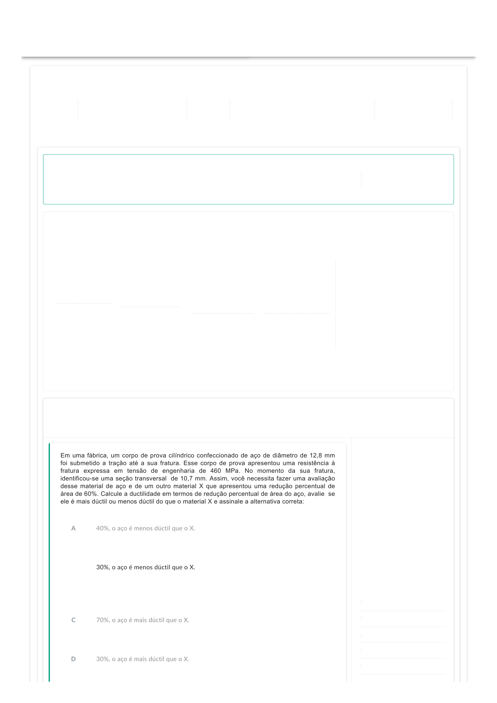 <p>Respostas</p><p>Desempenho do aluno</p><p>AAttiivviiddaaddee 22 ((AA22)) -- QQUUÍÍMMIICCAA GGEERRAALL EE CCIIÊÊNNCCIIAASS DDOOSS MMAATTEERRIIAAIISS -- GGRR22996611</p><p>AAlluunnoo DDiisscciipplliinnaa</p><p>QUÍMICA GERAL E CIÊNCIA DOS MA</p><p>TERIAIS</p><p>PPeerrííooddoo lleett</p><p>iivvoo</p><p>20242</p><p>TTuurrmmaa</p><p>QUÍMICA GERAL E CIÊNCIA DOS MATERIAIS (242G</p><p>GR2961A)</p><p>EEnncceerrrraammeennttoo ddeessttaa aavvaall</p><p>iiaaççããoo</p><p>21/09/2024 23:59:59</p><p>AAvvaalliiaaççããoo ffiinnaalliizzaaddaa</p><p>Resultado final</p><p>AAvvaalliiaaççããoo ffiinnaalliizzaaddaa eemm::</p><p>05/09/2024 17:42:15</p><p>DDeesseemmppeennhhoo rreessuummiiddoo</p><p>Resumo de acertos e erros do aluno</p><p>10 corretas</p><p>Total de</p><p>questões</p><p>corretas</p><p>0 incorretas</p><p>Total de questões</p><p>incorretas</p><p>0 sem</p><p>resposta</p><p>Total de questões</p><p>sem resposta</p><p>0 não</p><p>corrigidas</p><p>Total de questões</p><p>não corrigidas</p><p>ENOC MOREIRA 10 10 10 10,00 10,00</p><p>1100,,0000</p><p>Nota final</p><p>QQuueessttããoo eemm ddeettaallhheess</p><p>Gabarito e respostas das questões</p><p>Gabarito</p><p>1 2 3</p><p>4 5 6</p><p>7 8 9</p><p>10</p><p>Legenda das questões</p><p>Corretas</p><p>Incorretas</p><p>Sem respostas</p><p>Não corrigidas</p><p>Discursivas corrigidas</p><p>Em uma fábrica, um corpo de prova cilíndrico confeccionado de aço de diâmetro de 12,8 mm</p><p>foi submetido a tração até a sua fratura. Esse corpo de prova apresentou uma resistência à</p><p>fratura expressa em tensão de engenharia de 460 MPa. No momento da sua fratura,</p><p>identificou-se uma seção transversal de 10,7 mm. Assim, você necessita fazer uma avaliação</p><p>desse material de aço e de um outro material X que apresentou uma redução percentual de</p><p>área de 60%. Calcule a ductilidade em termos de redução percentual de área do aço, avalie se</p><p>ele é mais dúctil ou menos dúctil do que o material X e assinale a alternativa correta:</p><p>B 30%, o aço é menos dúctil que o X.</p><p>Resposta correta</p><p>A 40%, o aço é menos dúctil que o X.</p><p>C 70%, o aço é mais dúctil que o X.</p><p>D 30%, o aço é mais dúctil que o X.</p><p>Questão anulada</p><p>E</p><p>40%, o aço é mais dúctil que o X.</p><p>Analise o diagrama de fases do sistema de Cobre-Prata que está representado na figura a</p><p>seguir:</p><p>Fonte: Adaptado de CALLISTER Jr., W.D. Fundamentos da Ciência e Engenharia de Materiais.</p><p>7ª Ed. Editora LTC. Rio de Janeiro, 2006, p 254.</p><p>Considerando que alfa e beta são ricas em cobre e prata, respectivamente, analise as</p><p>afirmativas a seguir.</p><p>I. A fase alfa tem ponto de fusão no ponto F e esse diagrama é classificado como eutético.</p><p>II. A composição de cobre na liga a qual apresenta menor temperatura de fusão</p><p>corresponde a 28,1 % Cu.</p><p>III. A quantidade de fase líquida presente na liga a 780 °C, com composição de 20 % de Ag,</p><p>é de aproximadamente 18,8%.</p><p>IV. A solubilidade máxima do cobre na beta é representado no diagrama pelo ponto G.</p><p>Está correto o que se afirma em:</p><p>B II, III e IV, apenas.</p><p>Resposta correta</p><p>A I, II e III, apenas.</p><p>C I e II, apenas.</p><p>D III e IV, apenas.</p><p>E</p><p>II e III, apenas.</p><p>Analise o gráfico a seguir:</p><p>Fonte: Autoria própria (2019).</p><p>É um dever do engenheiro familiarizar-se com as diferentes propriedades mecânicas, saber as</p><p>dimensões e o significados dessas propriedades. Desse modo, esse conhecimento será</p><p>necessário para o projeto de estruturas e componentes que utilizem materiais previamente</p><p>determinados, a fim de que não ocorram níveis inaceitáveis de deformação e/ou falhas.</p><p>Considerando o gráfico tensão deformação, analise as afirmativas a seguir e assinale V para</p><p>a(s) Verdadeira(s) e F para a(s) Falsa(s).</p><p>I. ( ) O material C possui uma maior tensão de ruptura do que o material B.</p><p>II. ( ) O eixo das abscissas é adimensional, ao passo que o eixo das ordenadas representa-</p><p>se por MPa.</p><p>III. ( ) A lei de Hooke é válida para todos os três materiais até o limite de proporcionalidade;</p><p>IV. ( ) O módulo de elasticidade do material A é maior do que o módulo de elasticidade do</p><p>material C. A, então, poderia ser um material cerâmico, enquanto que C poderia ser um</p><p>alumínio (metálico).</p><p>Assinale a alternativa que apresenta a sequência correta:</p><p>C F, V, V, V.</p><p>Resposta correta</p><p>A F, V, F, V.</p><p>B V, V, F, F.</p><p>D V, V, V, F.</p><p>E</p><p>F, V, V, F</p><p>A maioria das estruturas é projetada para certificar que ocorra apenas deformação elástica</p><p>quando uma tensão for submetida. Uma estrutura ou componente que tenha sido deformado</p><p>plasticamente, ou que tenha sofrido mudança permanente em sua forma, pode não ser capaz</p><p>de funcionar como planejado pela equipe de engenharia. Torna-se, por conseguinte, desejável</p><p>conhecer o nível de tensão no qual tem início a deformação plástica, ou no qual ocorre o</p><p>fenômeno chamado escoamento.</p><p>Fonte: Autoria própria</p><p>A respeito do ensaio de tração mostrado no gráfico tensão-deformação, analise as afirmativas</p><p>a seguir e assinale V para a(s) Verdadeira(s) e F para a(s) Falsa(s).</p><p>I. ( ) O ponto A é conhecido como o escoamento do material e há diferença física entre o</p><p>corpo de prova com relação ao ponto B.</p><p>II. ( ) O ponto C corresponde ao limite de resistência à tração.Se essa tensão for aplicada e</p><p>mantida, ocorrerá a fratura do corpo de prova.</p><p>III. ( ) O ponto C apresenta constrição ou empescoçamento e a lei de Hooke é válida apenas</p><p>até esse ponto, conhecido como “ponto máximo”.</p><p>IV. ( ) Entende-se por resistência à fratura o correspondente à tensão no ponto D, isto é,</p><p