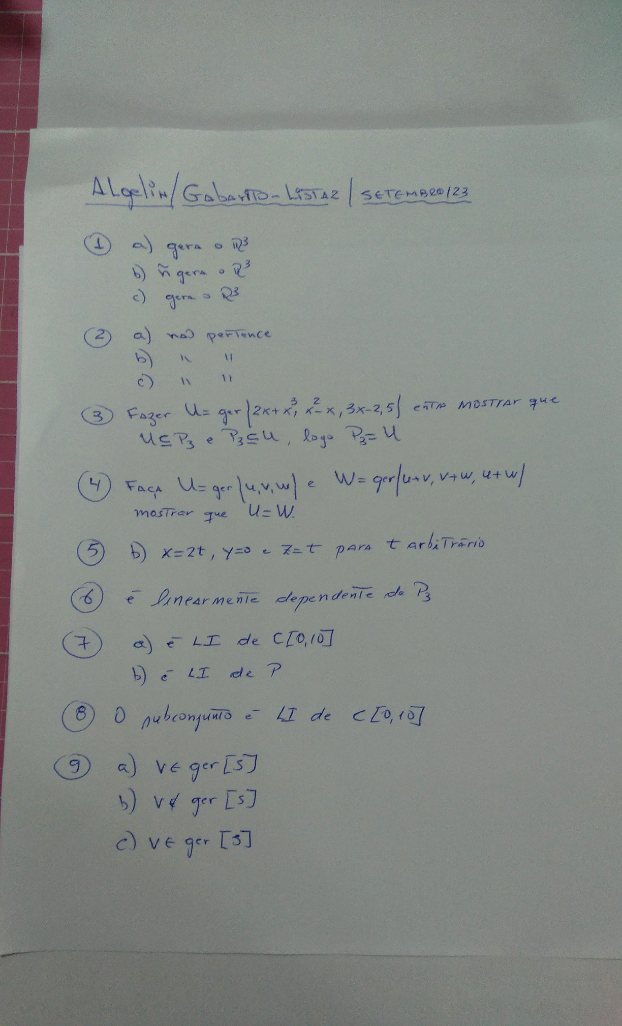 <p>1 a) gera b) c) gera R3 2 a) perTence b) 11 c) 11 3 ger que UEP3 e logo P3= u 4 FACA v+w, w/ que 5 b) x=2t, Z=t t 6 e de P3 7 a) e LI de C[0,10] b) c LI de P 8 0 e- LI de 9 a) VE ger b) ger [s] c) VE ger</p><p>10 be geram P3 11 a) e LI em b) had LI em f) e LI c) e LI dl e LI e) e LI 12 a) d) 2v3 c) LD , vy= 13) u=w 17) 14) a)v= b) now b) Tem solum c) K= 11 pode escrito 5 como C.L. de d) 7a- c) + 2pz (t) + 15) a 18) a) LI. 16) a) b) LD c) LD 11 d) 100 LD TrabAlho LI LI esTe Bons que</p>