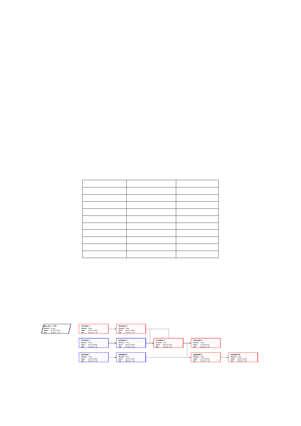 <p>Aluno: Ellem Ferreira do Nascimento</p><p>Matrícula: 20113110298</p><p>Curso: Administração Pública</p><p>Polo: Belford Roxo</p><p>Disc: Elaboração e gestão de projetos</p><p>Responda neste documento as seguintes questões:</p><p>Obs. Elas podem utilizando os aplicativos Project-Libre(gratuito) ou Microsoft Project(pago)</p><p>QUESTÃO 1: Sabendo que as atividades de um determinado projeto possuem as seguintes</p><p>durações e relações de dependências, faça as seguintes questões: (2,5 pts)</p><p>a) Identificar as atividades que apresentam folgas de tempo de execução.</p><p>Atividades 3, 4, 7 e 8.</p><p>b) Identificar as atividades que pertencem ao caminho crítico.</p><p>Atividades 1, 2, 5, 6, 9 e 10.</p><p>c) Calcular o tempo de conclusão planejado.</p><p>Tempo total de 20 dias</p><p>Atividade Duração(dias) Dependências</p><p>Atividade 1 8</p><p>Atividade 2 3 Atividade 1</p><p>Atividade 3 5</p><p>Atividade 4 2 Atividade 3</p><p>Atividade 5 4 Atividades 2 e 4</p><p>Atividade 6 5 Atividades 2 e 5</p><p>Atividade 7 7</p><p>Atividade 8 3 Atividade 7</p><p>Atividade 9 2 Atividades 5 e 8</p><p>Atividade 10 3 Atividade 9</p><p>d) O que aconteceria com o projeto caso o tempo de duração das atividades 5 e 10</p><p>sofresse um acréscimo de 6 dias.</p><p>Tempo total de 32 dias.</p><p>QUESTÃO 2: Sabendo que as atividades de um determinado projeto possuem as seguintes</p><p>durações e relações de dependências, faça as seguintes questões: (2,5 pts)</p><p>a) Identificar as atividades que apresentam folgas de tempo de execução.</p><p>Atividades 2 e 6</p><p>b) Identificar as atividades que pertencem ao caminho crítico.</p><p>Atividades 1, 3, 4, 5, 7, 8, 9 e 10.</p><p>c) Calcular o tempo de conclusão planejado.</p><p>Tempo total de 47 dias.</p><p>Atividade Duração(dias) Dependências</p><p>Atividade 1 8</p><p>Atividade 2 9 Atividade 1</p><p>Atividade 3 7 Atividade 1</p><p>Atividade 4 6 Atividade 3</p><p>Atividade 5 4 Atividades 2 e 4</p><p>Atividade 6 4 Atividade 1</p><p>Atividade 7 7 Atividades 2 e 5</p><p>Atividade 8 8 Atividade 7</p><p>Atividade 9 2 Atividades 5 e 8</p><p>Atividade 10 5 Atividade 9</p><p>Página 1</p><p>Página 2</p><p>Página 3</p>