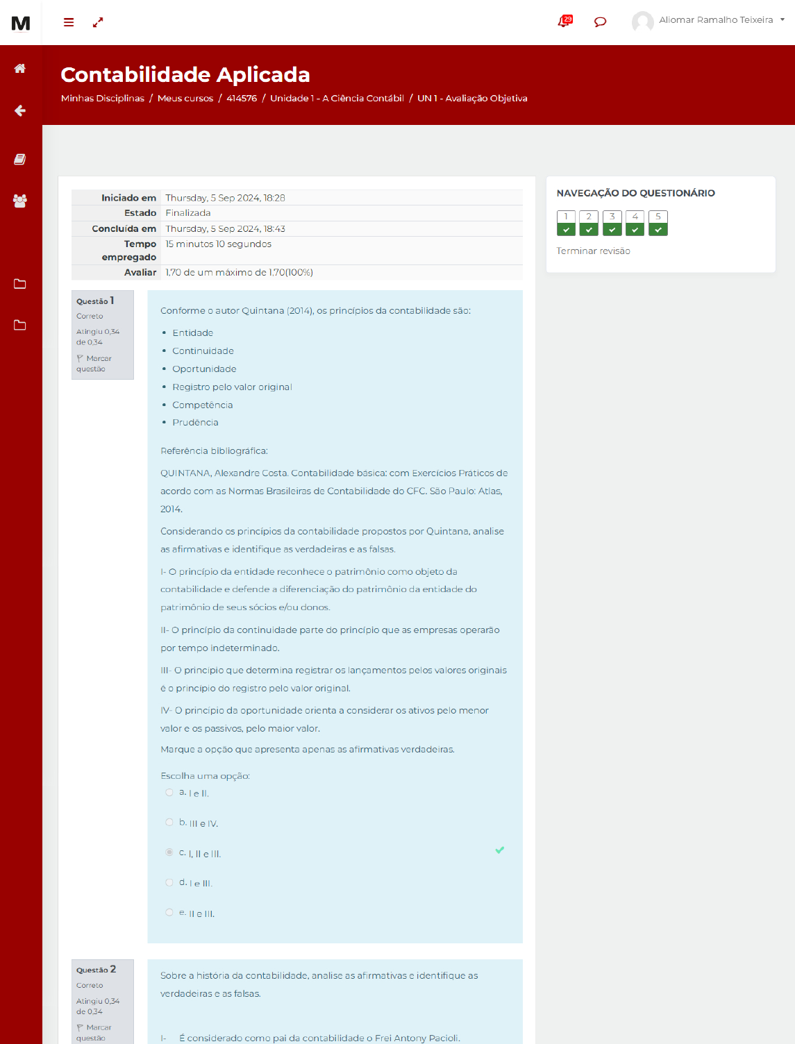 <p>M Aliomar Ramalho Teixeira Contabilidade Aplicada Minhas Disciplinas / Meus cursos / 414576 / Unidade 1 A Ciência Contábil / UN 1 Avaliação Objetiva Iniciado em Thursday, 5 Sep 2024, 18:28 NAVEGAÇÃO DO QUESTIONÁRIO Estado Finalizada 1 2 3 4 5 Concluída em 5 Sep 2024, 18:43 Tempo 15 minutos 10 segundos Terminar revisão empregado Avaliar 1,70 de um máximo de 1,70(100%) Questão 1 Conforme o autor Quintana (2014), os princípios da contabilidade são: Correto Atingiu Entidade de Continuidade P Marcar questão Oportunidade Registro pelo valor original Competência Prudência Referência QUINTANA, Alexandre Costa. Contabilidade básica: com Exercícios Práticos de acordo com as Normas Brasileiras de Contabilidade do São Paulo: Atlas, 2014. Considerando os princípios da contabilidade propostos por Quintana, analise as afirmativas e identifique as verdadeiras e as princípio da entidade reconhece o patrimônio como objeto da contabilidade e defende a diferenciação do patrimônio da entidade do patrimônio de seus sócios e/ou donos. princípio da continuidade parte do princípio que as empresas operarão por tempo indeterminado. III- princípio que determina registrar os lançamentos pelos valores originais é o princípio do registro pelo valor original. IV- princípio da oportunidade orienta a considerar os ativos pelo menor valor e os passivos, pelo maior valor. Marque a opção que apresenta apenas as afirmativas Escolha uma opção: a. II. b. III e IV. C. III. d. III. e. Questão 2 Sobre a história da contabilidade, analise as afirmativas e identifique as Correto verdadeiras e as Atingiu de 0,34 Marcar questão É considerado como pai da contabilidade o Frei Antony Pacioli.</p><p>II- A contabilidade possui duas vertentes de ensino: a Escola Italiana de Contabilidade e a Escola Americana de III- A contabilidade é uma ciência exata. IV- objeto de estudo da contabilidade é o patrimônio. Marque a opção que apresenta somente as afirmativas Escolha uma opção: a. III b. III e IV C. e d. III e. e IV Questão 3 Correto Segundo Quintana (2014), profissional de contabilidade pode atuar em Atingiu diversas destacando-se as seguintes: de Auditor Independente Marcar questão Professor III- Dono de escritório de contabilidade Planejador Referência bibliográfica: QUINTANA, Alexandre Costa. Contabilidade básica: com Exercícios Práticos de acordo com as Normas Brasileiras de Contabilidade do CFC. São Paulo: Atlas, 2014. Entre as atuações listadas, quais não podem ser realizadas pelo técnico contábil? Escolha uma opção: a. Apenas a b. e IV. C. e IV. d. e II. e. III. Questão 4 contador tem por atribuição a escrituração dos livros contábeis Correto obrigatórios, elaboração de balanço patrimonial e demais demonstrações, Atingiu 0.34 de perícias judiciais ou extrajudiciais, assistência ao Conselho Fiscal das Marcar Sociedades Anônimas ou qualquer outra atribuição que lhe seja conferida por questão lei. Além dessas atribuições, contador tem alguns deveres. Avalie as afirmativas que seguem. contador deve seguir o Código de Ética aprovado pela Resolução CFC n° 803/96 e posterior alteração pela Resolução CFC II- contador deve exercer sua profissão com zelo, honestidade e capacidade</p><p>III- Os profissionais em contabilidade devem seguir as Normas Brasileiras de Contabilidade e aplicar os Princípios Contábeis conforme a necessidade da empresa. IV- contador deve guardar sigilo das informações exceto nos casos previstos em lei, inteirar-se dos acontecimentos antes de emitir um parecer, ajudar na fiscalização do exercício profissional, cumprir programas obrigatórios de educação continuada estabelecidos pelo CFC, entre outras obrigações. Marque a opção que apresenta somente as afirmativas Escolha uma opção: a. e IV b. e C. e IV d. e IV e. e III Questão 5 Correto Conforme Quintana (2014), o princípio da entidade reconhece o patrimônio Atingiu 0,34 como objeto da contabilidade e afirma a autonomia patrimonial e a de 0,34 necessidade da diferenciação de um patrimônio particular do universo dos Marcar questão existentes, indepentemente de pertencer a uma pessoa, um conjunto de pessoas, uma sociedade ou instituição de qualquer natureza ou finalidade, com ou sem fins Referência bibliográfica: QUINTANA, Alexandre Costa. Contabilidade básica: com Exercícios Práticos de acordo com as Normas Brasileiras de Contabilidade do CFC. São Paulo: Atlas, 2014. Diante do exposto, avalie as A empresa DeltaHP comprou uma impressora que não fazia Percebendo a necessidade dessa função, comprou um novo equipamento. Com a chegada deste, a impressora que não faz fotocópias ficou sem uso na empresa. Vendo isso, sócio a levou para sua casa e deu para sua filha imprimir trabalhos escolares. II- sócio recebeu da empresa um cartão para arcar com os gastos de suas refeições nos dias de Ele cedeu esse cartão a seu filho para que ele lanchasse na Como sócio ficou sem cartão para as refeições, ele as paga com seu cartão de crédito particular. III- sócio abastece seu veículo particular com o cartão corporativo da empresa. IV- A equipe de manutenção elétrica da empresa trabalhou no apartamento de um dos sócios, depois do horário de trabalho, acarretando em horas extras. Marque a opção que apresenta as afirmativas que desrespeitam o princípio da Escolha uma opção: a. e IV. b. III e IV. C. II. d. II, III e IV.</p><p>e. III. Terminar revisão - Conteúdo Online Seguir para Conteúdo Online - MOODLE BY ITVIX</p>