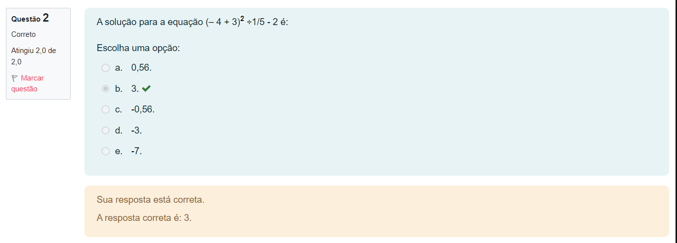 <p>Questão 2 A solução para a equação (- 4 + 3)2 - - 2 é: Correto Atingiu 2,0 de Escolha uma opção: 2,0 a. 0,56. P Marcar questão b. 3. C. -0,56. d. -3. e. -7. Sua resposta está correta. A resposta correta é: 3.</p>