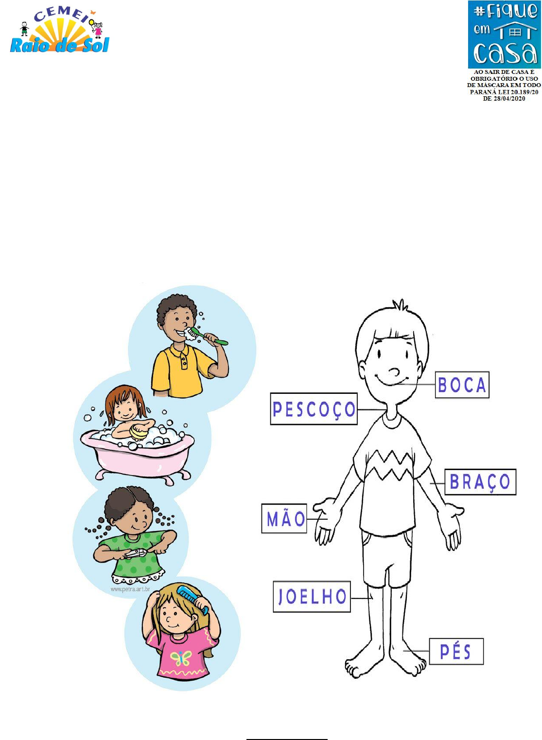 <p>CENTRO MUNICIPAL DE EDUCAÇÃO INFANTIL RAIO DE SOL</p><p>Av. Nilo Humberto Deitos, 1740 – São Cristóvão – Fone: (45) 3266-2022</p><p>Céu Azul – CEP: 85.840-000</p><p>2º CADERNO DE ATIVIDADES</p><p>EDUCAÇÃO INFANTIL – 0 A 3 ANOS (CRECHE) MATERNAL I</p><p>PERÍODO DE REALIZAÇÃO DAS ATIVIDADES: DE 15/03/2021 A 26/03/2021</p><p>ALUNO:__________________________________________________________MATERNAL I____</p><p>PROFESSOR(A):______________________________________________________________________</p><p>HIGIENE E IMAGEM CORPORAL</p><p>CÉU AZUL 2021</p><p>ATIVIDADE 01</p><p>DATA 15/03/2021 SEGUNDA-FEIRA.</p><p>-CAMPO DE EXPERIÊNCIA:</p><p> CORPO, GESTOS E MOVIMENTOS.</p><p>-SABERES E CONHECIMENTOS:</p><p> PRÁTICAS SOCIAIS RELATIVAS A HIGIENE.</p><p>-CONTEÚDOS:</p><p> PRÁTICAS DE HIGIENE.</p><p>-OBJETIVOS DE APRENDIZAGEM E DESENVOLVIMENTO: (EI01CG04).</p><p> PARTICIPAR DE MOMENTOS COMO: LIMPAR-SE, LAVAR AS MÃOS, VESTIR-SE, ALIMENTAR-</p><p>SE E CALÇAR, SOLICITANDO AJUDA.</p><p>SUGESTÃO DE ATIVIDADE: ASSISTIR AO VÍDEO: “TOMAR BANHO (BATH SONG) – MÚSICA</p><p>INFANTIL”.</p><p>https://youtu.be/sDIL8o4rjY0</p><p>- NO MOMENTO DO BANHO, CONVERSAR SOBRE A IMPORTÂNCIA DA REALIZAÇÃO DA HIGIENE</p><p>CORPORAL. NOMEAR AS PARTES DO CORPO, PEDIR PARA QUE A CRIANÇA IDENTIFIQUE-AS.</p><p>EX.: VAMOS LAVAR OS PÉS? CADÊ O PÉ? VAMOS LAVAR ATRÁS DAS ORELHAS? CADÊ A</p><p>ORELHA?</p><p>https://youtu.be/sDIL8o4rjY0</p><p>ATIVIDADE 02</p><p>DATA 16/03/2020 TERÇA-FEIRA.</p><p>-CAMPO DE EXPERIÊNCIA:</p><p> ESPAÇO, TEMPOS, QUANTIDADES, RELAÇÕES E TRANSFORMAÇÕES.</p><p>-SABERES E CONHECIMENTOS:</p><p> TEXTURA, MASSA E TAMANHO DOS OBJETOS.</p><p>-CONTEÚDOS:</p><p> TEXTURA: ÁSPERO/LISO/MACIO.</p><p>-OBJETIVOS DE APRENDIZAGEM E DESENVOLVIMENTO: (EI01ET01).</p><p> OBSERVAR OS ATRIBUTOS DOS OBJETOS POR MEIO DA EXPLORAÇÃO: GRANDE/</p><p>PEQUENO, ÁSPERO/LISO/MACIO, QUENTE/FRIO, PESADO/LEVE, DENTRE OUTRAS</p><p>POSSIBILIDADES.</p><p>SUGESTÃO DE ATIVIDADE: COLOCAR EM UM RECIPIENTE, PRODUTOS E OBJETOS UTILIZADOS</p><p>NA HIGIENE PESSOAL (ESCOVA, SABONETE, ESPONJA, TOALHA, ...) PERMITIR O MANUSEIO</p><p>LIVRE PARA QUE A CRIANÇA PERCEBA AS DIFERENTES TEXTURAS DOS OBJETOS E APÓS</p><p>EXPLICAR A UTILIDADE DE CADA UM.</p><p>EX.: QUAL DESSES USAMOS PARA LAVAR OS CABELOS? QUAL DELES USAMOS PARA ESCOVAR</p><p>OS DENTES? ETC...</p><p>OBS.: USE PREFERENCIALMENTE FRASCOS VAZIOS E LIMPOS.</p><p>ATIVIDADE 03</p><p>DATA 17/03/2021 QUARTA-FEIRA.</p><p>-CAMPO DE EXPERIÊNCIA:</p><p> ESCUTA, FALA, PENSAMENTO E IMAGINAÇÃO.</p><p>-SABERES E CONHECIMENTOS:</p><p> EXPRESSIVIDADE PELA LINGUAGEM ORAL E GESTUAL.</p><p>-CONTEÚDOS:</p><p> RELATOS DE EXPERIÊNCIAS VIVIDAS.</p><p>-OBJETIVOS DE APRENDIZAGEM E DESENVOLVIMENTO (EI01EF05):</p><p> EXPRESSAR-SE POR MEIO DE PALAVRAS TRANSMITINDO SUAS NECESSIDADES,</p><p>DESEJOS, SENTIMENTOS E PERCEPÇÃO DE MUNDO EM RELAÇÃO ÀS HISTÓRIAS</p><p>OUVIDAS DE RECURSOS AUDIOVISUAIS OBSERVADAS.</p><p>SUGESTÃO DE ATIVIDADE: ASSISTIR AO VÍDEO SOBRE HIGIENE BUCAL: “XIC, XIC, XIC – MUNDO</p><p>BITA”.</p><p>https://youtu.be/cnzgHAIRqmc</p><p>- OBSERVE AS IMAGENS ABAIXO E INCENTIVE A CRIANÇA A APONTAR OS HÁBITOS DE HIGIENE</p><p>SOLICITADOS. EX.: QUAL DESENHO TEM A CRIANÇA TOMANDO BANHO? ONDE ESTÁ O BEBÊ</p><p>ESCOVANDO OS DENTES?</p><p>https://youtu.be/cnzgHAIRqmc</p><p>REPOST@DRAMARTACLIVATI.</p><p>POR QUE AS ROTINAS SÃO IMPORTANTES?</p><p>SABEMOS QUE, NA PRÁTICA, NÃO É SIMPLES ESTABELECER UMA ROTINA NA VIDA DOS</p><p>FILHOS, AINDA MAIS COM A CORRERIA DO DIA A DIA, HORÁRIOS IRREGULARES E A FALTA</p><p>DE TEMPO. NO ENTANTO, É MUITO IMPORTANTE QUE A FAMÍLIA ADOTE ALGUNS HÁBITOS</p><p>E REGRAS NO COTIDIANO DAS CRIANÇAS. A ROTINA COLABORA PARA QUE A CRIANÇA</p><p>CRESÇA MAIS CONFIANTE E INDEPENDENTE. SABER O QUE VAI ACONTECER DURANTE O</p><p>DIA E A REPETIÇÃO DESTES ACONTECIMENTOS FAZ COM QUE OS PEQUENOS SE SINTAM</p><p>CONFORTÁVEIS E SEGUROS, ALÉM DE DIMINUIR A ANSIEDADE.</p><p>PARA OS PAIS AS ROTINAS PREESTABELECIDAS TAMBÉM TRAZEM MUITOS BENEFÍCIOS.</p><p>PRIMEIRO, PORQUE, POR SE SENTIREM MAIS SEGUROS, OS PEQUENOS TENDEM A</p><p>ACEITAR MELHOR OS MOMENTOS DE DESPEDIDAS. QUANDO MAIORES, TORNAM-SE</p><p>CRIANÇAS E ADOLESCENTES COM MAIOR SENSO DE ORGANIZAÇÃO E</p><p>RESPONSABILIDADE, CONSEGUINDO ESTABELECER OS HORÁRIOS DE ESTUDOS E DE</p><p>OBRIGAÇÕES, COMO AJUDAR A FAMÍLIA NAS ATIVIDADES DA CASA. ALÉM DISSO, AS</p><p>ROTINAS TAMBÉM COLABORAM NA ORGANIZAÇÃO DA VIDA DOS PAIS. TER HORÁRIOS</p><p>ESTABELECIDOS PARA AS REFEIÇÕES, SONECAS, BANHO E BRINCADEIRAS, FAZ COM QUE</p><p>A FAMÍLIA TODA POSSA SE ORGANIZAR MELHOR E TENHA MAIS TEMPO PARA</p><p>APROVEITAR OS MOMENTOS JUNTOS.</p><p>É IMPORTANTE LEMBRAR QUE O EXCESSO NUNCA É BOM! É PRECISO SABER A HORA DE</p><p>SER FLEXÍVEL PARA QUE A ROTINA NÃO SE TORNE ALGO IMPOSTO E NEGATIVO. NOS</p><p>FINAIS DE SEMANA, POR EXEMPLO, É LIBERADO DORMIR UMAS HORINHAS A MAIS OU</p><p>ALMOÇAR MAIS TARDE. O IMPORTANTE É ESTABELECER HORÁRIOS E CRIAR HÁBITOS</p><p>SAUDÁVEIS QUE TORNEM O AMBIENTE MAIS ORGANIZADO E CONFORTÁVEL PARA TODOS!</p><p>#SAUDEDACRIANÇA#PAISEFILHOS#ROTINADACRIANÇA#NERUOLOGIAINFATIL#HABITOSSA</p><p>UDAVEIS#NEUROPEDIATRIA</p><p>FONTE: FACEBOOK MARTA CLIVATI</p><p>ATIVIDADE 04</p><p>DATA 18/03/2021 QUINTA-FEIRA</p><p>-CAMPO DE EXPERIÊNCIA:</p><p> O EU, O OUTRO E O NÓS.</p><p>-SABERES E CONHECIMENTOS:</p><p> NORMAS (COMBINADOS) DE CONVÍVIO SOCIAL.</p><p>-CONTEÚDOS:</p><p> ATIVIDADES DA VIDA COTIDIANA.</p><p>-OBJETIVOS DE APRENDIZAGEM E DESENVOLVIMENTO (EI01EO06):</p><p> ADAPTAR-SE À ROTINA, CONHECENDO SEUS PARES E O ESPAÇO DE CONVIVÊNCIA.</p><p> VIVENCIAR COMBINADOS DE CONVÍVIO SOCIAL EM MOMENTOS DE ALIMENTAÇÃO,</p><p>CUIDADO COM A SAÚDE E BRINCADEIRAS.</p><p>SUGESTÃO DE ATIVIDADE: LEIA O TEXTO ABAIXO FEITO PELA DRA. MARTA CLIVATI FALANDO</p><p>SOBRE A IMPORTANCIA DAS ROTINAS.</p><p>- PROCUREM ESTABELECER UMA ROTINA DA FAMÍLIA E TRABALHAR COM A CRIANÇA