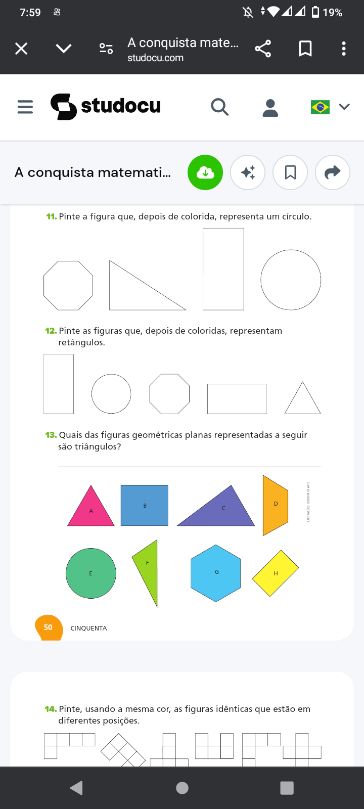 <p>7:59 8g 11 19% X V A conquista mate... studocu.com studocu A conquista 11. Pinte a figura que, depois de colorida, representa um círculo. 12. Pinte as figuras que, depois de coloridas, representam retângulos. 13. Quais das figuras geométricas planas representadas a seguir são triângulos? - D A F E G H 50 CINQUENTA 14. Pinte, usando a mesma cor, as figuras idênticas que estão em diferentes posições.</p>