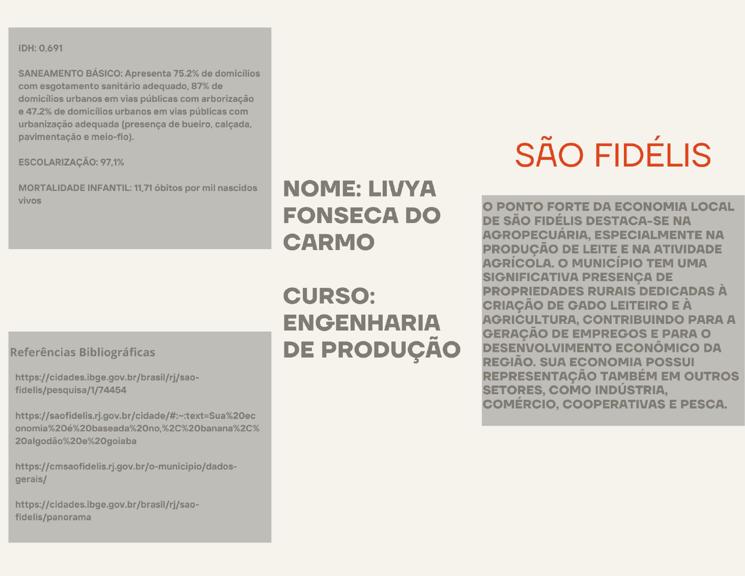 <p>IDH: 0,691 SANEAMENTO BÁSICO: Apresenta 75.2% de domicílios com esgotamento sanitário adequado, 87% de domicílios urbanos em vias públicas com arborização e 47.2% de domicílios urbanos em vias públicas com urbanização adequada (presença de bueiro, pavimentação e meio-fio). ESCOLARIZAÇÃO: 97,1% SÃO FIDÉLIS MORTALIDADE INFANTIL: 11,71 óbitos por mil nascidos NOME: LIVYA vivos PONTO FORTE DA ECONOMIA LOCAL FONSECA DO DE SÃO FIDÉLIS DESTACA-SE NA CARMO AGROPECUÁRIA, ESPECIALMENTE NA PRODUÇÃO DE LEITE E NA ATIVIDADE MUNICÍPIO TEM UMA SIGNIFICATIVA PRESENÇA DE CURSO: PROPRIEDADES RURAIS DEDICADAS À CRIAÇÃO DE GADO LEITEIRO E À ENGENHARIA AGRICULTURA, CONTRIBUINDO PARA A GERAÇÃO DE EMPREGOS E PARA Referências Bibliográficas DE PRODUÇÃO DESENVOLVIMENTO ECONÔMICO DA REGIÃO. SUA ECONOMIA POSSUI https://cidades.ibge.gov.br/brasil/rj/sao- REPRESENTAÇÃO TAMBÉM EM OUTROS fidelis/pesquisa/1/74454 SETORES, COMO COMÉRCIO, COOPERATIVAS E PESCA. https://cmsaofidelis.rj.gov.br/o-municipio/dados- gerais/ https://cidades.ibge.gov.br/brasil/rj/sao- fidelis/panorama</p><p>PIB per capita: 802,8 milhões APRESENTAÇÃO DO MUNICÍPIO PIB: 20. 738,50 São Fidélis a cidade poema Salário médio mensal dos trabalhadores formais: 1,6 salários Fundação da cidade: 27 de setembro de 1781 mínimos Emancipação: 3 de dezembro de 1870 Percentual da população com SECRETARIA MUNICIPAL DE EDUCAÇÃO rendimento nominal mensal per capita Gentílico: Fidelense de até 1/2 salário mínimo: 35,1% Prefeito Atual: Amarildo Henrique Alcântara SECRETARIA MUNICIPAL DE SAÚDE CARACTERÍSTICAS GEOGRÁFICAS: SÃO FIDÉLIS INDICADORES SOCIAIS Área: 1.034,833 1 Taxa de Alfabetização Funcional: Conceito: A taxa de alfabetização funcional em São Fidélis refere-se à porcentagem da população que possui População: 38.961 pessoas habilidades de leitura e escrita adequadas para participar plenamente na sociedade, indo além da simples capacidade de decifrar palavras. Densidade: 37,65 Características: Este indicador destaca compromisso do município com a educação de qualidade, proporcionando à população as habilidades necessárias para uma participação efetiva na sociedade. 2. Taxa de Empregabilidade Jovem: Conceito: A taxa de empregabilidade jovem em São Fidélis avalia a proporção de jovens em idade de trabalho que estão empregados, indicando a eficácia do município em integrar os jovens no mercado de trabalho. Características: Este indicador ilustra a capacidade de INDICADORES ECONÔMICOS São Fidélis em criar oportunidades de emprego para a Produto Interno Municipal (PIM): contribuindo não apenas para Conceito: PIM de São Fidélis representa o valor total de desenvolvimento mas também para a bens e serviços produzidos dentro do município durante um inserção dos jovens na vida profissional. determinado E um indicador-chave da atividade econômica Características: Reflete a contribuição direta das atividades econômicas, incluindo agropecuaria e pequenos negócios, para o desenvolvimento econômico do aporte de financiamento da ONU para São Fidélis é crucial devido a diversos fatores. observamos a forte do município na agropecuária e pequenos negócios locais, setores fundamentais para a economia. 2. Índice de Diversificação Econômica: financiamento pode ser direcionado para modernização capacitação de Conceito: Este índice avalia a variedade de setores agricultores e estímulo à diversificação visando aumentar a econômicos presentes em São buscando reduzir a resiliência frente a Além São Fidélis demonstra compromisso com indicadores sociais. como vulnerabilidade a choques específicos em determinadas a taxa de alfabetização e a empregabilidade jovem. financiamento da ONU poderia fortalecer programas educacionais, incentivar iniciativas de formação Características: Destaca a importância de não depender profissional para jovens e apoiar projetos que promovam igualdade de exclusivamente de um setor. promovendo a resiliência oportunidades Considerando a visita da equipe da ONU aos municípios brasileiros com até 50 econômica diante de mudanças nas condições do mercado. mil habitantes. o aporte financeiro em São pode ser estratégico para catalisar desenvolvimento local, abordando lacunas identificadas em indicadores econômicos e sociais. Ao investir nesses aspectos. a ONU para fortalecer a base melhorar a qualidade de vida da população e promover um desenvolvimento sustentável em São</p>