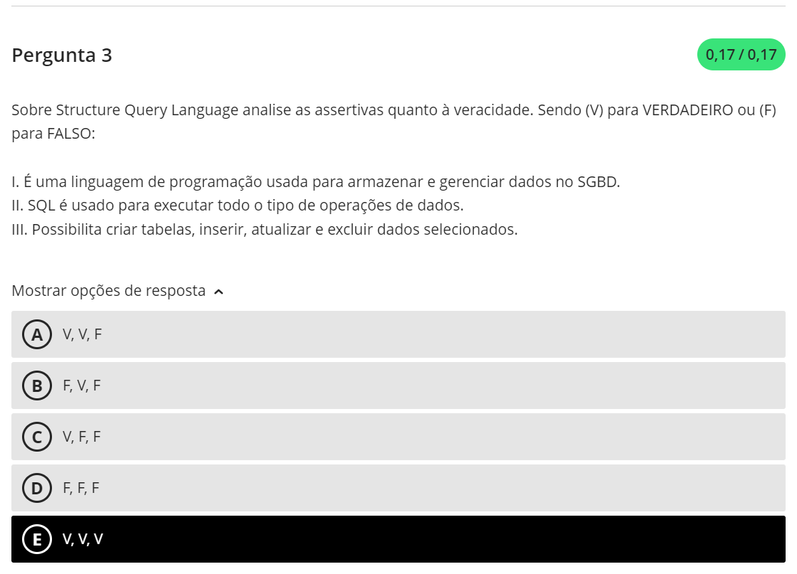 <p>Pergunta 3 Sobre Structure Query Language analise as assertivas quanto à veracidade. Sendo (V) para VERDADEIRO ou (F) para FALSO: I. É uma linguagem de programação usada para armazenar e gerenciar dados no SGBD. II. SQL é usado para executar todo o tipo de operações de dados. III. Possibilita criar tabelas, inserir, atualizar e excluir dados selecionados. Mostrar opções de resposta ^ A V, V, F B F, V, F V, F, F D F, F, F E V, V, V</p>