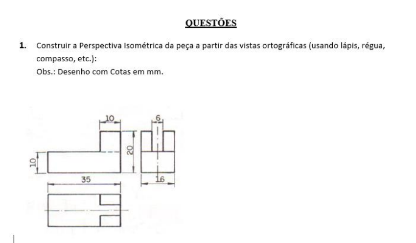 <p>QUESTÕES 1. Construir a Perspectiva Isométrica da peça a partir das vistas ortográficas (usando lápis, régua, compasso, etc.): Obs.: Desenho com Cotas em mm. 10 6 35 16 I</p><p>I 20 16 35 Escala 1 : 5</p><p>2. Construir a Perspectiva Isométrica da peça dada manualmente (usando lápis, régua, compasso, etc.): Obs.: Desenho com Cotas em mm. 50</p>