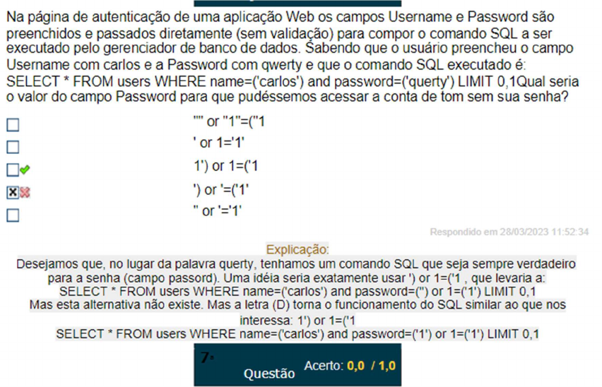 <p>Na página de autenticação de uma aplicação Web os campos Username e Password são preenchidos e passados diretamente (sem validação) para compor o comando SQL a ser executado pelo gerenciador de banco de dados. Sabendo que o usuário preencheu o campo Username com carlos e a Password com e que o comando SQL executado SELECT * FROM users WHERE name=('carlos') and password=('querty') LIMIT 0,1Qual seria o valor do campo Password para que pudéssemos acessar a conta de tom sem sua senha? or "1"=("1 or 1') or 1=('1 Respondido em 28/03/2023 11:52:34 Explicação: Desejamos que, no lugar da palavra querty, tenhamos um comando SQL que seja sempre verdadeiro para a senha (campo passord). Uma idéia seria exatamente usar') or que levaria a: SELECT * FROM users WHERE name=('carlos') and password=(") or 1=('1') LIMIT Mas esta alternativa não existe. Mas a letra (D) torna funcionamento do SQL similar ao que nos interessa: 1') or 1=('1 SELECT * FROM users WHERE name=('carlos') and password=('1') or 1=('1') LIMIT 0,1 7 Acerto: 0,0 / 1,0 Questão</p>